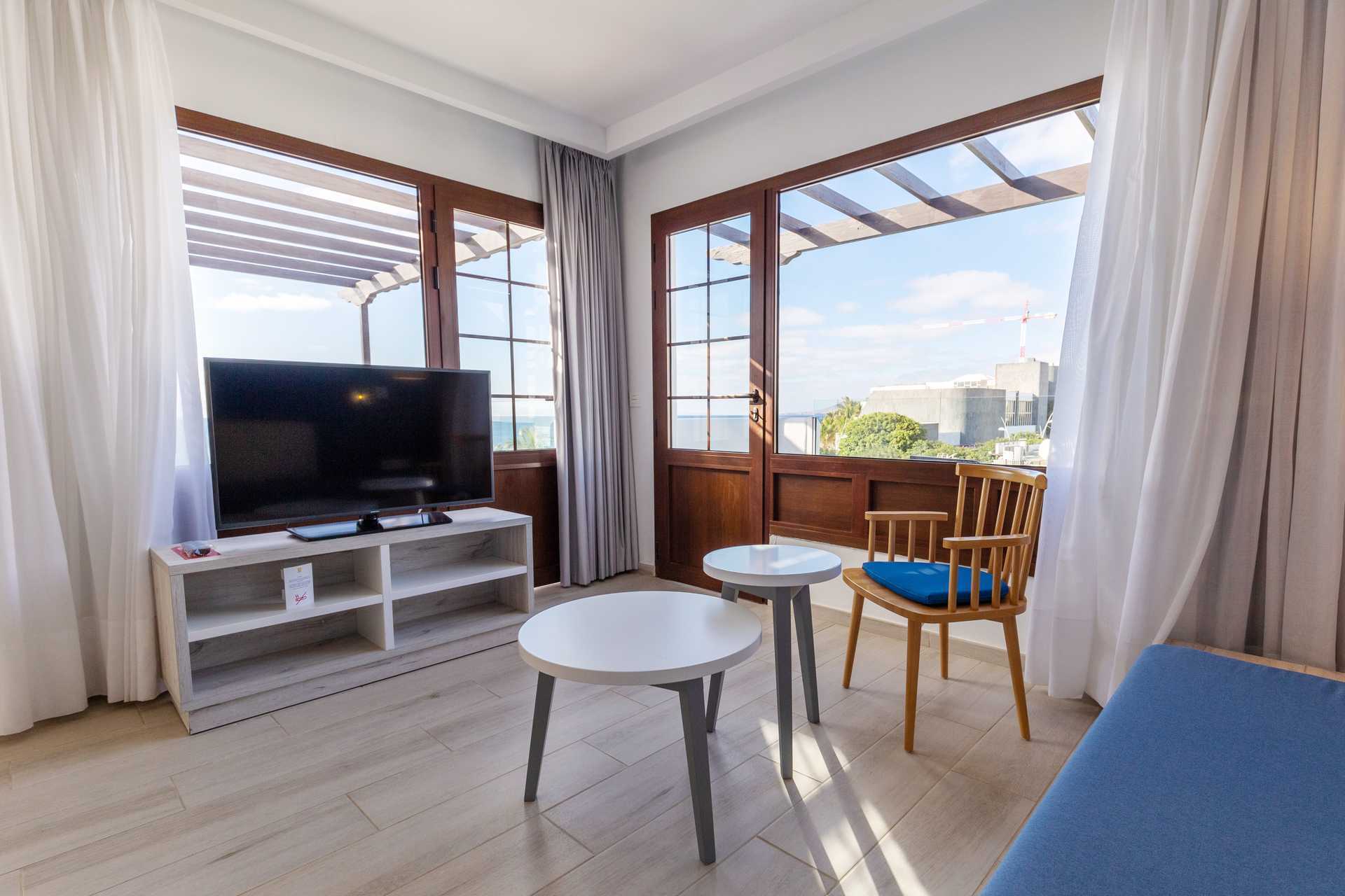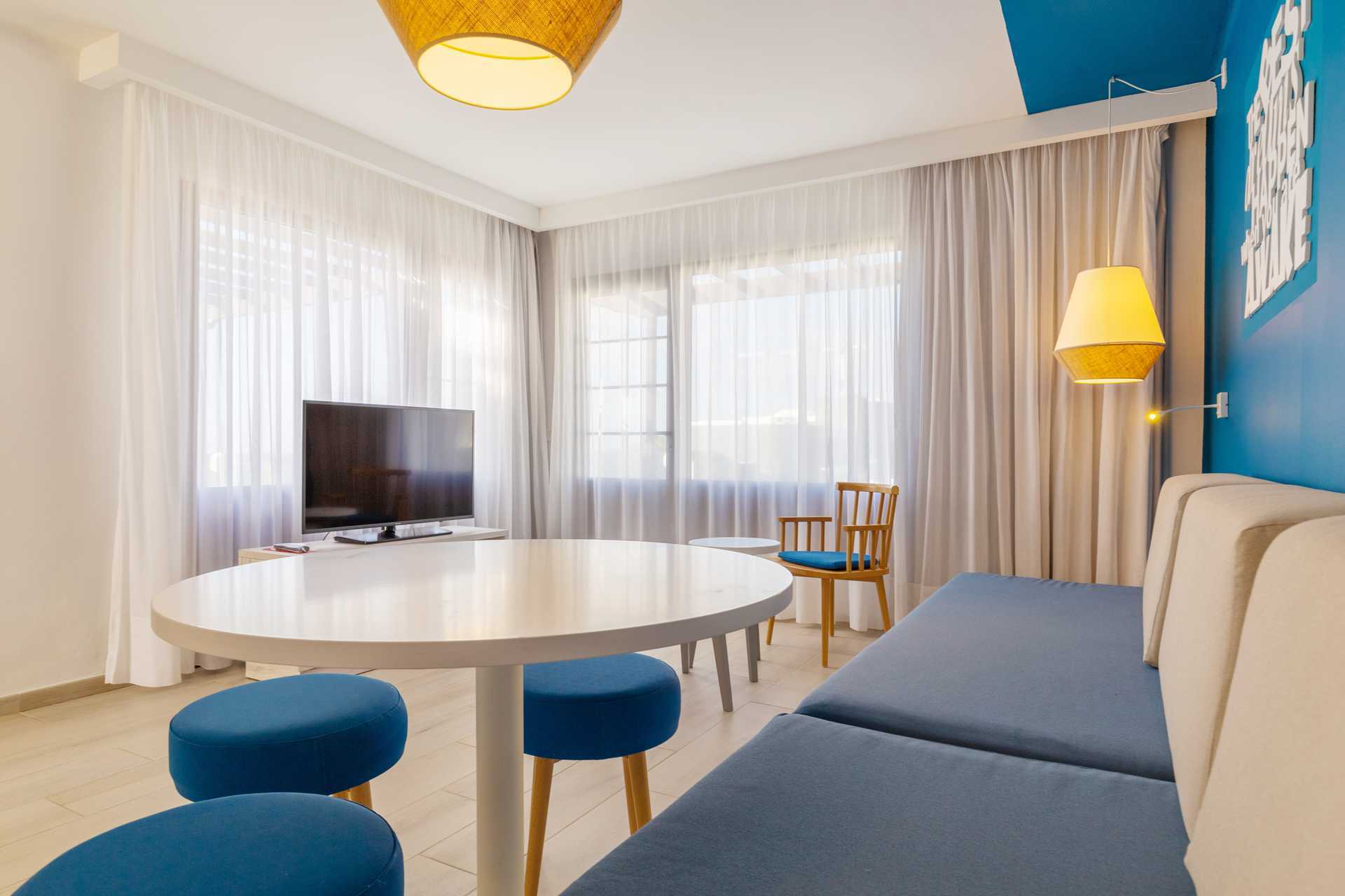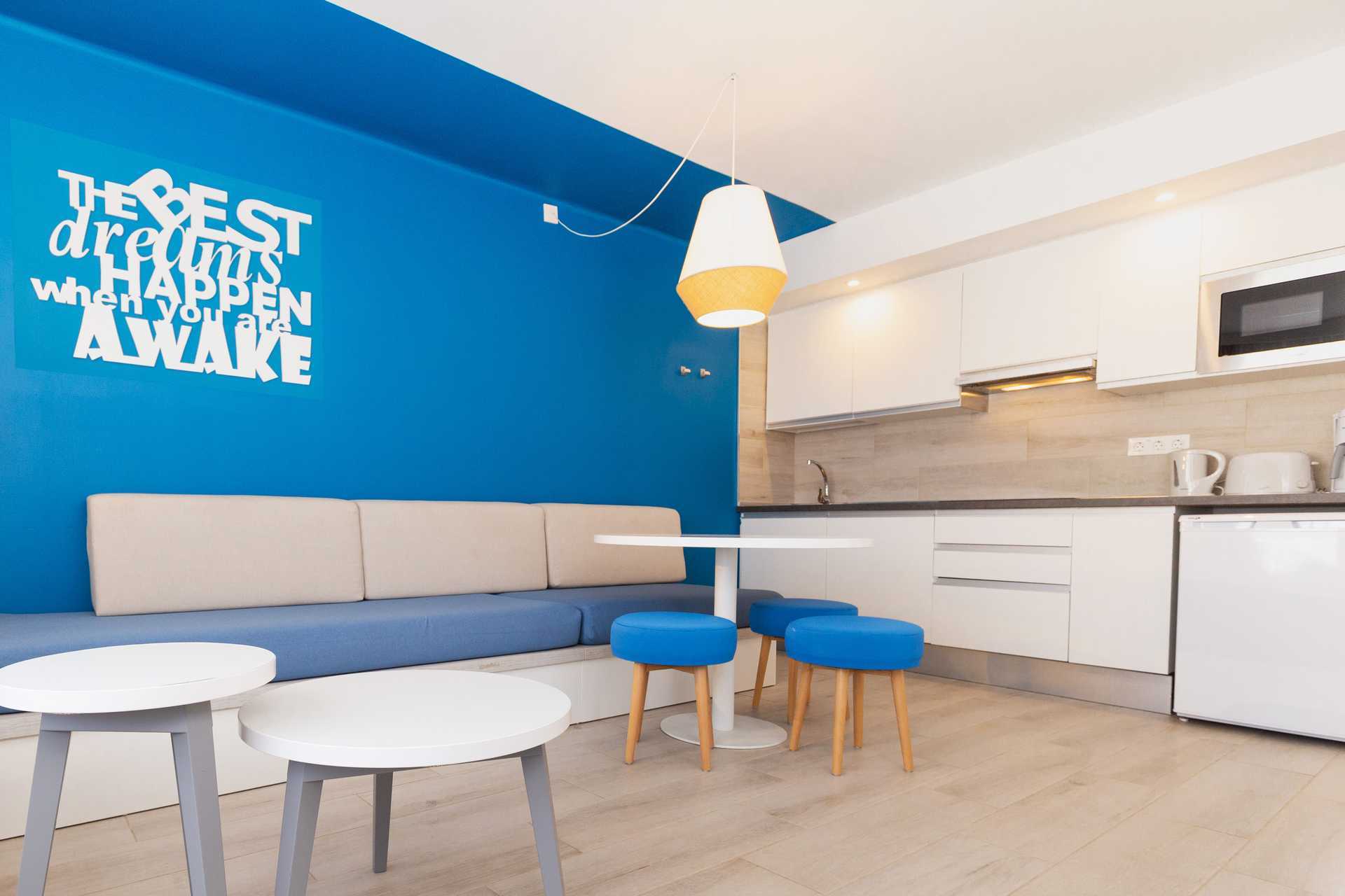 Toromsleilighet med balkong eller terrasse, noen med balkong og havutsikt. Et soverom og stue med minikjøkken. En dobbeltseng. Mulig med en ekstraseng i sovesofa. Minikjøkken med kokeplater, lite kjøleskap, kaffetrakter, brødrister, mikrobølgeovn og enkel kjøkkenutstyr. Luftkondisjonering inkludert. Wifi og safe mot avgift. TV. Hårføner. Baderom med dusj og wc. Rengjøring 3 ggr/uke. Barn under 2 år regnes inn i maksantallet i leiligheten.