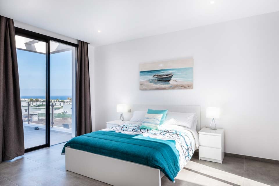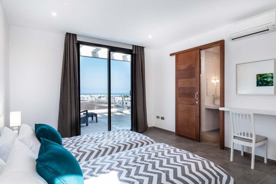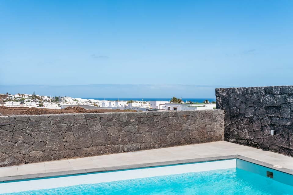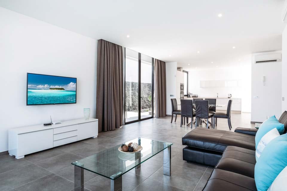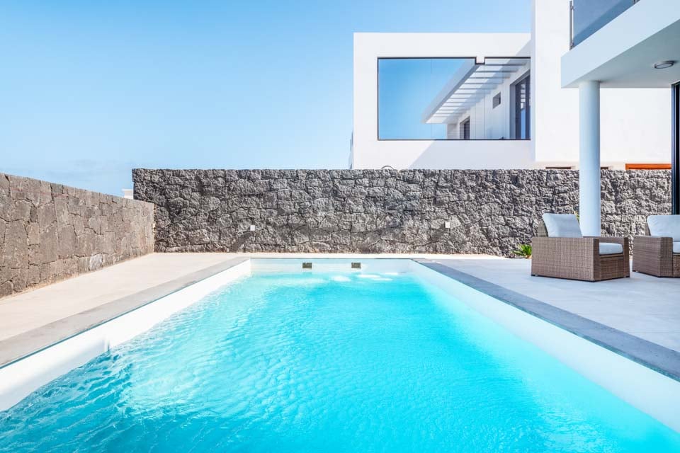 Med et privat oppvarmet* basseng tilbyr Villa Bernadette den ideelle terrassen for dager utendørs. Nyt solen på en av de avslappet solsengene eller kos deg i de koselige sofaene med selskap av en god bok. Denne lukkede terrassen, med sine vulkanske steinmurer, kan skilte med utsikt over det rustikke landskapet med fjell- og havutsikt i det fjerne. For utendørs servering er det et utendørs spiseområde, i skyggen av en parasoll og en grill for å grille noen kulinariske herligheter. Gulv-til-tak-terrassedører fører fra terrassen til innsiden, hvor du vil bli møtt av en moderne og stilig åpen stue og kjøkkenløsning. Dette romslige rommet med hvitkalkede vegger har svart-hvitt fargevalg, kjølig klimaanlegg og moderne møbler. Det er også soverom nummer én i første etasje, en dobbeltseng med terrassedører ut til terrassen og et eget dusjrom. I første etasje finner vi de to resterende soverommene, ett dobbeltrom og ett tomannsrom, begge med eget bad.