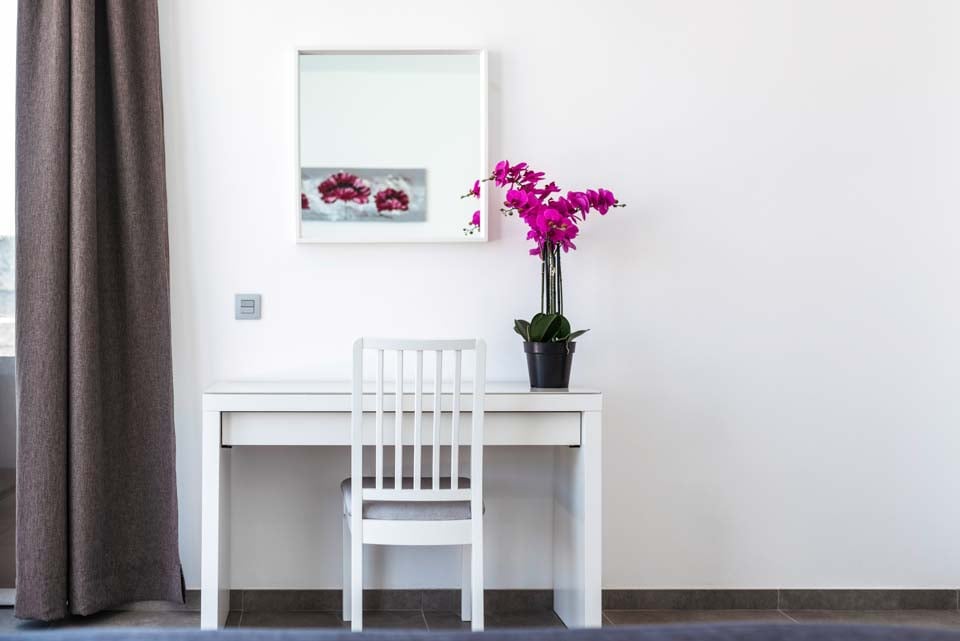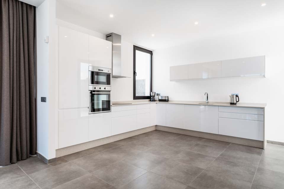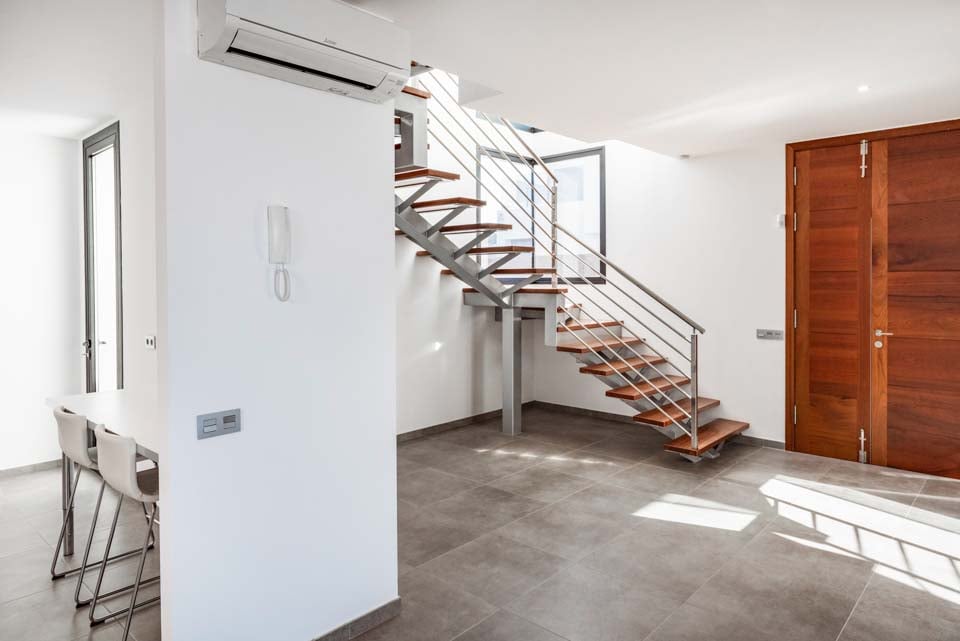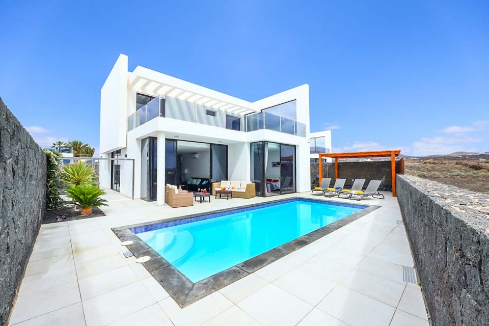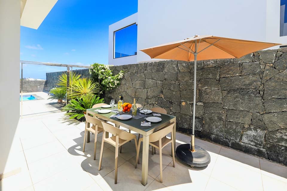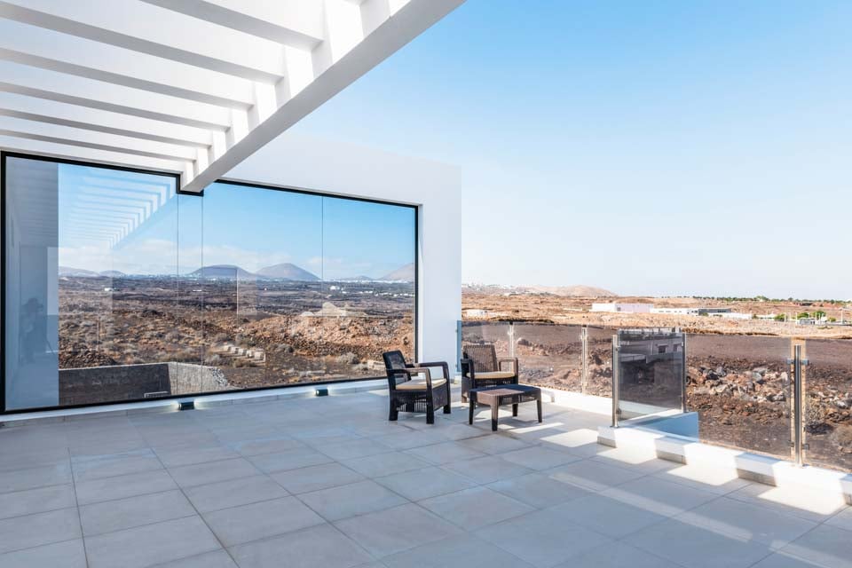 Med et privat oppvarmet* basseng tilbyr Villa Bernadette den ideelle terrassen for dager utendørs. Nyt solen på en av de avslappet solsengene eller kos deg i de koselige sofaene med selskap av en god bok. Denne lukkede terrassen, med sine vulkanske steinmurer, kan skilte med utsikt over det rustikke landskapet med fjell- og havutsikt i det fjerne. For utendørs servering er det et utendørs spiseområde, i skyggen av en parasoll og en grill for å grille noen kulinariske herligheter. Gulv-til-tak-terrassedører fører fra terrassen til innsiden, hvor du vil bli møtt av en moderne og stilig åpen stue og kjøkkenløsning. Dette romslige rommet med hvitkalkede vegger har svart-hvitt fargevalg, kjølig klimaanlegg og moderne møbler. Det er også soverom nummer én i første etasje, en dobbeltseng med terrassedører ut til terrassen og et eget dusjrom. I første etasje finner vi de to resterende soverommene, ett dobbeltrom og ett tomannsrom, begge med eget bad.