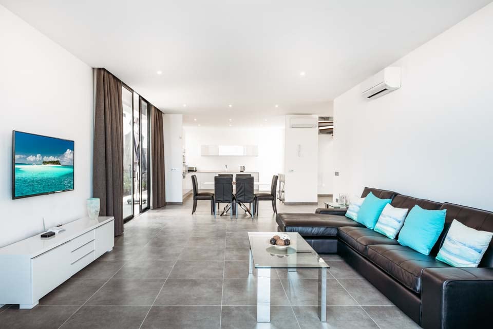 Komfortabel sittegruppe, klimaanlegg, smart-TV, spiseplass, åpen planløsning, terrassedører