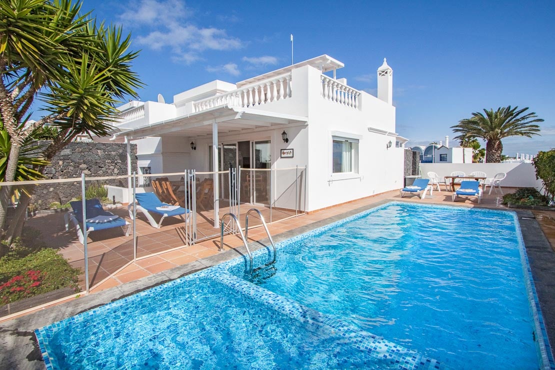 Seajay er bygget over to etasjer og tilbyr ovenpå hovedsoverommet med eget bad og en privat balkong med uforstyrret havutsikt. De 2 rommene med to enkeltsenger ligger i første etasje og fører til åpen planløsning med stue og spisestue og et velutstyrt kjøkken. Terrassedører fra stuen fører ut mot den terrakottaflislagte terrassen og det private bassengområdet, omgitt av en vegg for å gi deg privatliv rundt bassengområdet. Ekstra overbygde sitteplasser utendørs for utendørs servering og tradisjonell kanarisk grill i murstein. Bassenget har et sikkerhetsgjerde av netting med en låsbar port, slik at små barn ikke kan komme inn i bassengområdet uten tilsyn. Gjerdet kan felles ned hvis det ikke er barn i reisefølget ditt og du ikke ønsker å bruke det, noe som gir deg full kontroll og trygghet.