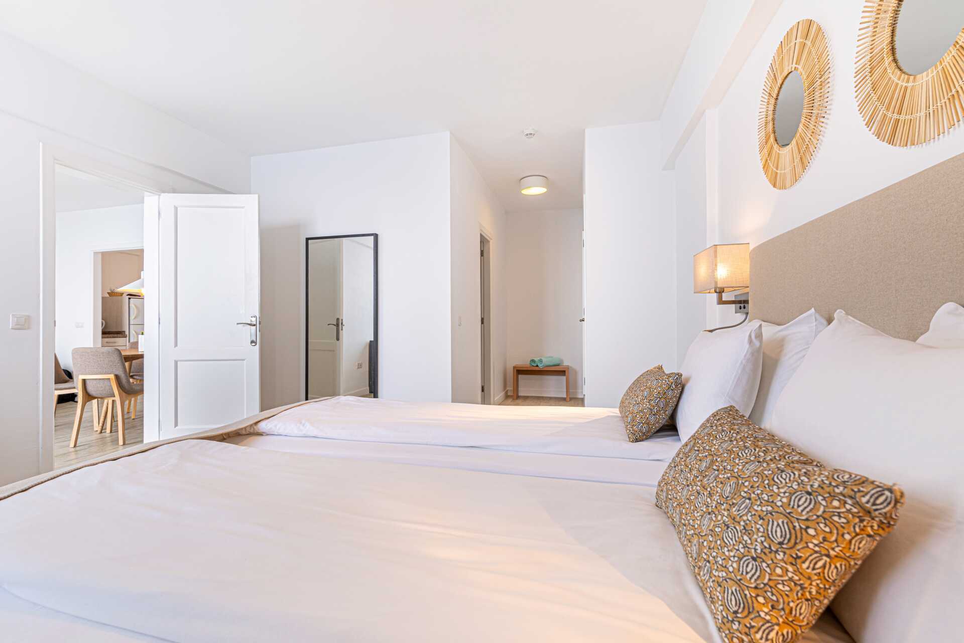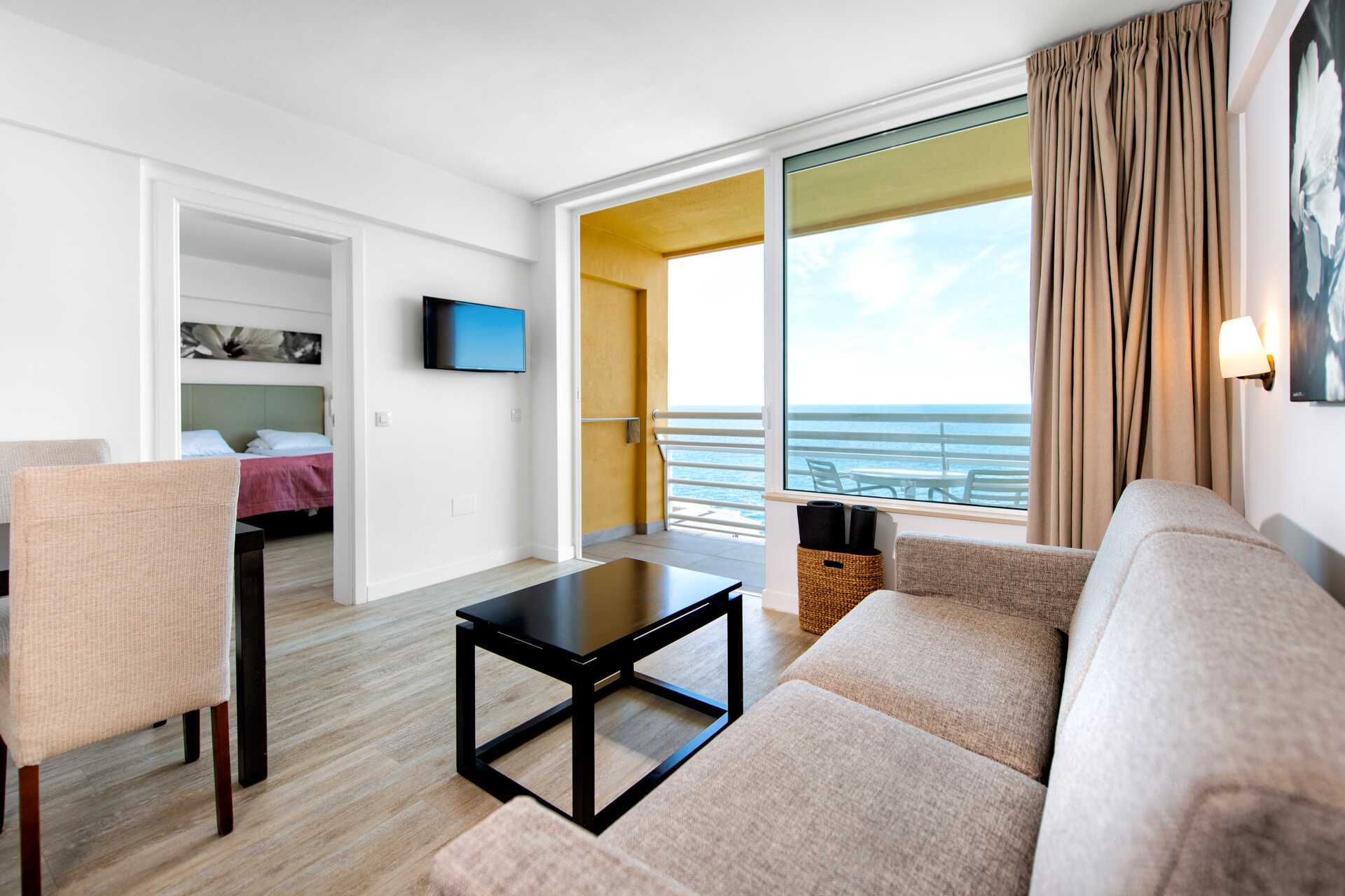 Suite med markbalkong eller stor markbalkong, begge med havutsikt. Uteplassen ligger i solen det meste av dagen, det er mulig å leie solsenger og parasoller til uteplassen. En dobbeltseng eller to enkeltsenger. Mulig med en ekstraseng i sovesofa. Minikjøkkenet har kokeplater, vannkoker, kaffetrakter, brødrister, kjøleskap og enkelt kjøkkenutstyr. Wifi inkludert. Safe mot avgift. TV. Hårføner. Badekar eller dusj samt wc. Rengjøring 5 ggr/uke.