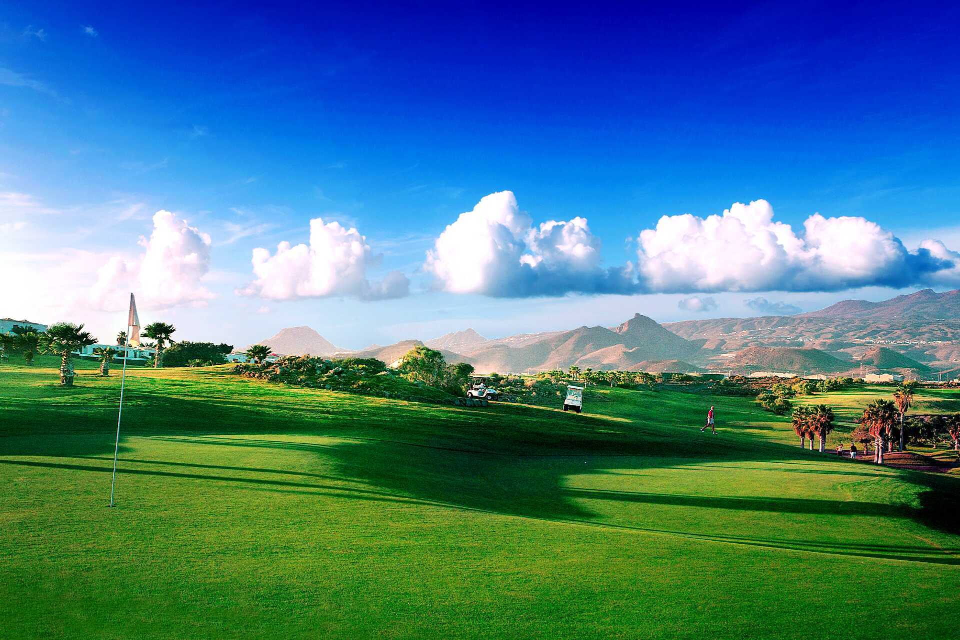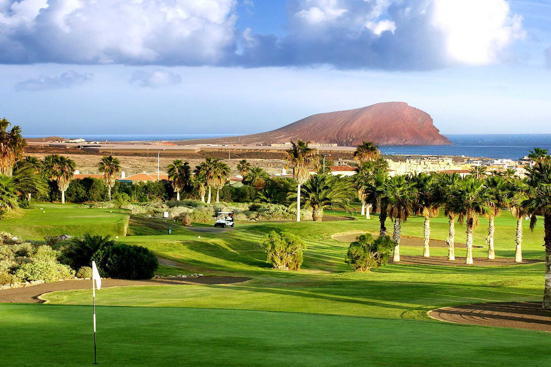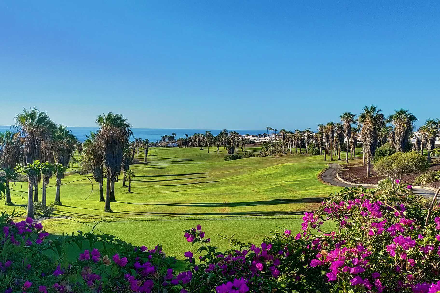 Golf del Sur - Tenerifes paradis for golfelskere! Her vil du bli møtt av et frodig landskap med palmekledde veier, fargerike planter og spektakulære golfbaner som slynger seg mellom raviner, vulkansk sand og havutsikt – med baner som tiltrekker seg både nybegynnere og profesjonelle. Men det er så mye mer enn bare golfbaner, det finnes restauranter og butikker her, om enn i mindre skala enn i de nærliggende større feriestedene Los Cristianos og Playa de las Americas.