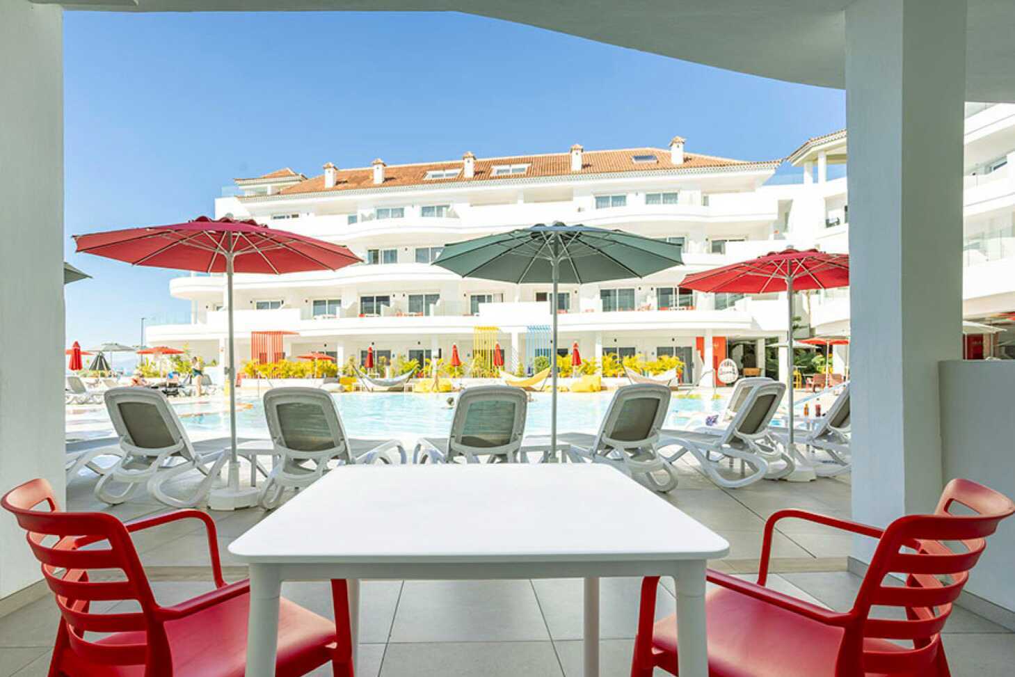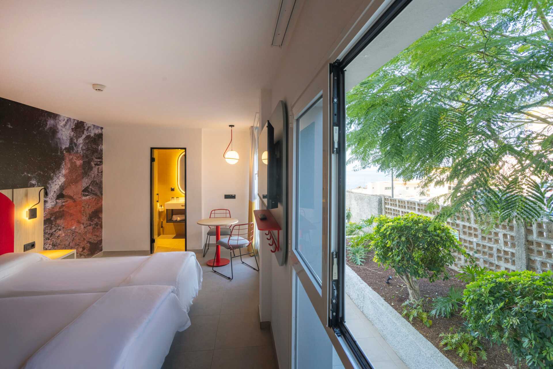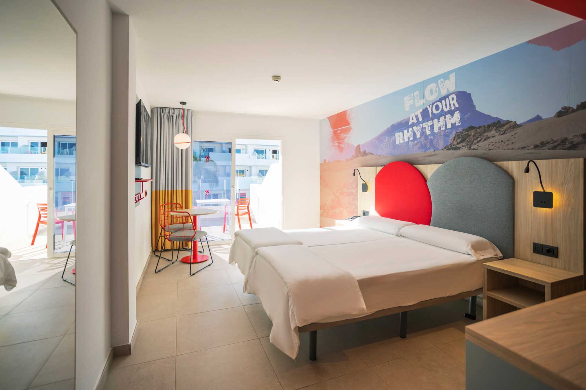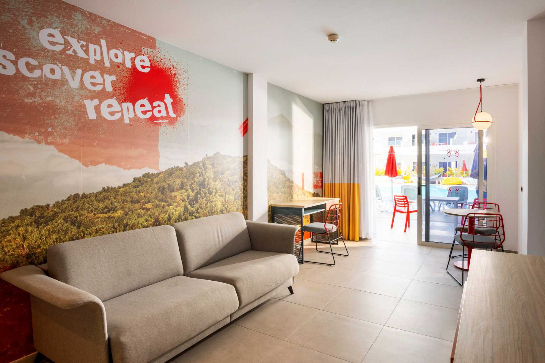 Suite med markterasse og bassengutsikt. Suiten består av et soverom og en stue. To enkeltsenger. Mulig med ekstraseng i sovesofa. Wifi, luftkondisjonering og safe inkludert. Takvifte. Minibar. TV. Dusj og wc. Rengjøring hver tredje dag.
