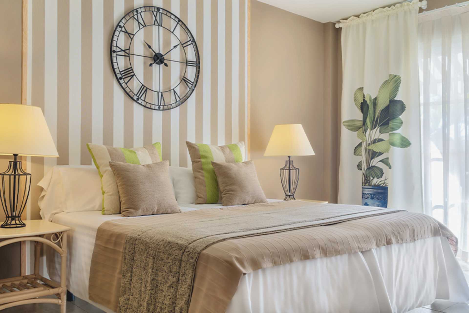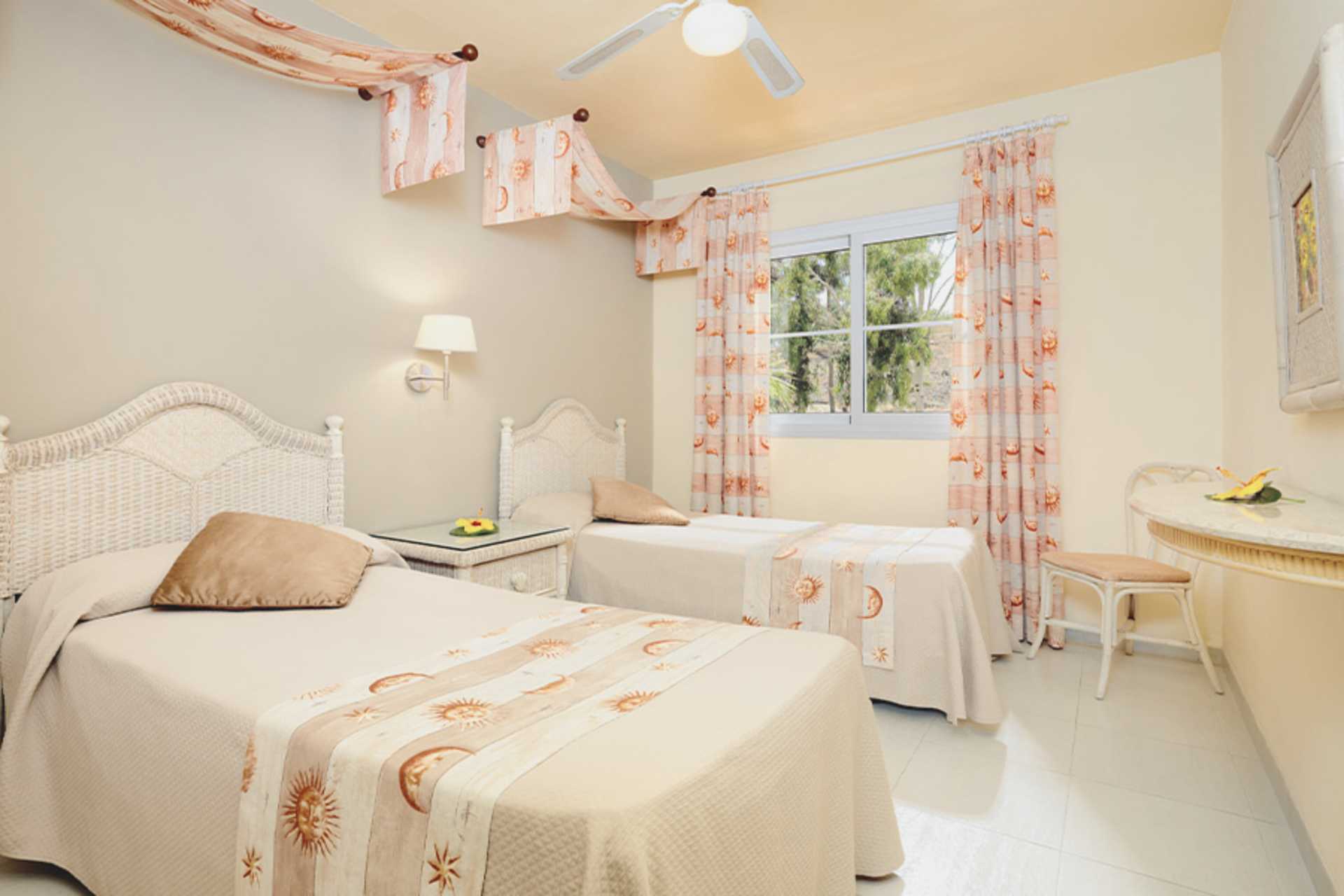 Treromsleilighet med balkong. To soverom og stue med minikjøkken. En dobbeltseng på det ene soverommet og to enkeltsenger på det andre soverommet. Takvifter i hvert soverom. Mulig med en ekstraseng i sovesofa. Kjøkken med kokeplater, kjøleskap, mikrobølgeovn, stekeovn, vannkoker, kaffemaskin og enkelt kjøkkenutstyr. Wifi og luftkondisjonering inkludert. Safe mot avgift. TV. Hårføner. Dusj og wc. Rengjøring 7 ggr/uke.