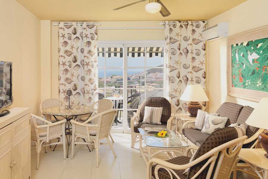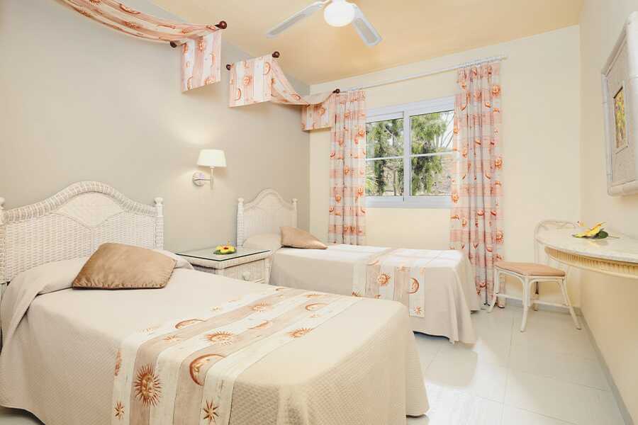 Treromsleilighet med balkong. To soverom og kombinert stue/kjøkken. En dobbeltseng på det ene soverommet og to enkeltsenger på det andre soverommet. Takvifter i hvert soverom. Mulig med en ekstraseng i enkeltseng. Kjøkken med kokeplater, kjøleskap, mikrobølgeovn, stekeovn, vannkoker, kaffemaskin og enkelt kjøkkenutstyr. Wifi og luftkondisjonering er inkludert. Safe mot avgift. TV. Hårføner. Dusj og wc. Rengjøring 7 ggr/uke.