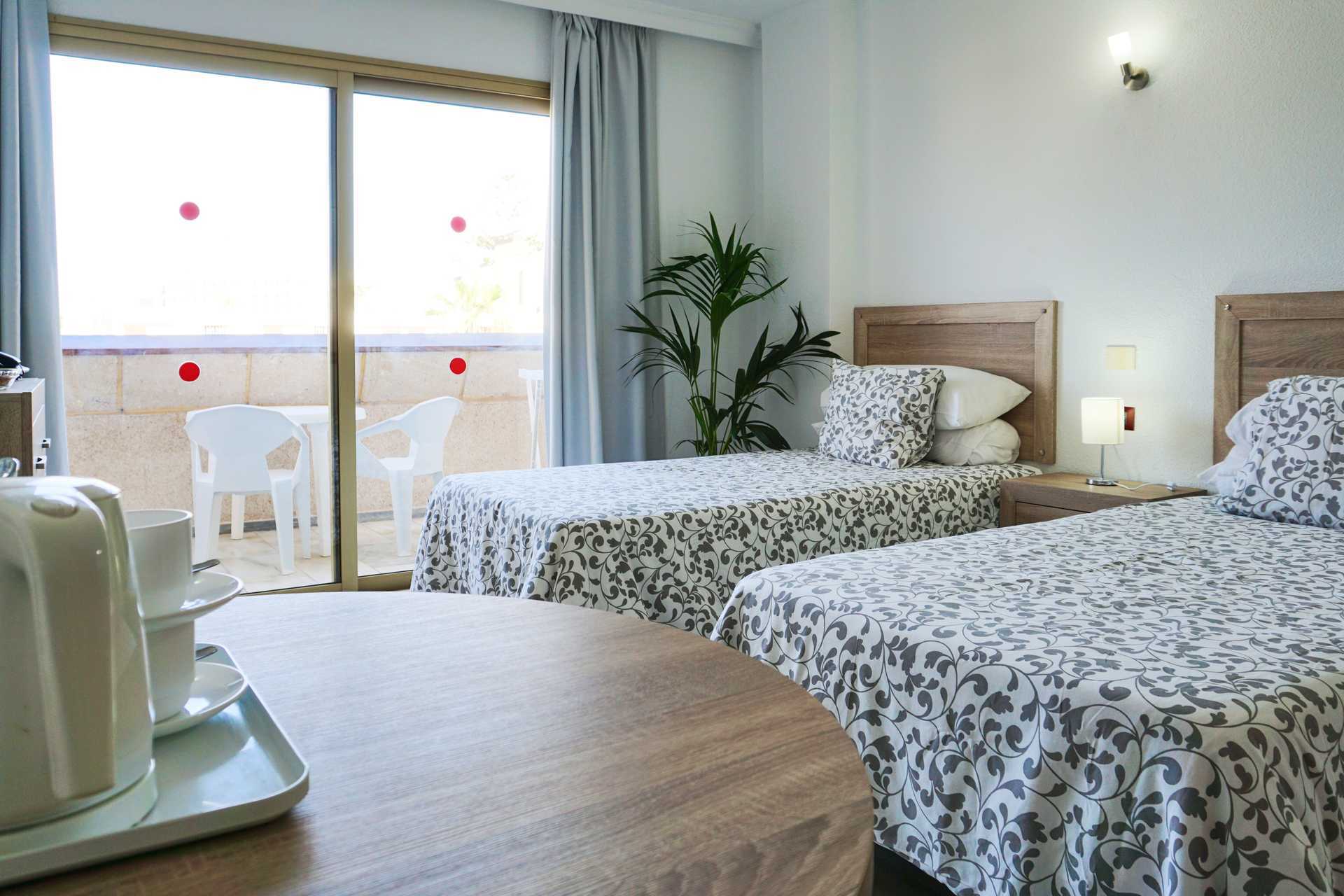 Toromsleilighet med balkong eller terrasse. Et soverom og en stue med minikjøkken. To enkeltsenger. Mulig med ekstraseng i sovesofa eller feltseng. Minikjøkken med kokeplater, kjøleskap, oppvaskmaskin, mikrobølgeovn og enkelt kjøkkenutstyr. Wifi og safe mot avgift. TV. Dusj og wc. Rengjøring 5 ggr/uke.