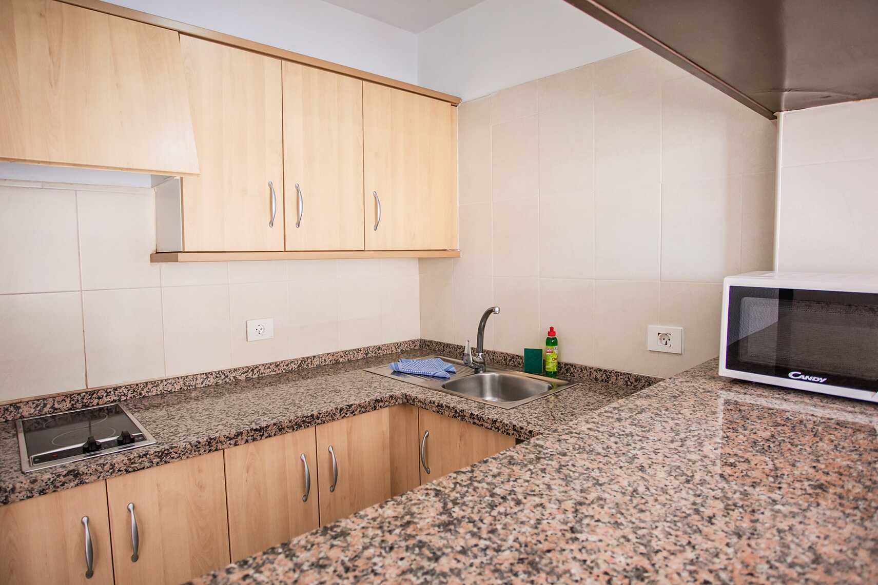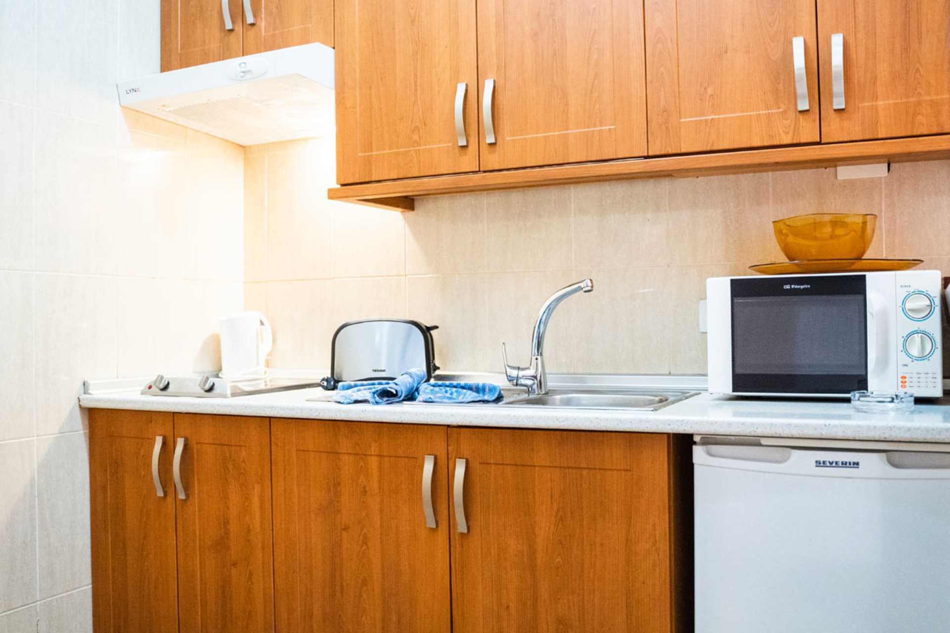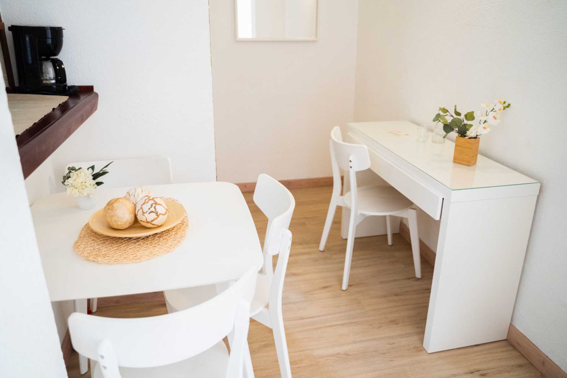 Ettromsleilighet med markterrasse med bassengutsikt. Stue med minikjøkken. To enkeltsenger. Mulig med en ekstraseng i sovesofa. Minikjøkken med kokeplater, kjøleskap, mikrobølgeovn, vannkoker og enkelt kjøkkenutstyr. Wifi inkludert. Safe mot avgift. TV. Dusj og wc. Rengjøring 5 ggr/uke.