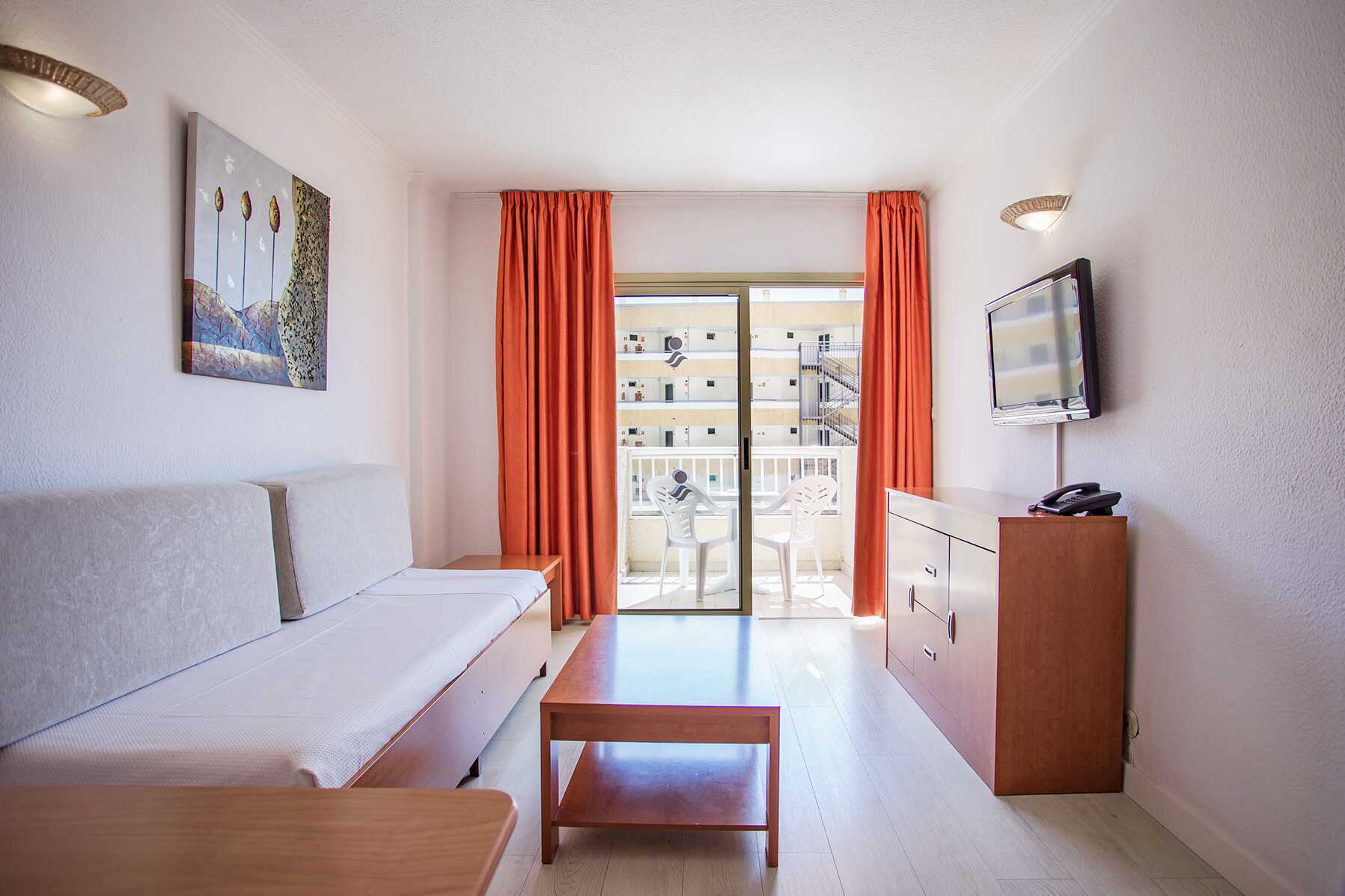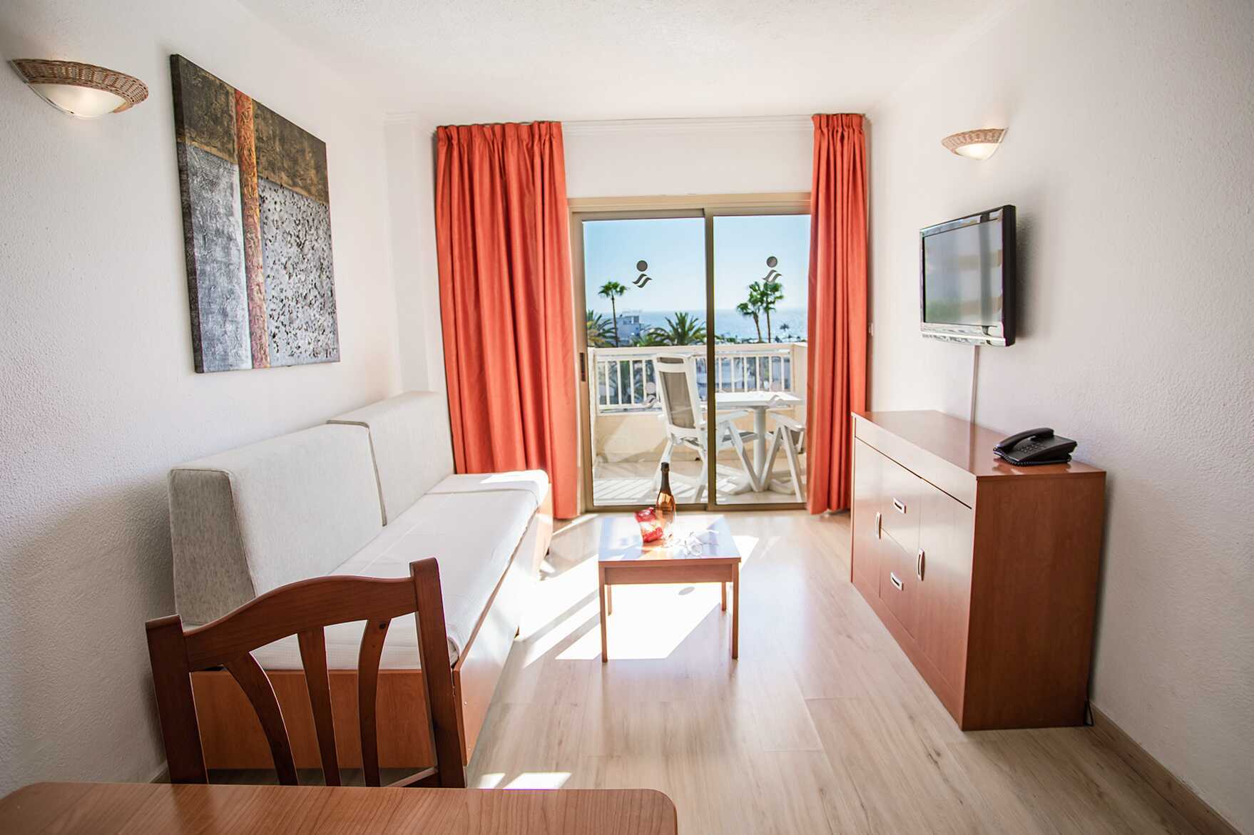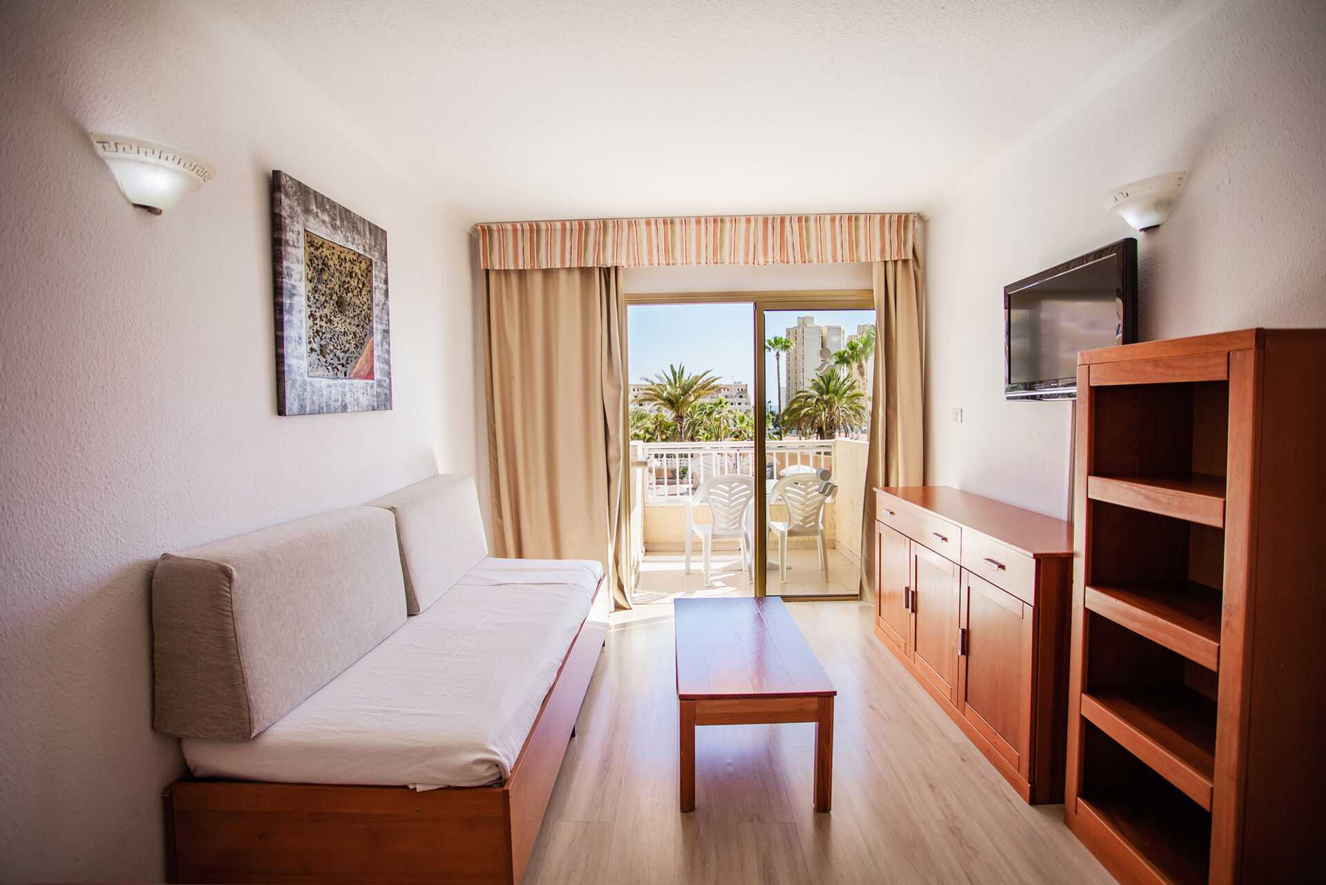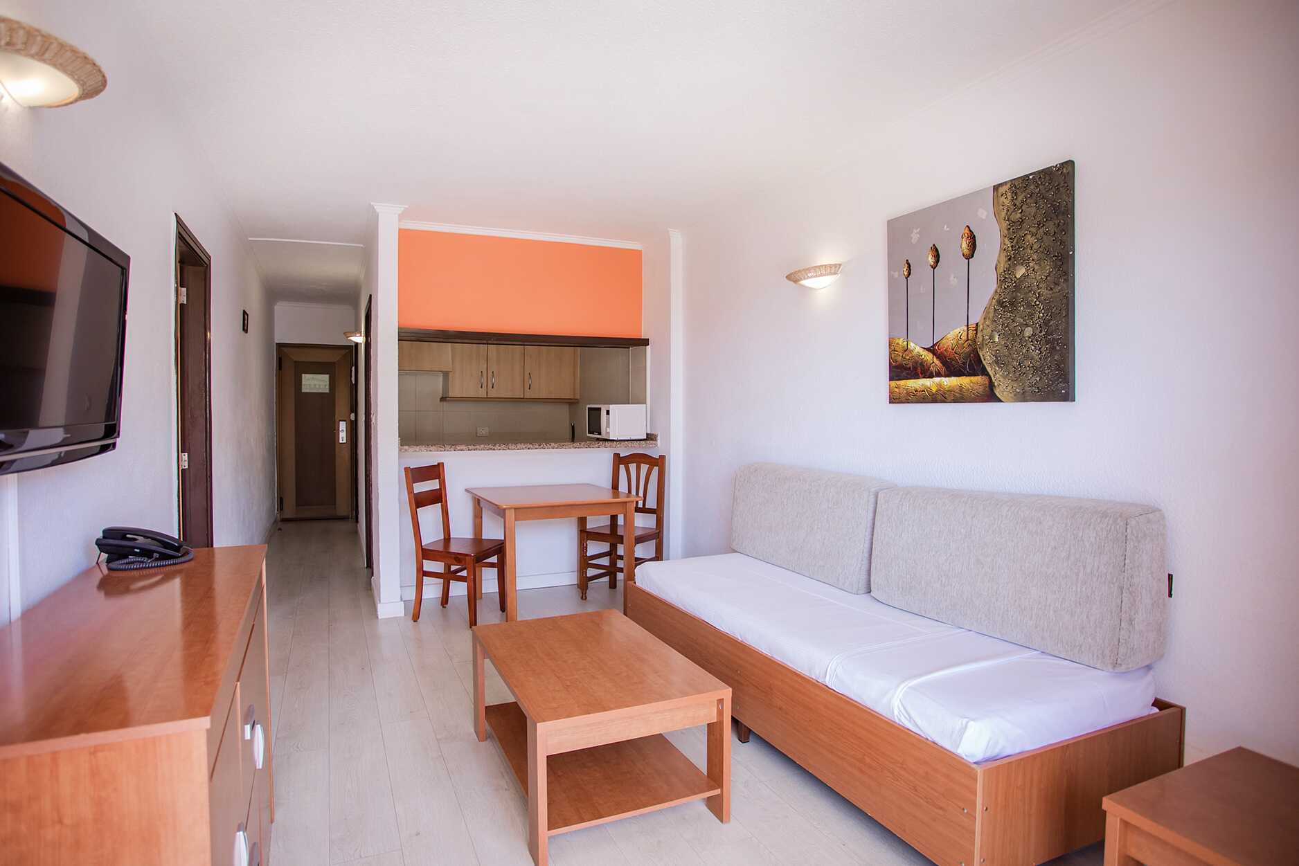 Toromsleilighet med balkong, noen med bassengutsikt eller begrenset havutsikt. Et soverom og en stue med minikjøkken. To enkeltsenger. Mulig med en ekstraseng i sovesofa. Minikjøkken med kokeplater, kjøleskap, mikrobølgeovn, vannkoker og enkelt kjøkkenutstyr. Wifi inkludert. Safe mot avgift. TV. Badekar og wc. Rengjøring 5 ggr/uke.