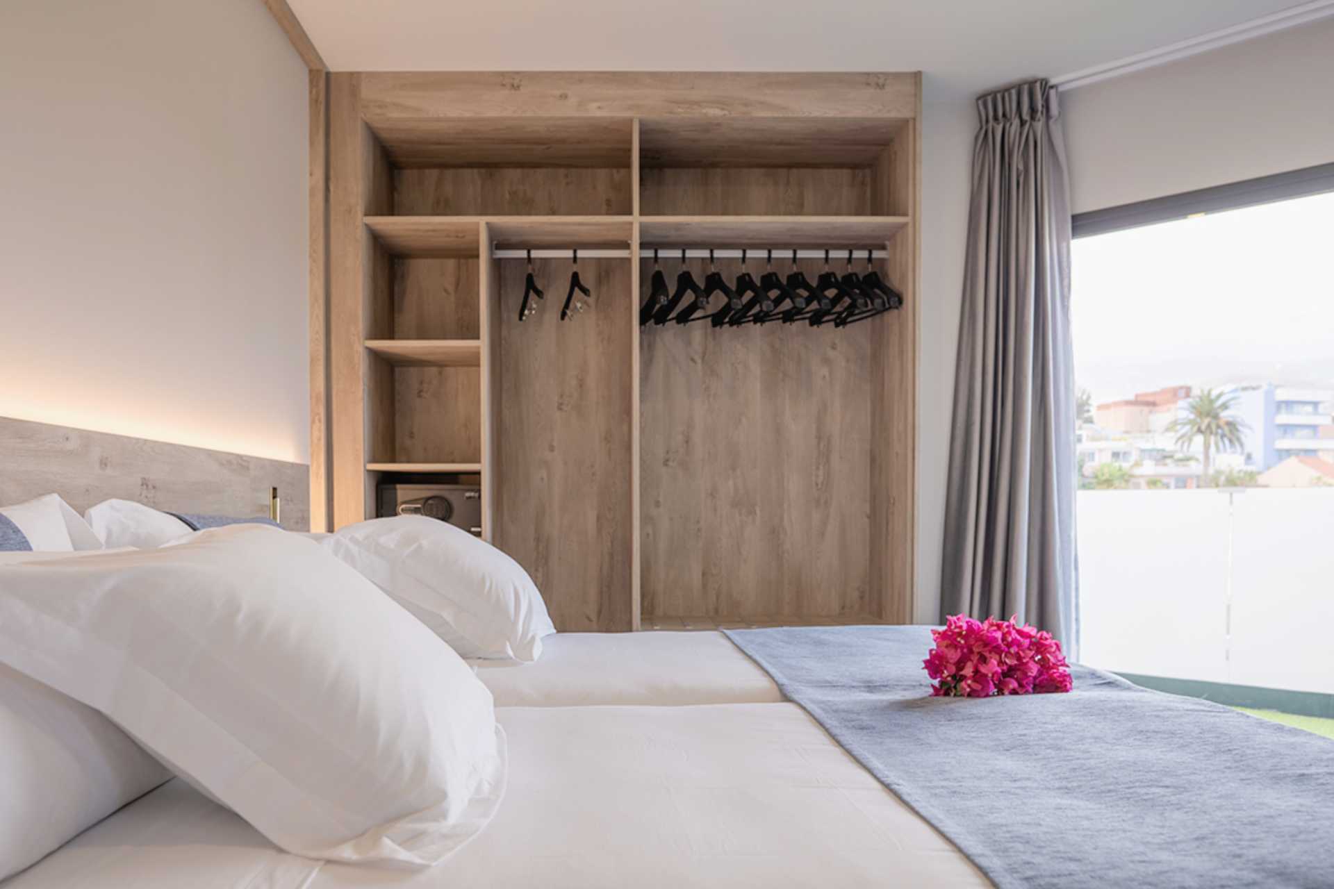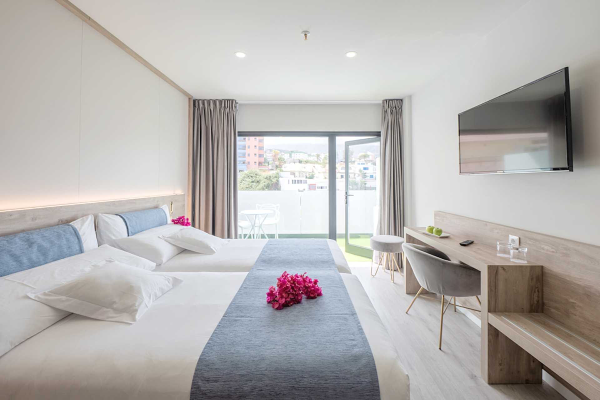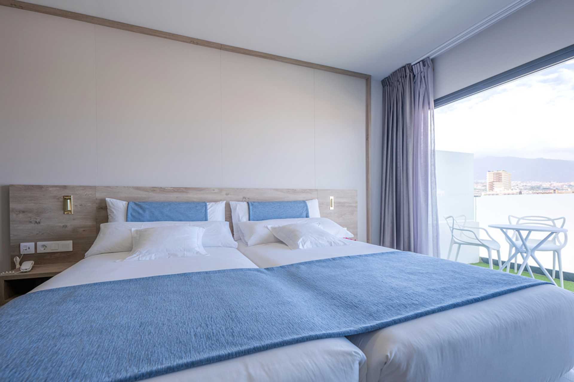 Dobbeltrom med balkong og utsikt mot Teide. To enkeltsenger. Wifi, luftkondisjonering og safe inkludert. Minibar. Vannkoker. TV. Hårføner. Åpen planløsning til bad med frostede glassdører til dusj og wc. Rengjøring 7 ggr/uke.
