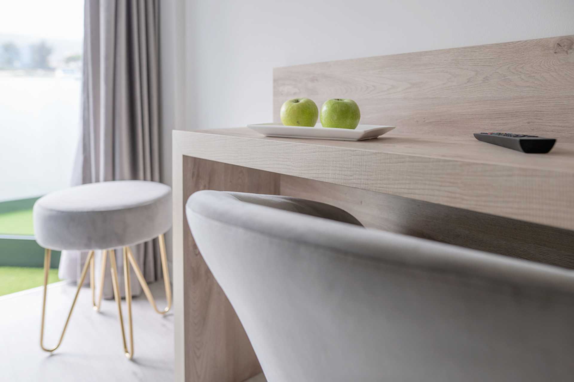 Juniorsuite med balkong. Et soverom med to enkeltsenger. En stue med sovesofa med mulighet for ekstrasenger til to personer. Wifi, luftkondisjonering og safe inkludert. Minibar. Vannkoker. TV. Hårføner. Åpen planløsning til bad med badekar og frostede glassdører til dusj og wc. Rengjøring 7 ggr/uke.