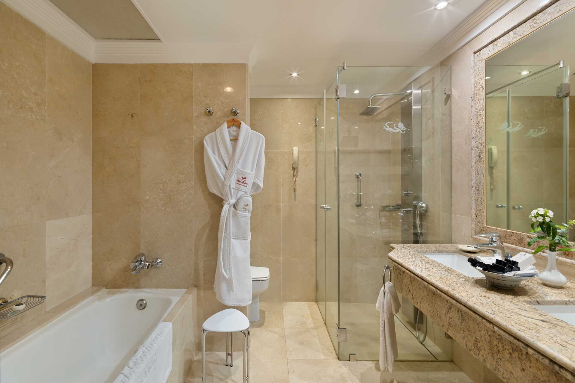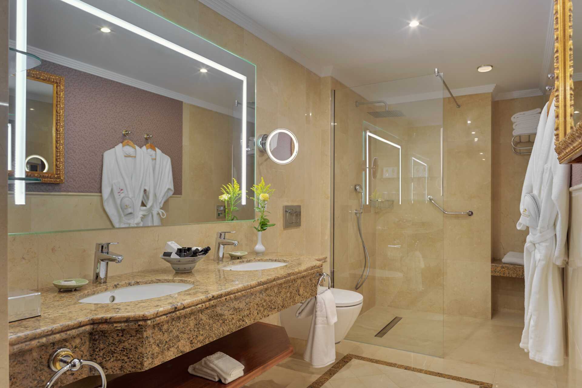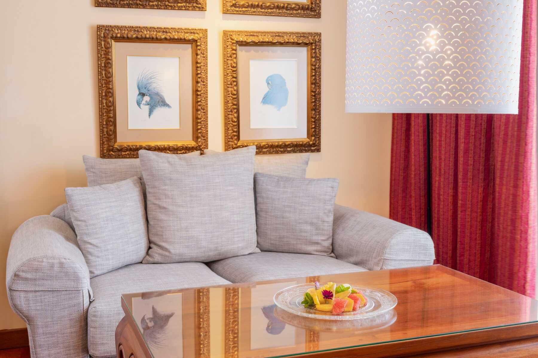 Suite med balkong. En dobbeltseng eller to enkeltsenger. Mulig med en ekstraseng i sovesofa. Putemeny. Sofa og lenestoler. Wifi, luftkondisjonering og safe inkludert. Minibar. Nespresso kaffemaskin, kapsler inkludert og etterfylles hver dag. Vannkoker samt kaffe og te. TV og Chromecast. Noen suiter har vegg-til-vegg-tepper. Badekåper og tøfler Hårføner. Badekar, separat dusj og wc. Rengjøring 7 ggr/uke.