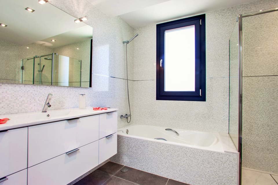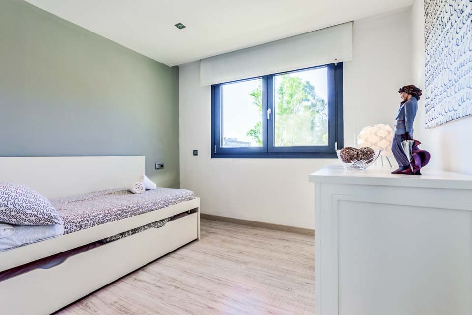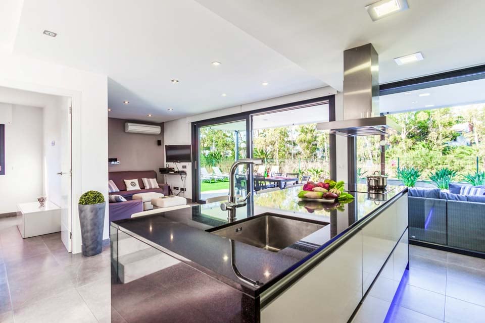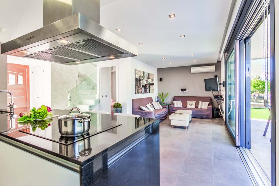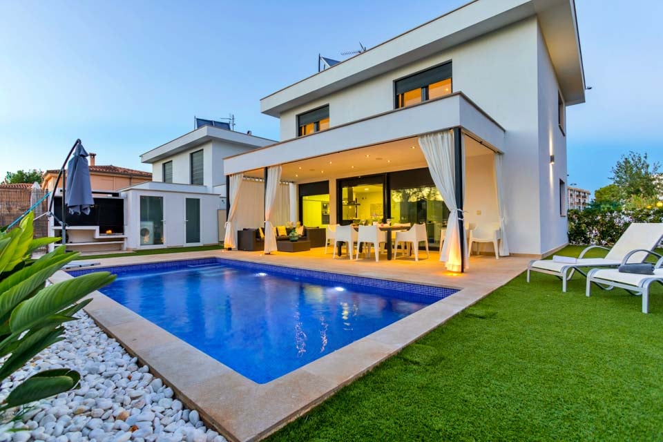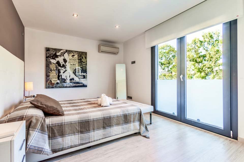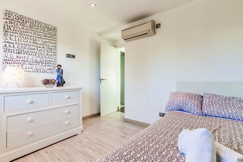 Denne moderne boligen består av 4 soverom med klimaanlegg og plass til opptil 7 gjester, og tilbyr rikelig med plass og naturlig lys. Hjemmets sentrum er den åpne planløsningen, som fører ut til en romslig overbygd terrasse som er ideell for utendørs servering mens du ser på den baleariske solnedgangen foran deg.