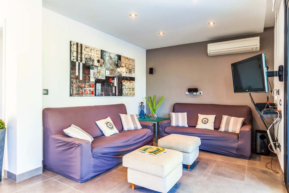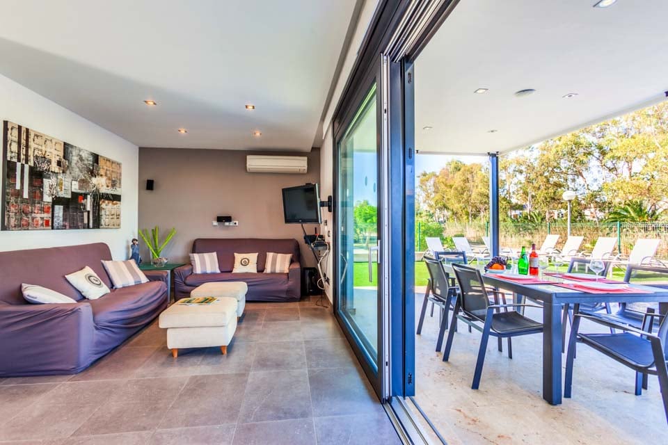 Komfortable sitteplasser, komfortabel sittegruppe, klimaanlegg, flatskjerm-TV, satellitt-TV, musikkanlegg, åpen planløsning, dører til terrasse, dører til terrassehager