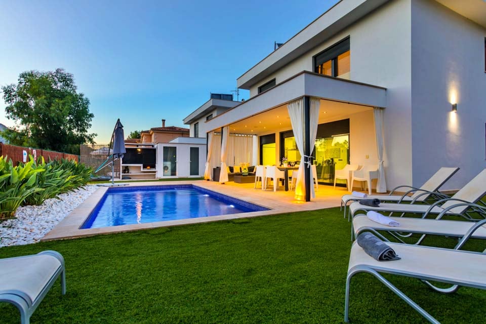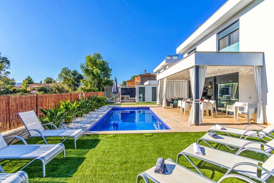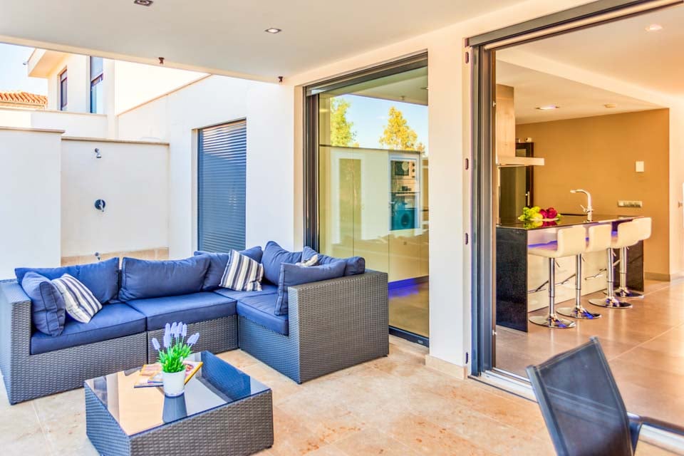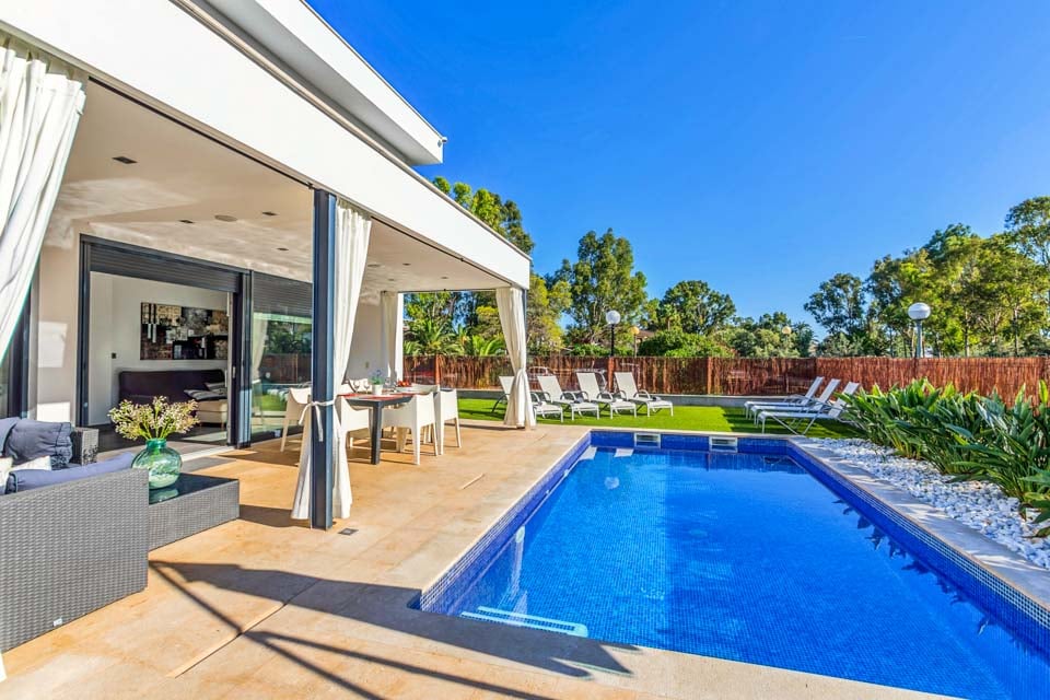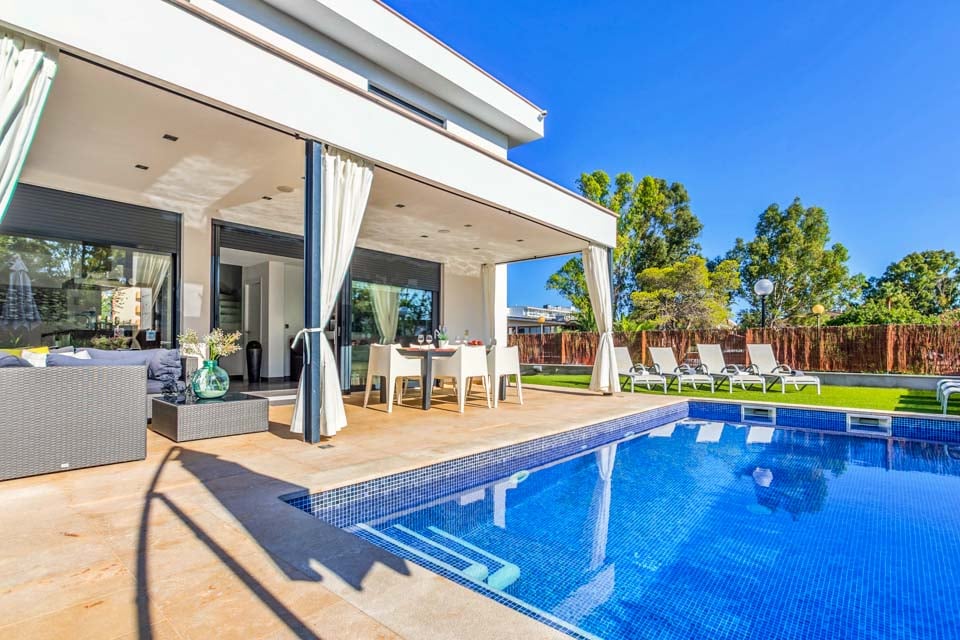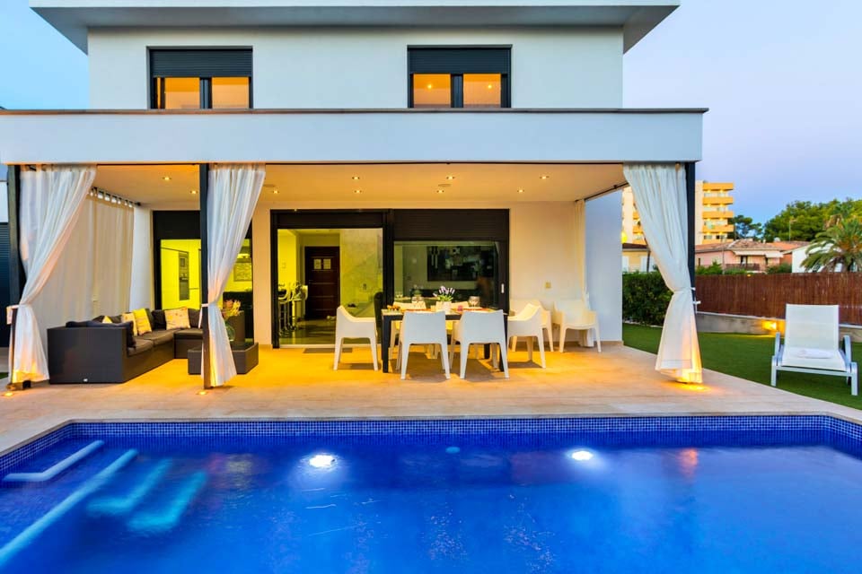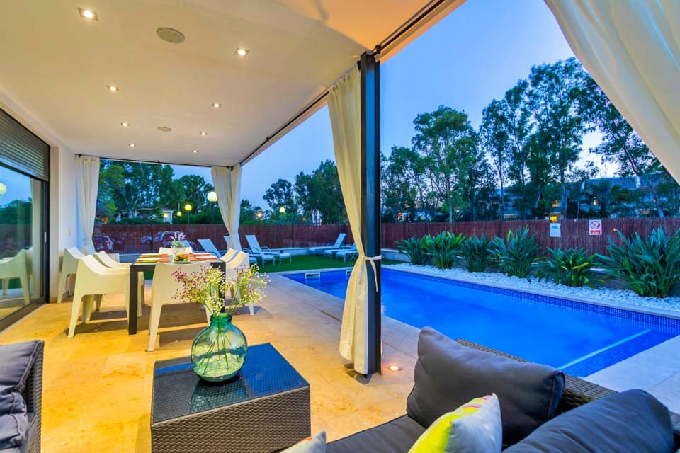 Villa Cosins har en unik beliggenhet i utkanten av Alcudia, bare noen skritt fra sandstranden Playa de Muro, og er en innbydende og moderne eiendom med stilig interiør og et snev av luksus.