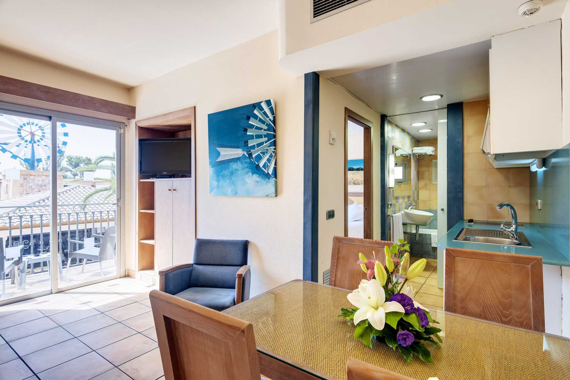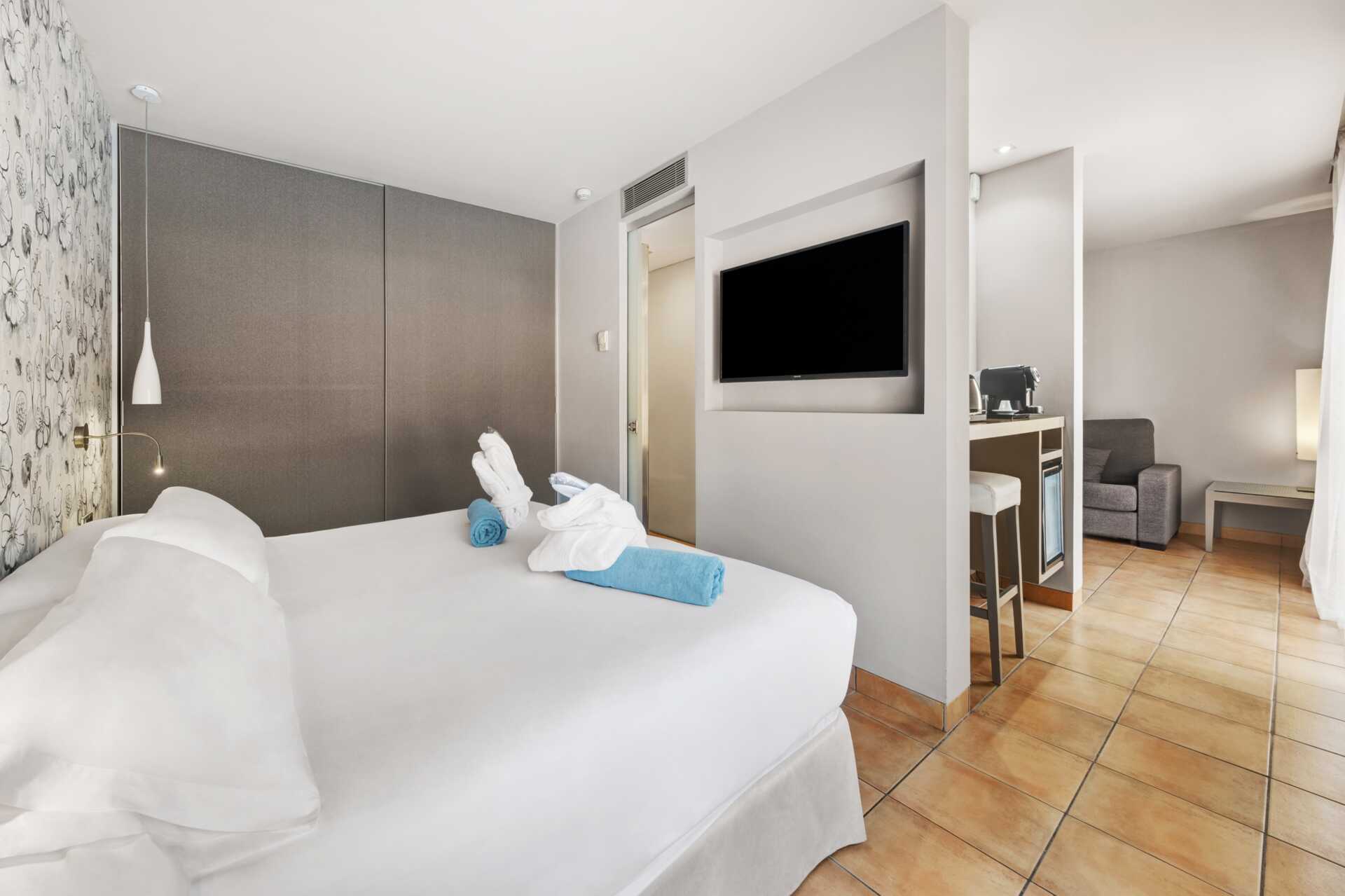 Deluxerom med balkong eller terrasse. Deluxerommet består av et soverom og en stue i åpen planløsning. En dobbeltseng eller to enkeltsenger. Mulig med to ekstrasenger i sovesofa. Putemeny. Wifi og luftkondisjonering er inkludert. Safe mot avgift. Minibar. Vannkoker samt kaffe og te. Espresso kaffemaskin. Bassenghåndklær inkludert. Hårføner. Baderom med dusj og wc. Rengjøring 5 ggr/uke.