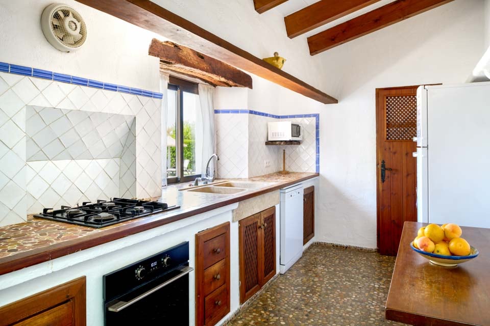 Det er et godt eksempel på hvordan man kan blande tradisjonell arkitektur med moderne fasiliteter. Huset har beholdt sitt originale steingulv i stue/spisestue, men er møblert med komfortable, moderne sofaer og en smart-TV, med en original åpen peis for bruk i tidlig og sen sesong. Det fullt utstyrte kjøkkenet ligger ved siden av dette. Fra stuen er det trapper som fører ned til dobbeltsoverommet med klimaanlegg og felles dusjrom. Noen få trinn fører deretter opp til soverommet med to enkeltsenger og klimaanlegg og soverommet med enkeltseng og vifte. Det er et andre dusjrom med utvendig adkomst.