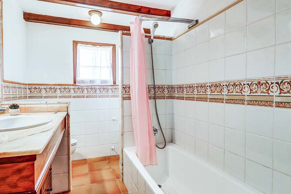 Gå tilbake til spisestuen, så vil du legge merke til en vakkert flislagt trapp som fører deg til første etasje. Her finner vi de to resterende soverommene, et annet dobbeltrom og et annet tomannsrom som deler et separat bad. Alle soverommene har tradisjonelle detaljer og er fulle av sjarm, med bjelker i taket, kule gulvfliser og møbler av klassisk stil. Alle soverommene har også gratis tidsstyrt klimaanlegg.