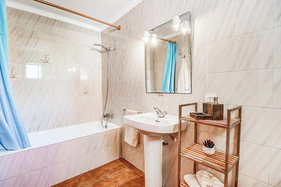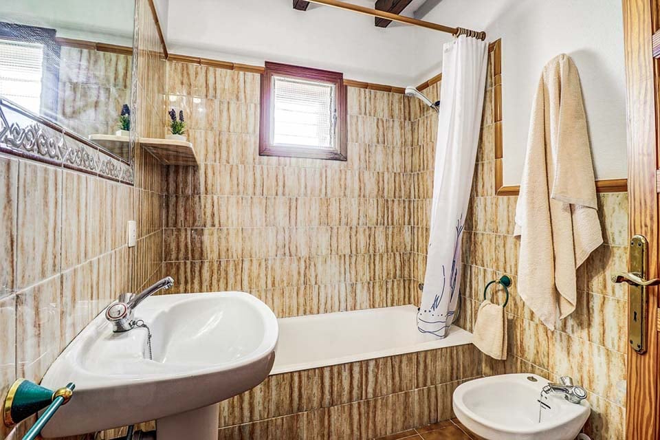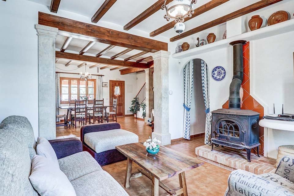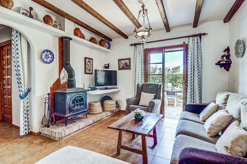 Innvendig finner vi de fleste rommene i første etasje. Når du kommer inn i Villa Can Joan, befinner du deg i den åpne spise- og oppholdsstuen, med takbjelker, lamper i antikk stil, komfortable sitteplasser og dører til terrassehagen. Fortsett til et fullt utstyrt kjøkken med treskap, som har alt du trenger for å lage et festmåltid. To soverom ligger i denne etasjen, ett dobbeltrom med eget bad og ett tomannsrom med tilgang til et separat bad. Et vaskerom med vaskemaskin fullfører første etasje.