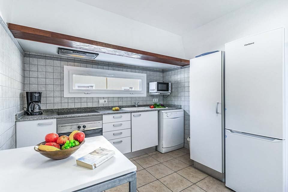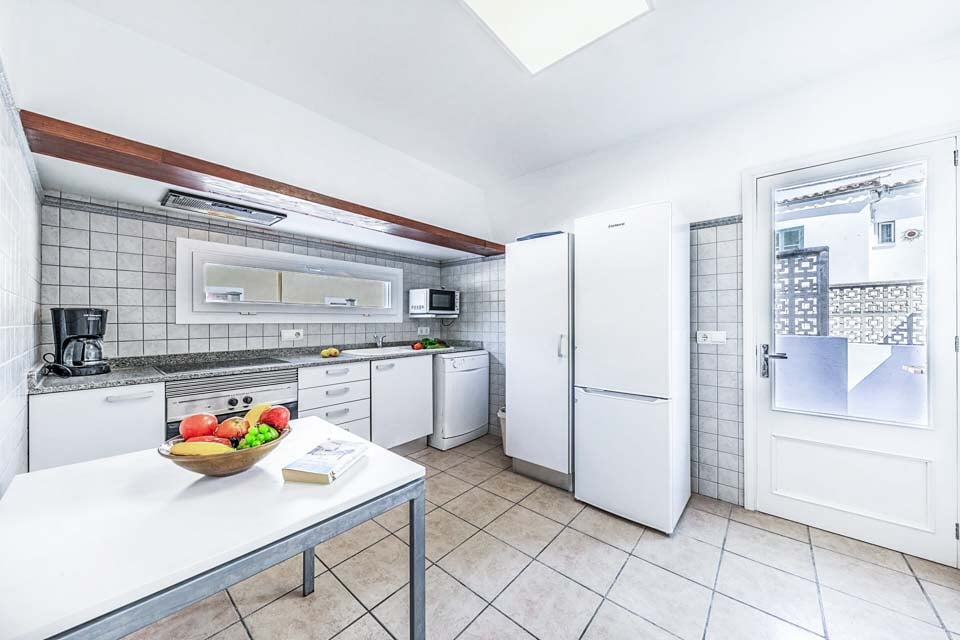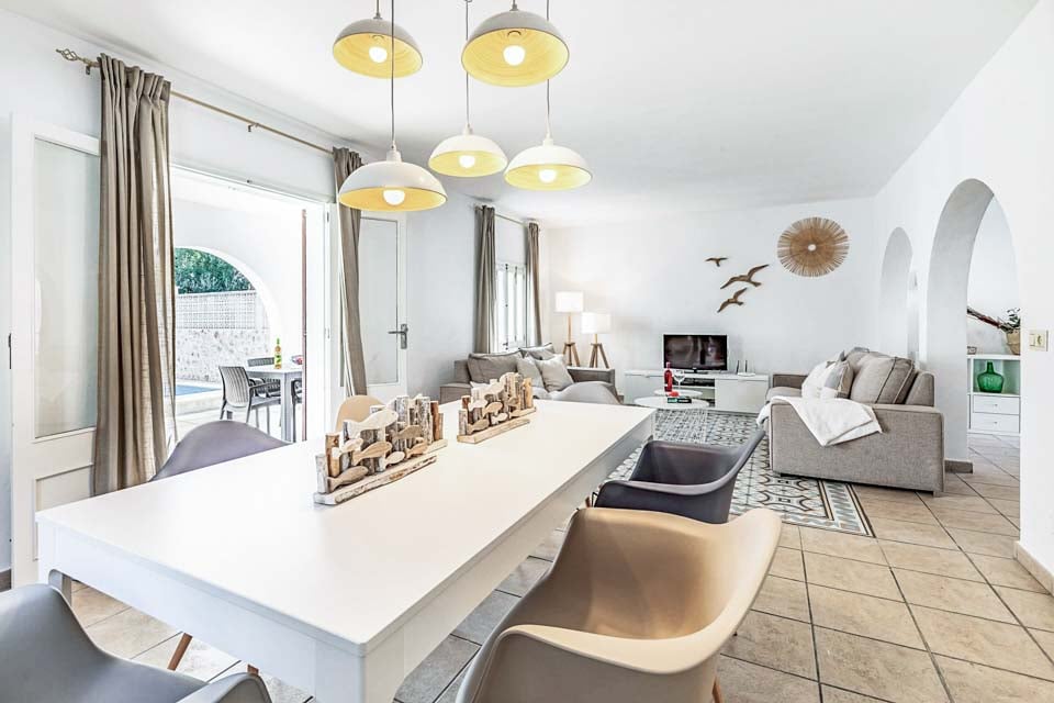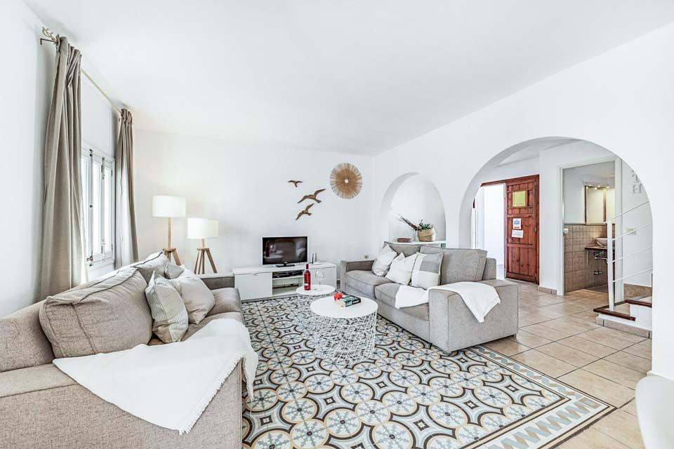 Gå inn der terrassedører fører deg inn i den åpne stue- og spisestueplanen. Dette lyse og luftige, hvitkalkede rommet fylt med nøytrale farger er et flott sted å unnslippe solen. Nyt satellittkanaler på flatskjerm-TV-en eller lag mat til familie og venner på det fullt utstyrte kjøkkenet. Med direkte tilgang til grillen har det aldri vært enklere å lage mat utendørs. Et dusjrom fullfører første etasje, mens tre soverom og et separat familiebad finnes i andre etasje.