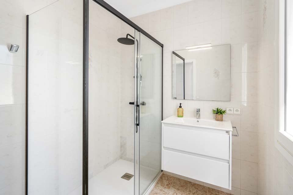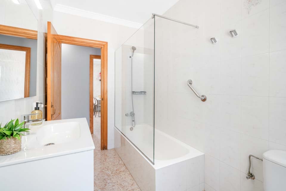 For å komme til villaen er det en sti som er 278 cm bred langs ett trinn. Inngangsdøren har en bredde på 130 cm, mens døren til terrassen er 300 cm bred. Det er fire trinn fra villaen til bassengkanten, ett trinn fra villaen til terrassen, og tre trinn fra terrassen ned til bassenget. Uteplassen er flislagt. Dette er en eiendom i første etasje. Alle soverommene har en dørbredde på 67 cm, mens alle badene har en dørbredde på 67 cm. Døren inn til kjøkken/spisestue er 67 cm bred, og døren inn til stuen er 80 cm bred. *Vær oppmerksom på at selv om vi har gjort vårt ytterste for å sikre at informasjonen som gis er nøyaktig, kan det forekomme feil. Hvis du trenger mer spesifikk informasjon om villaen, ikke nøl med å kontakte oss.