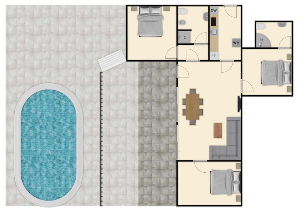 Bassengstørrelse: 8m x 4m Bassengdybde: 1m - 1,6m, Tilgang via trapper