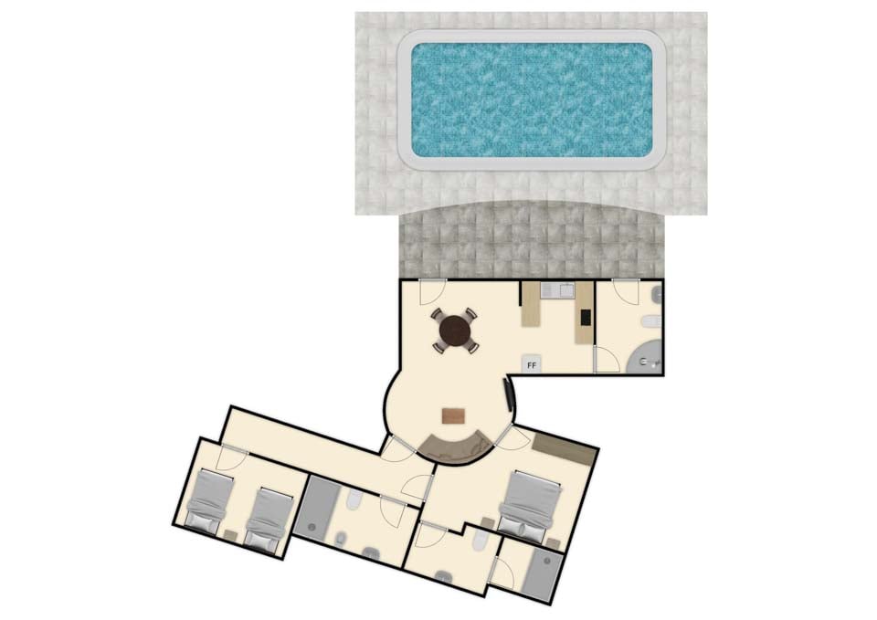 Fokuspunktet for villaen er det store private bassenget som er innredet med solsenger, som gir et forfriskende alternativ for utendørsaktiviteter.