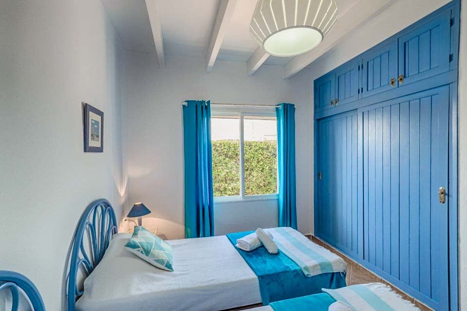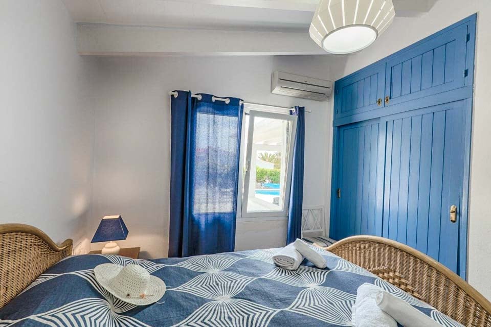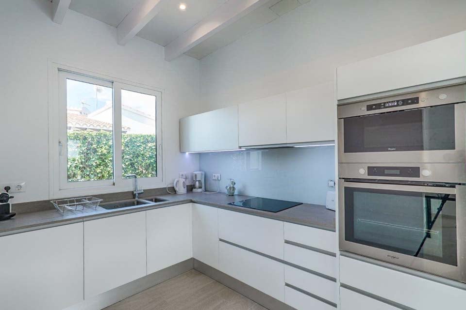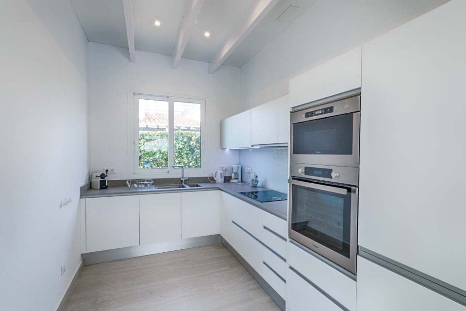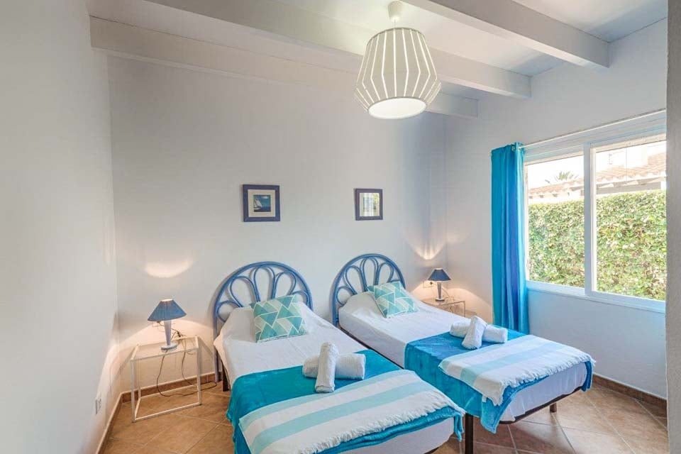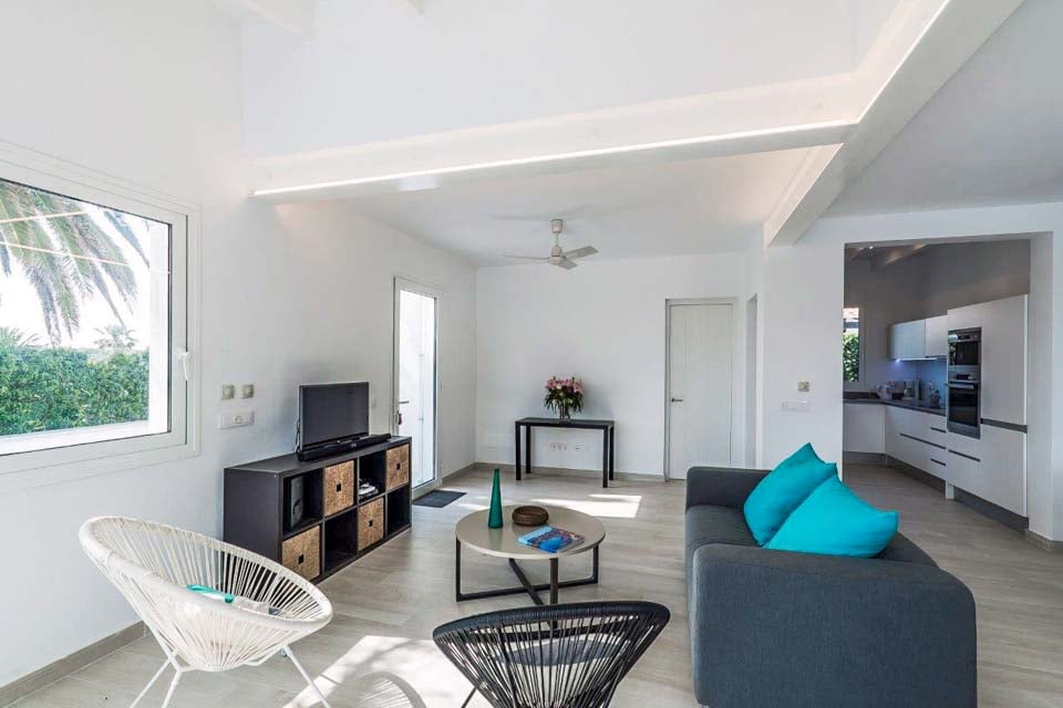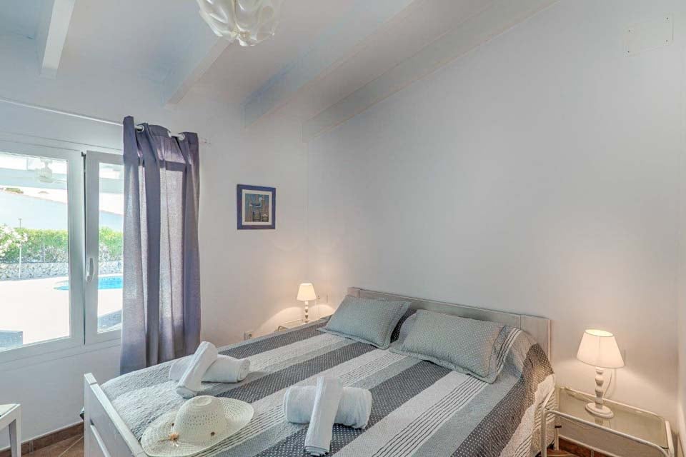 Huset smelter vakkert inn i den hvitkalkede arkitekturen i byen, med lys hvit stukkatur og skogkledde skodder. I stuen fortsetter den lyse fargepaletten, med nymalte vegger og myke grå sofaer, blandet med sprut av levende blå puter, et dristig spisebord i tre, alt dekorert med minimalisme og enkelhet. Kjøkkenet er i moderne stil og består av elegante hvite skap og en dobbel ovn i rustfritt stål. Det ene soverommet med 2 enkeltsenger og de to dobbeltrommene har klimaanlegg for å kjøle deg ned fra den spanske varmen, og kan komfortabelt sove opptil seks voksne. De store glassskyvedørene bringer utsiden inn, med direkte utgang til terrasse fra stue og spisestue. Gå ut for å bli møtt av en stor, hvit steinterrasse dekket med palmer, som fyller rommet med en eksotisk ro. Ettermiddager på Villa Eva er noe spesielt, fylt med fredelige svømmeturer i de ovale bassengene, slikker solen på en solseng eller spiser lunsj ved det pergola-skyggefulle spisebordet.