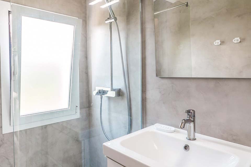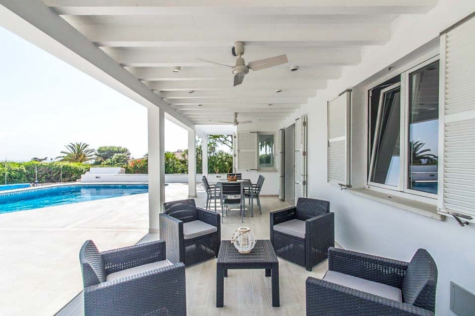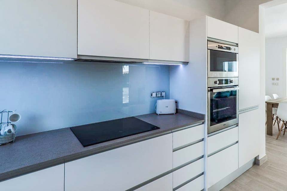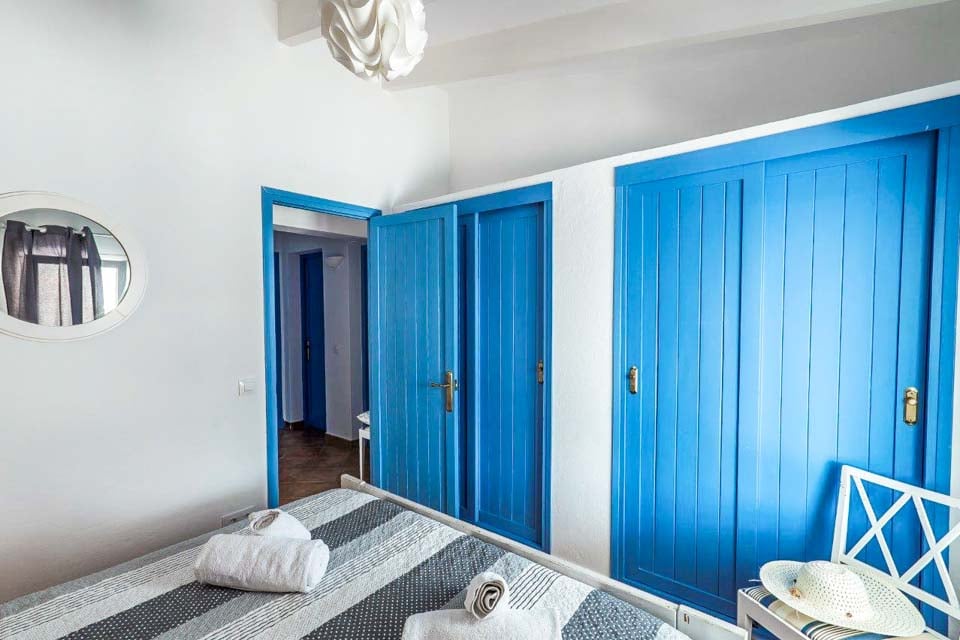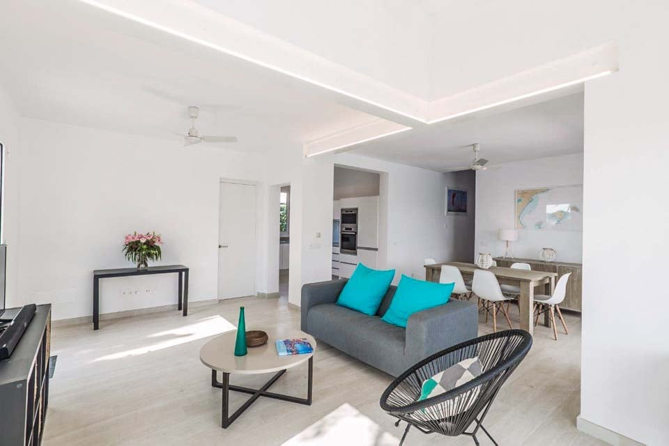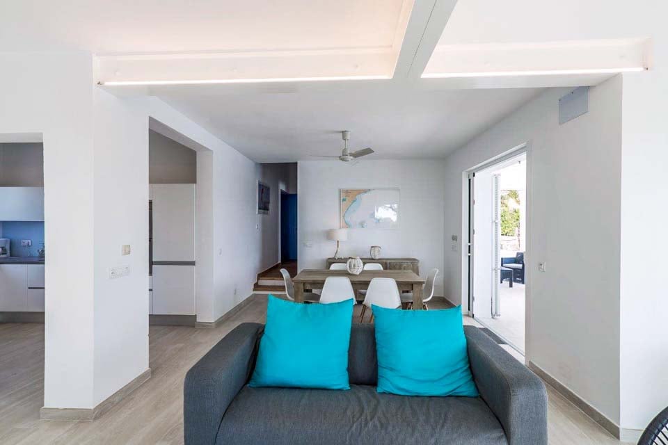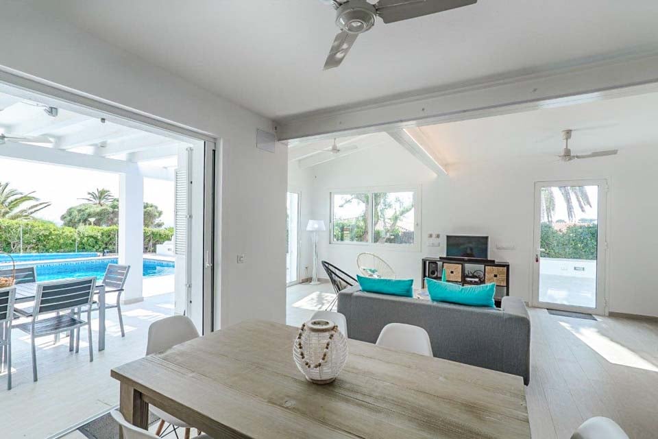 Huset smelter vakkert inn i den hvitkalkede arkitekturen i byen, med lys hvit stukkatur og skogkledde skodder. I stuen fortsetter den lyse fargepaletten, med nymalte vegger og myke grå sofaer, blandet med sprut av levende blå puter, et dristig spisebord i tre, alt dekorert med minimalisme og enkelhet. Kjøkkenet er i moderne stil og består av elegante hvite skap og en dobbel ovn i rustfritt stål. Det ene soverommet med 2 enkeltsenger og de to dobbeltrommene har klimaanlegg for å kjøle deg ned fra den spanske varmen, og kan komfortabelt sove opptil seks voksne. De store glassskyvedørene bringer utsiden inn, med direkte utgang til terrasse fra stue og spisestue. Gå ut for å bli møtt av en stor, hvit steinterrasse dekket med palmer, som fyller rommet med en eksotisk ro. Ettermiddager på Villa Eva er noe spesielt, fylt med fredelige svømmeturer i de ovale bassengene, slikker solen på en solseng eller spiser lunsj ved det pergola-skyggefulle spisebordet.