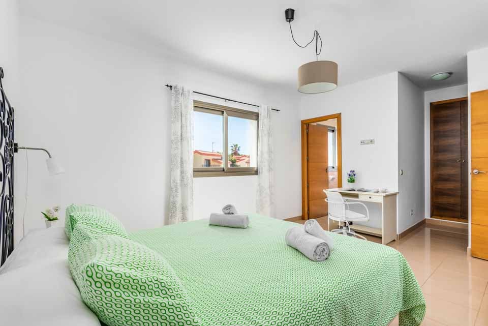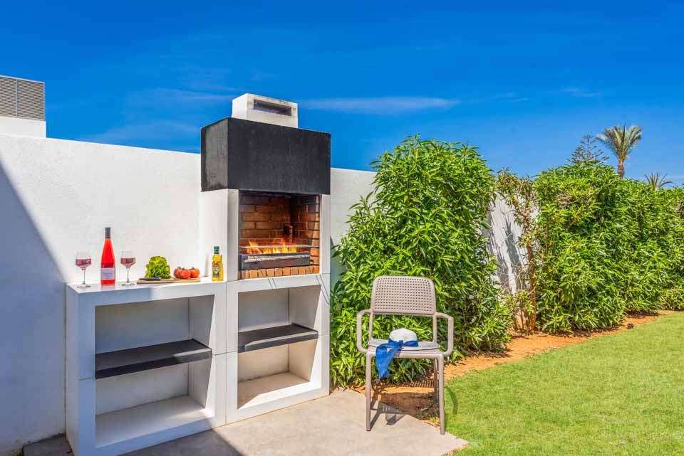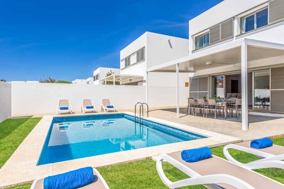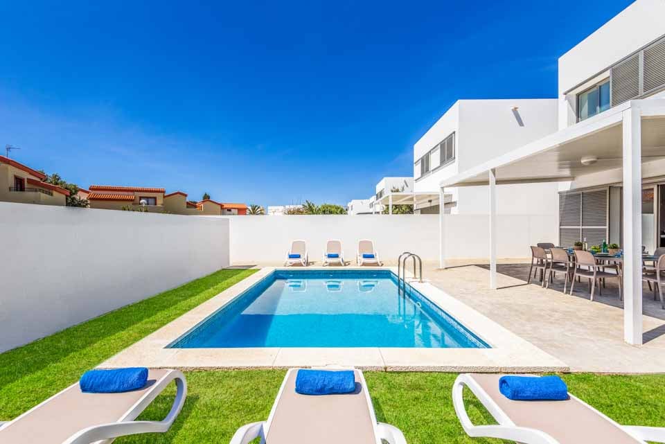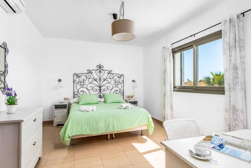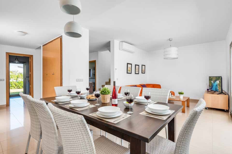 Hvert av de fire romslige soverommene har klimaanlegg og garderober, og deler tre komplette bad mellom dem. I første etasje har stue/spisestue med åpen planløsning også klimaanlegg og store glassdører som fører direkte ut på terrassen, slik at du kan kjøle deg ned på sofaen mens du ser ut på ditt private basseng. Rundt bassenget er det god plass for soling, samt et stort overbygd område perfekt for å nyte utendørsservering.