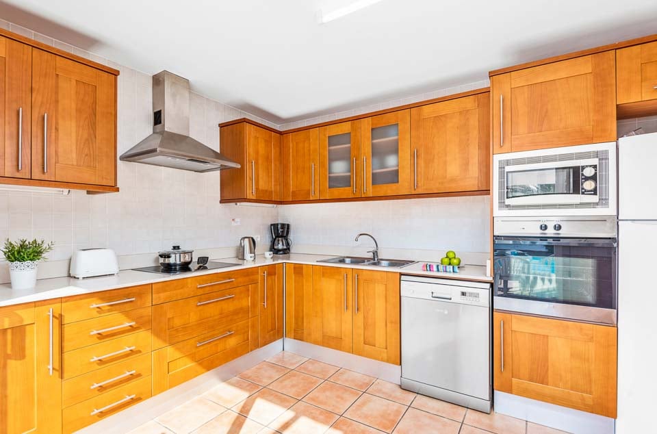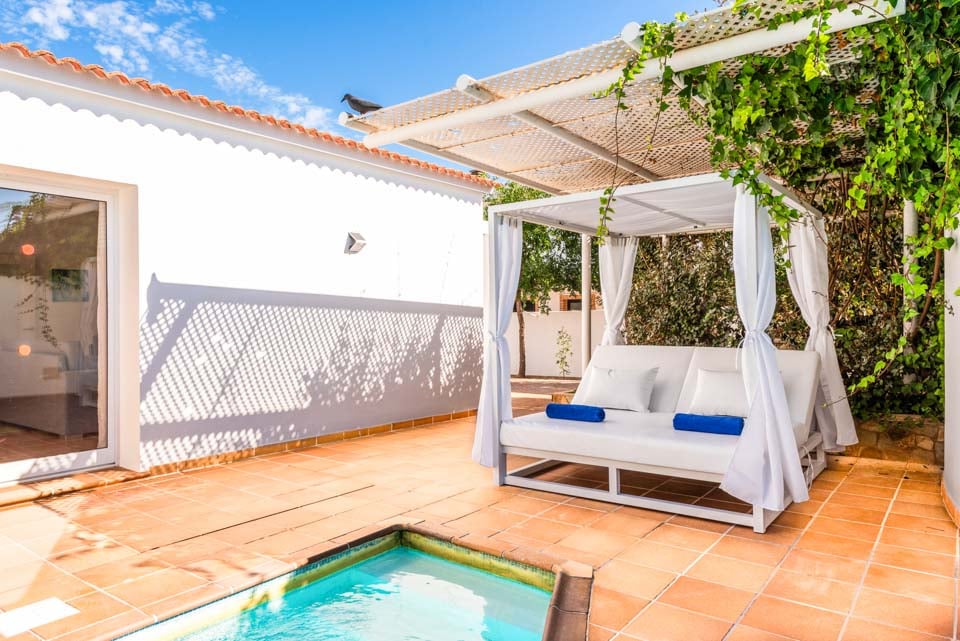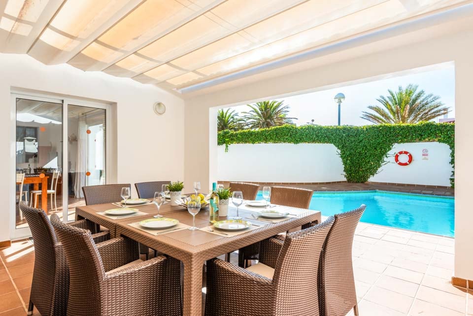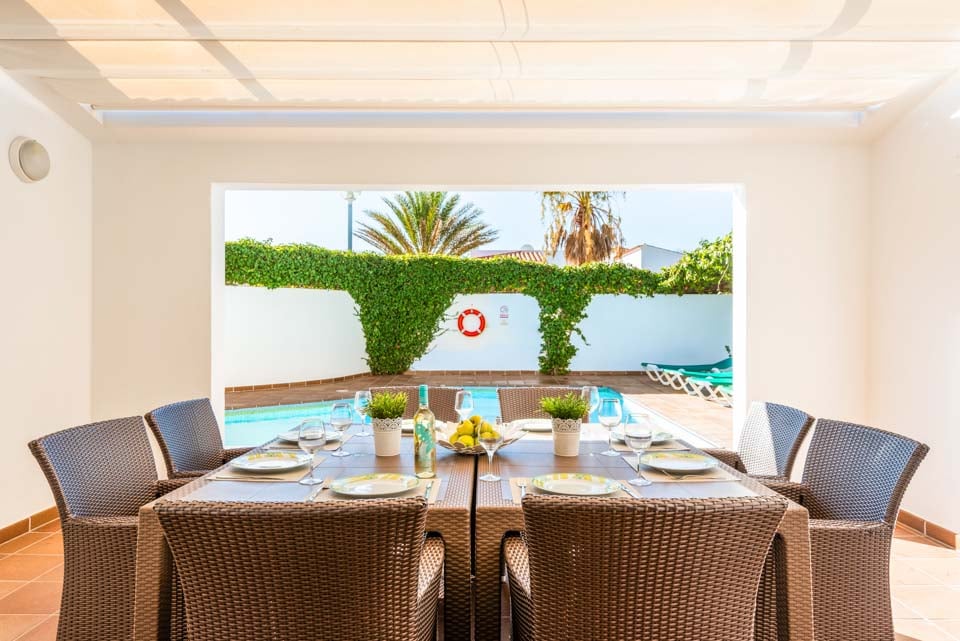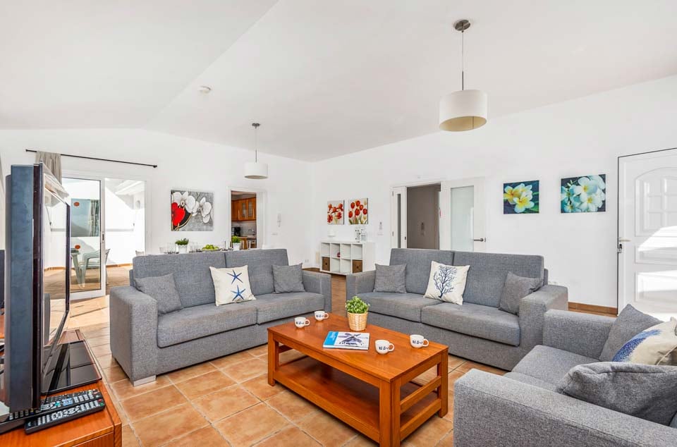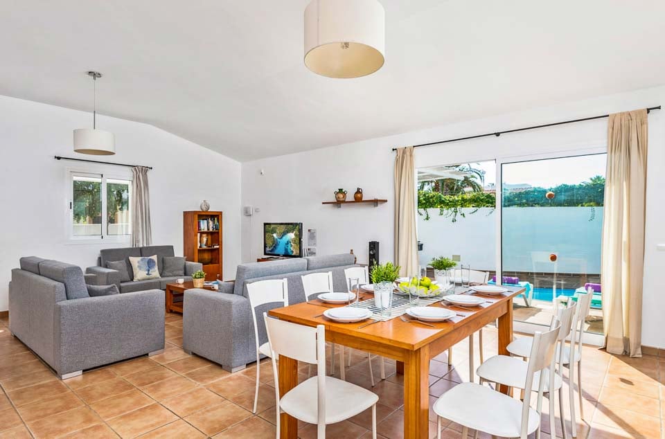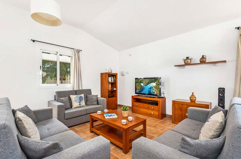 Tilbake ved villaen er det trekantede bassenget kantet med høye vegger for privatliv med en murgrill på terrassen når du bare vil slappe av hjemme. Innvendig er rommene smakfullt innredet med komfortable møbler for å hjelpe deg å føle deg hjemme. Det er fire soverom, hvorav to har eget bad og et separat bad som de andre kan dele. Det romslige kjøkkenet har store glassdører som fører direkte ut på terrassen som gjør uteservering til en lek. Perfekt for en sommerferie.