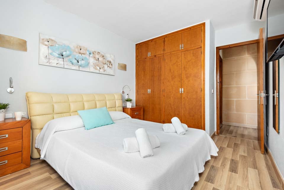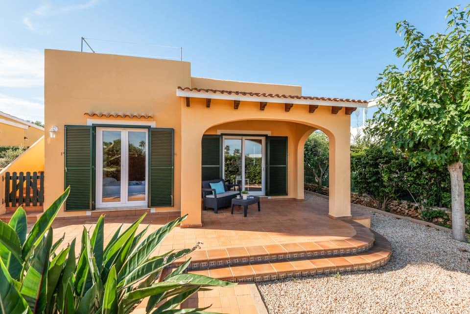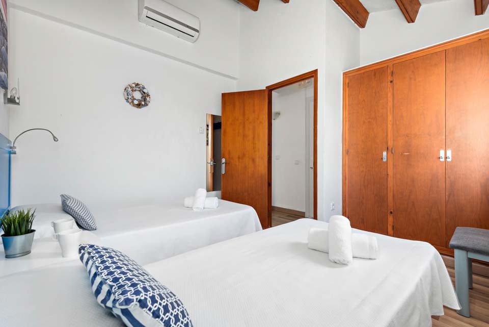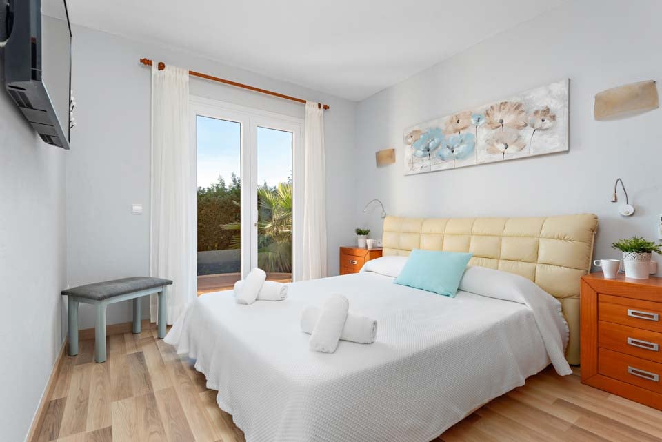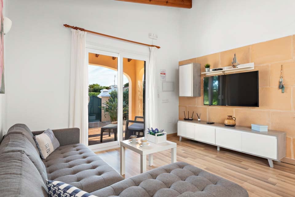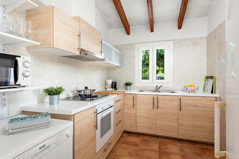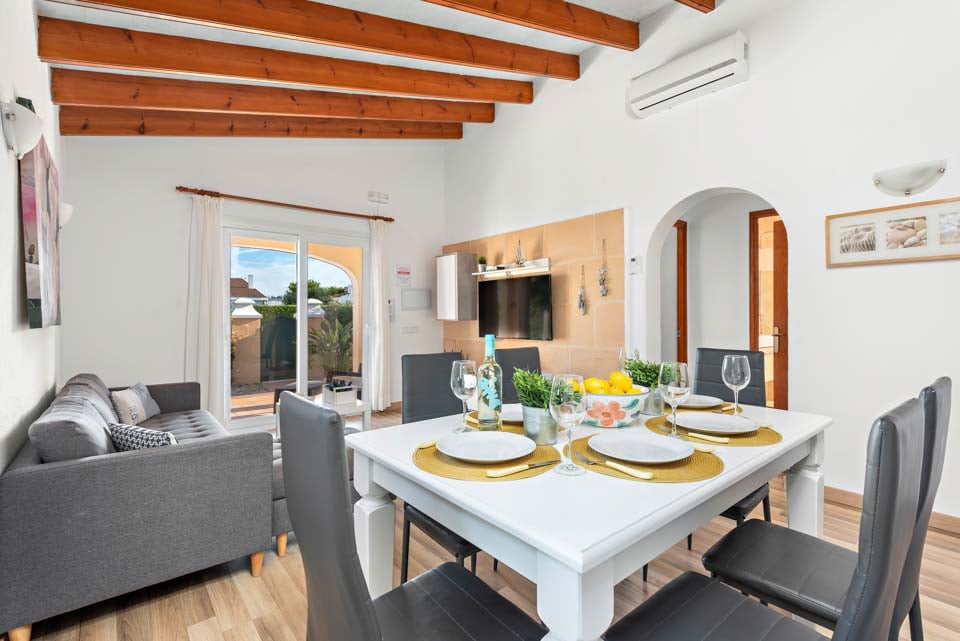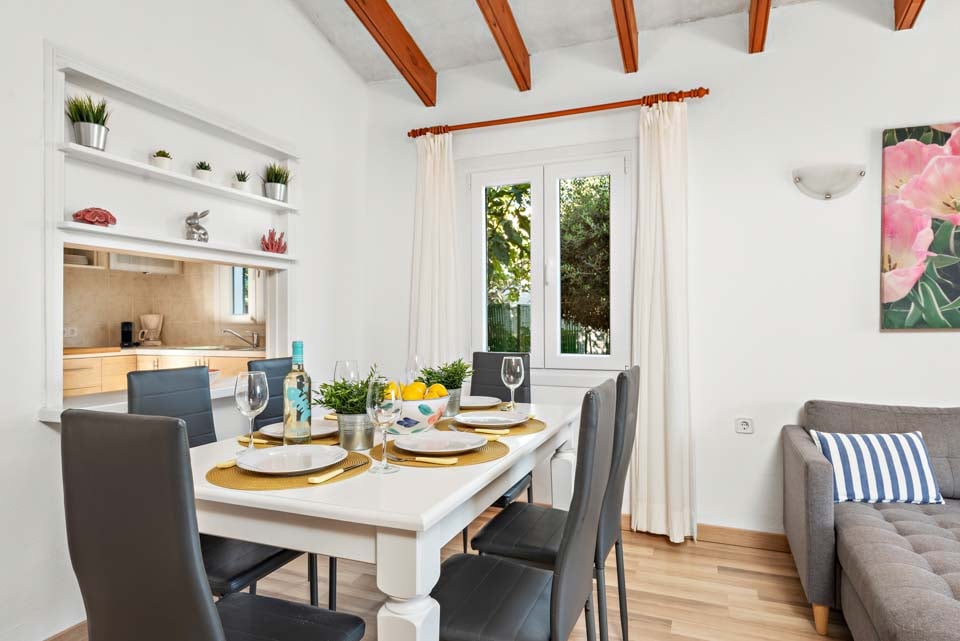 Huset er klassisk middelhavs innvendig og utvendig, med myke ferskenmalte vegger, levende grønne skodder og en struktur med dekadente buer. Interiøret gjenspeiler øyas tradisjonelle stemning, men blandes inn i en smak av moderne. I stuen komplementerer de rustikke steinveggene de elegante møblene og den glatte, hvite underholdningsenheten. Det nøytrale fargevalget skaper en fredelig atmosfære hele veien. Matelskere vil være i sitt rette element med sitt lyse, moderne kjøkken med sine skinnende treskap og avanserte hvitevarer. To soverom har klimaanlegg for å kjøle deg ned fra den spanske varmen.