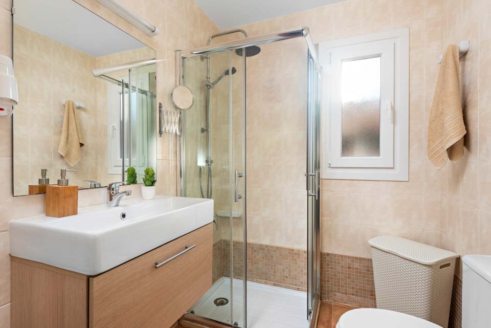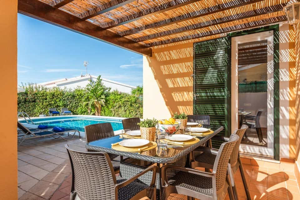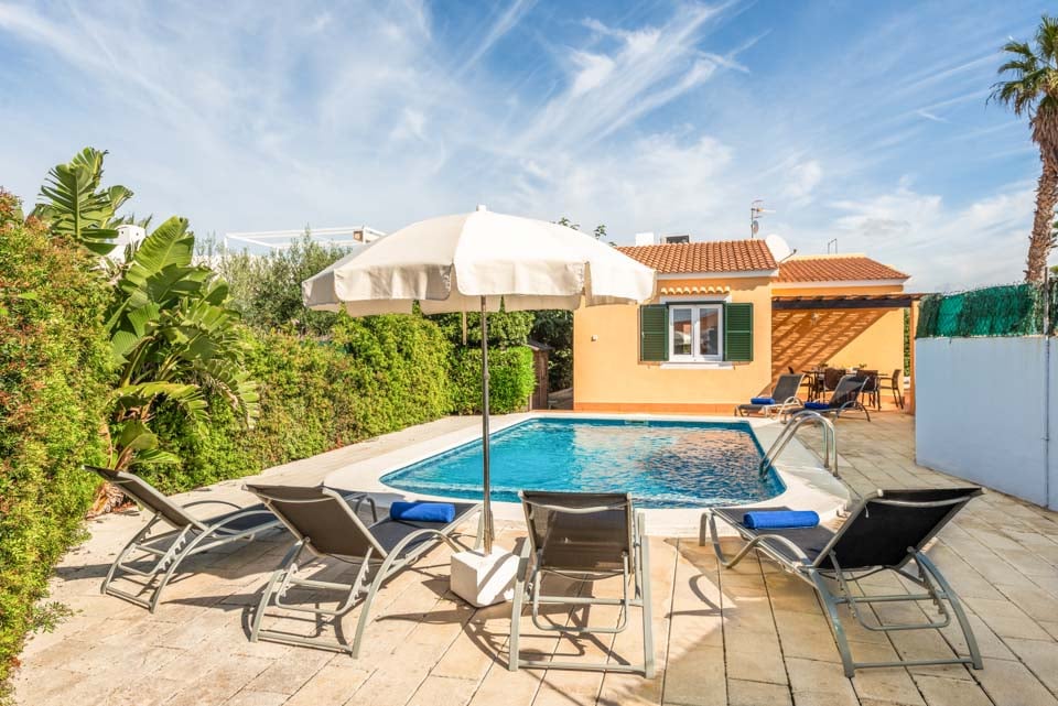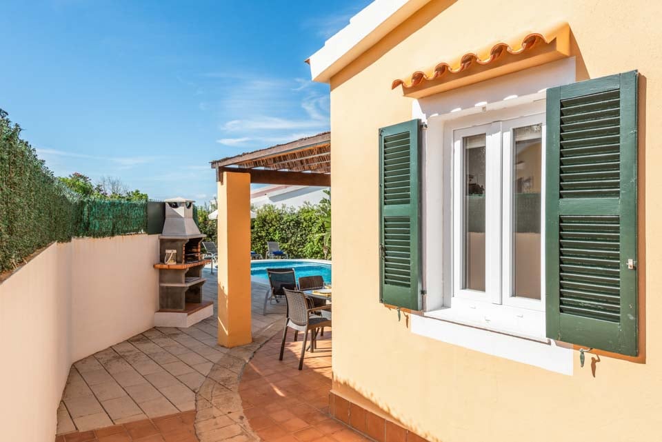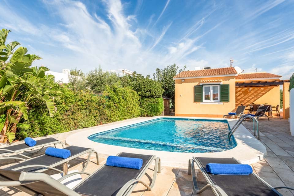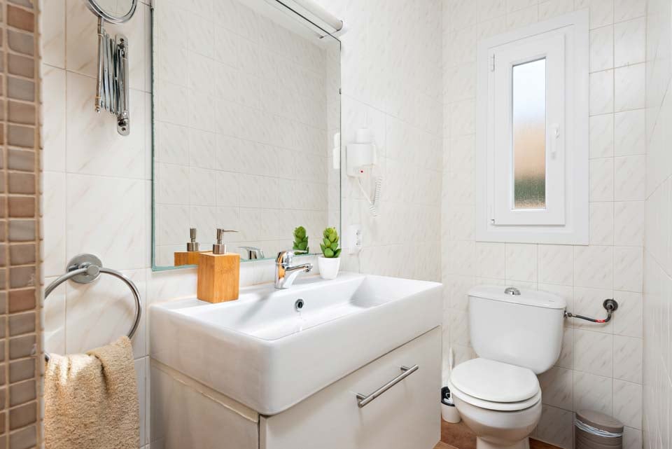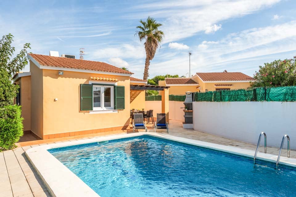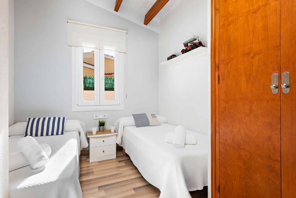 Huset er klassisk middelhavs innvendig og utvendig, med myke ferskenmalte vegger, levende grønne skodder og en struktur med dekadente buer. Interiøret gjenspeiler øyas tradisjonelle stemning, men blandes inn i en smak av moderne. I stuen komplementerer de rustikke steinveggene de elegante møblene og den glatte, hvite underholdningsenheten. Det nøytrale fargevalget skaper en fredelig atmosfære hele veien. Matelskere vil være i sitt rette element med sitt lyse, moderne kjøkken med sine skinnende treskap og avanserte hvitevarer. To soverom har klimaanlegg for å kjøle deg ned fra den spanske varmen.
