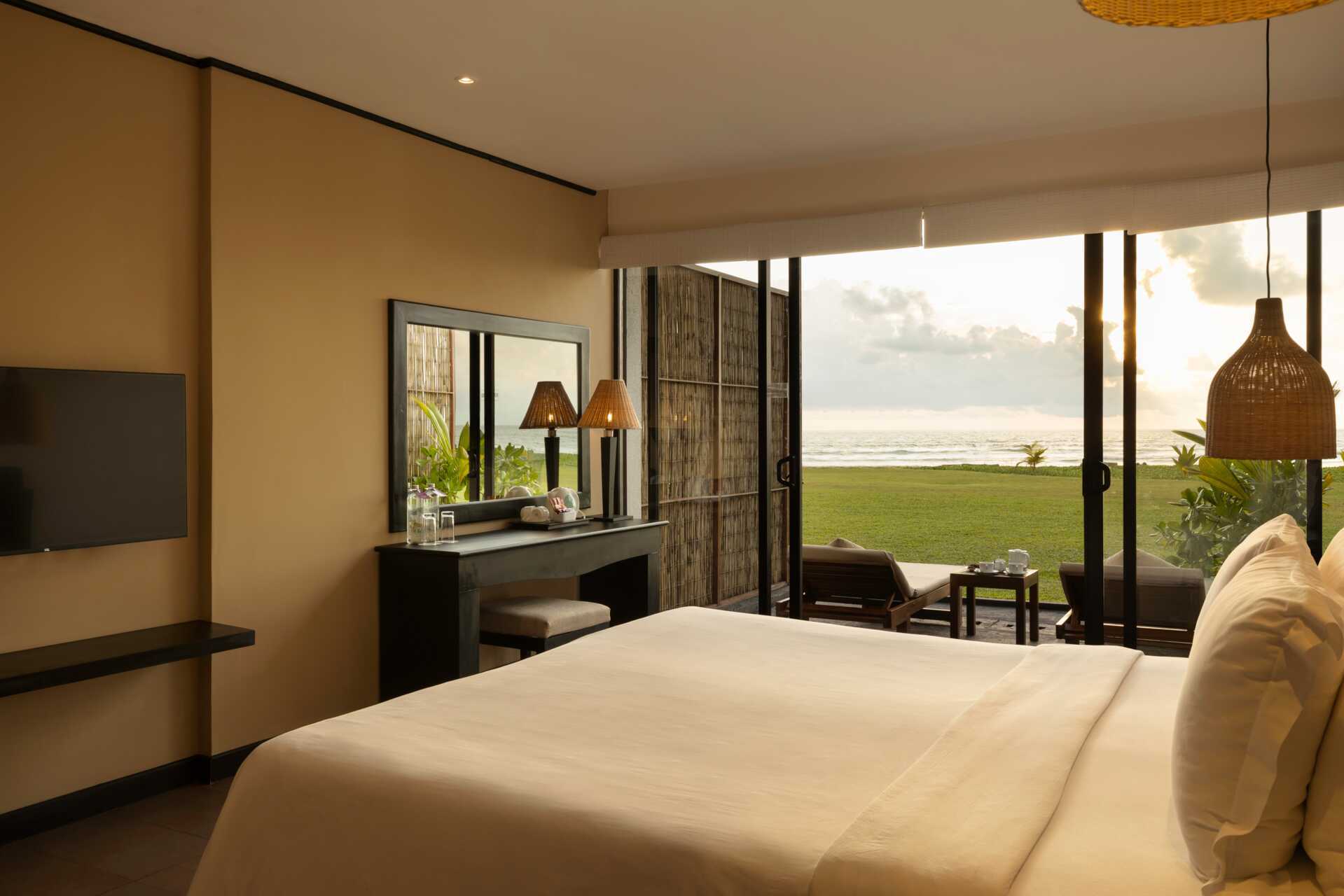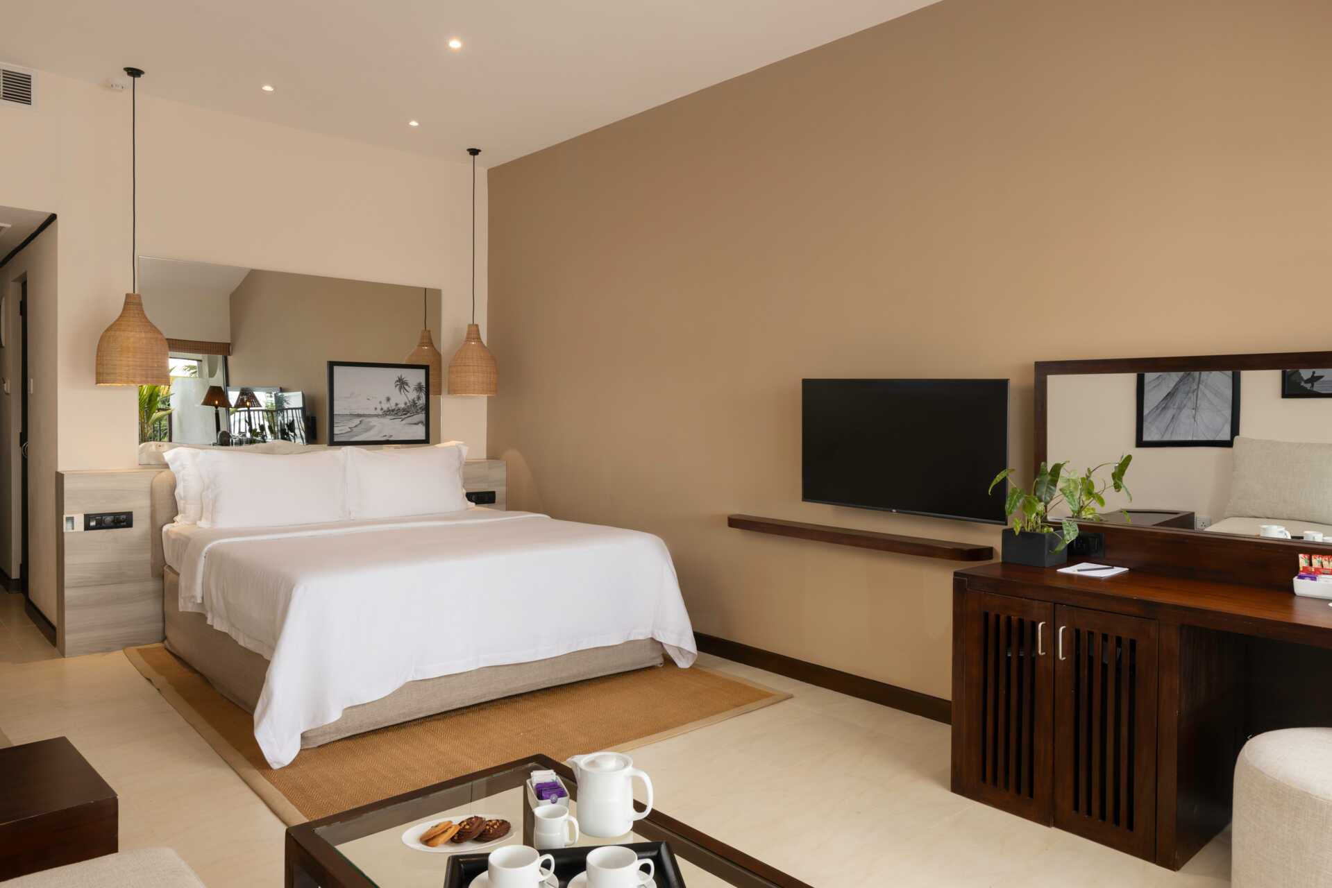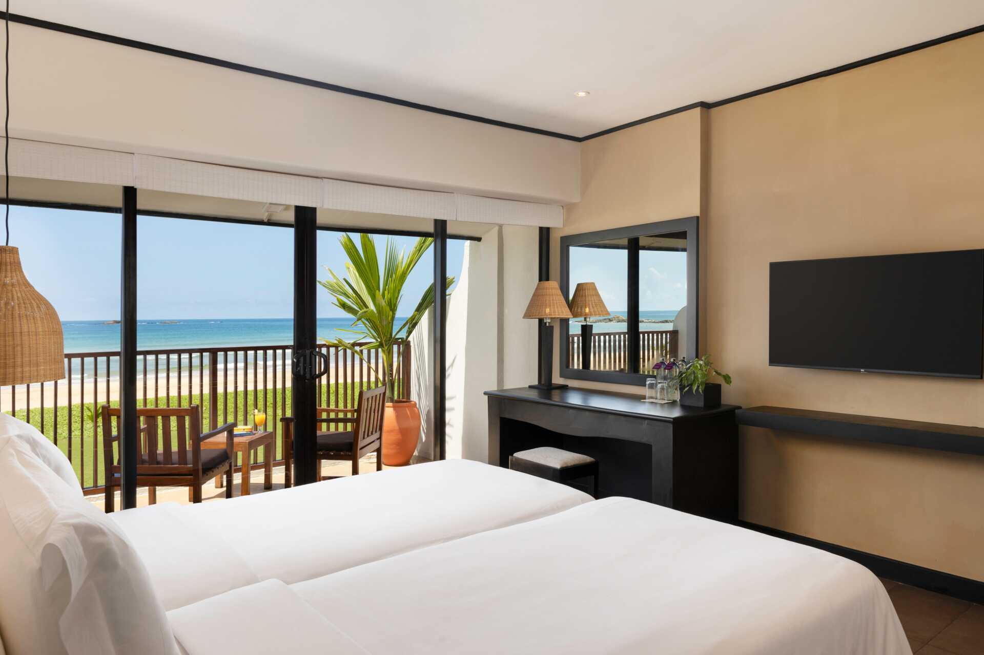 Deluxerom med balkong og havutsikt. En dobbeltseng eller to enkeltsenger. Wifi, luftkondisjonering og safe inkludert. Lite kjøleskap. TV. Hårføner. Dusj og wc. Rengjøring 7 ggr/uke.