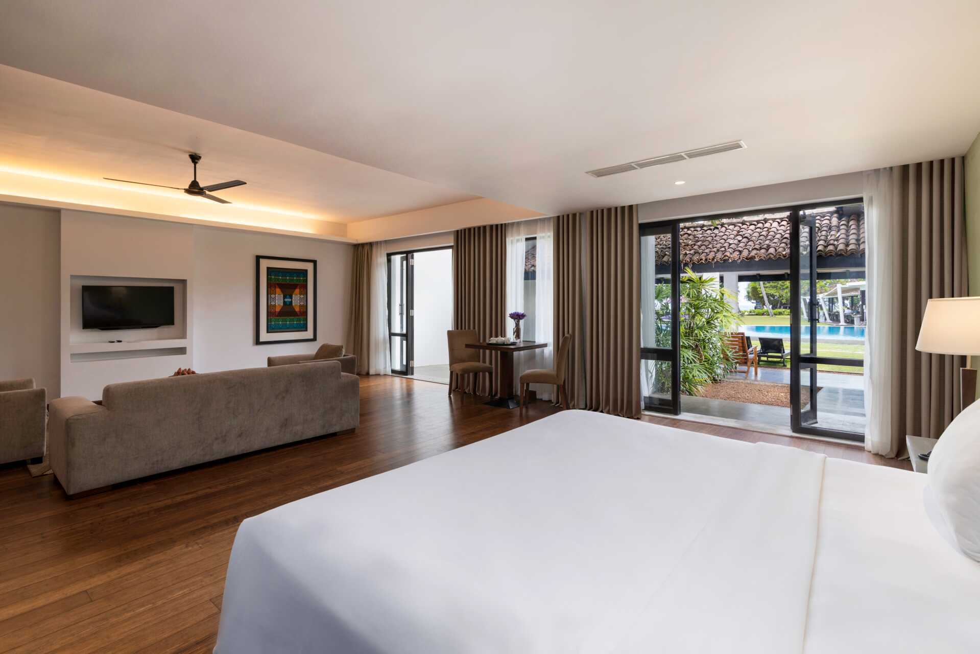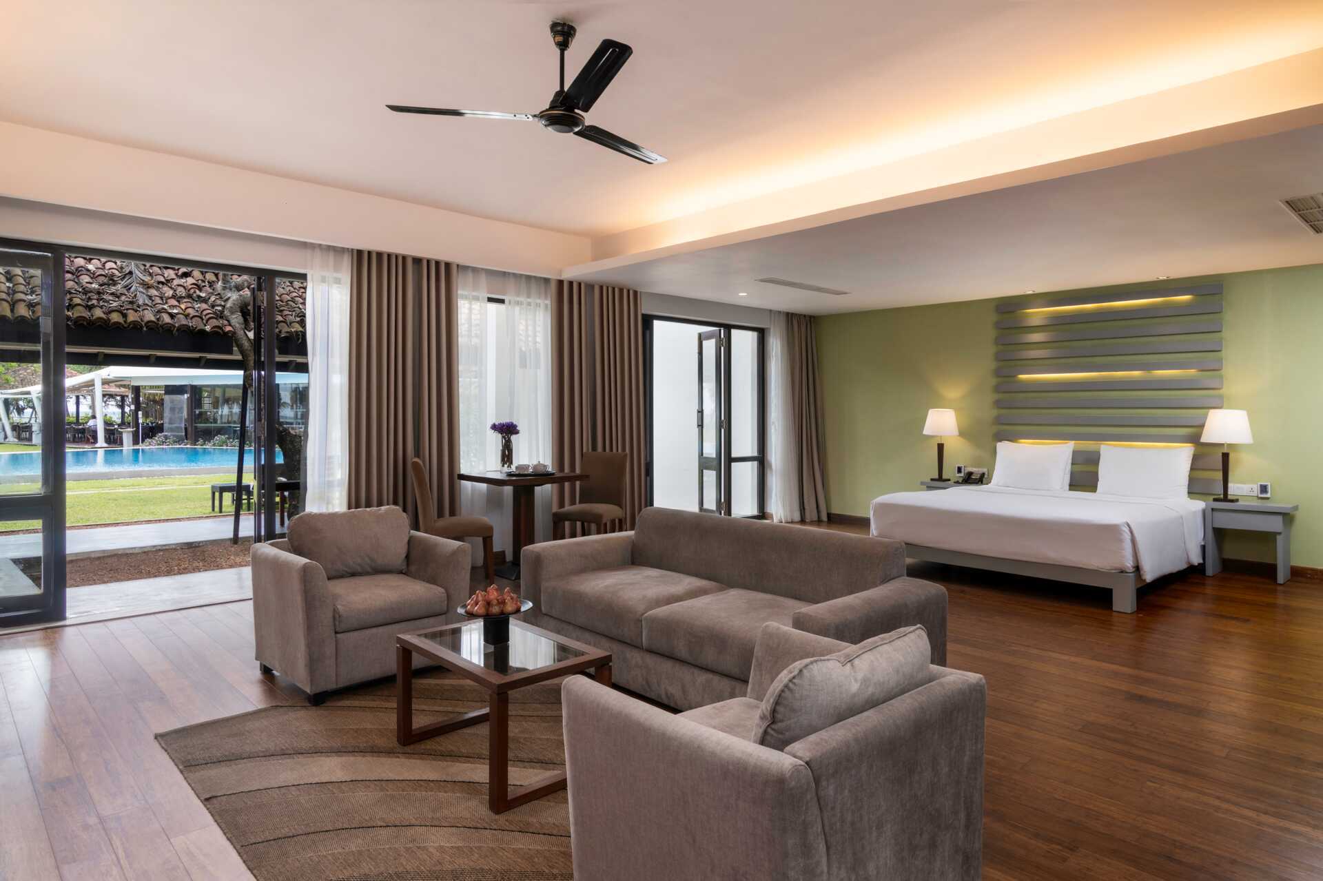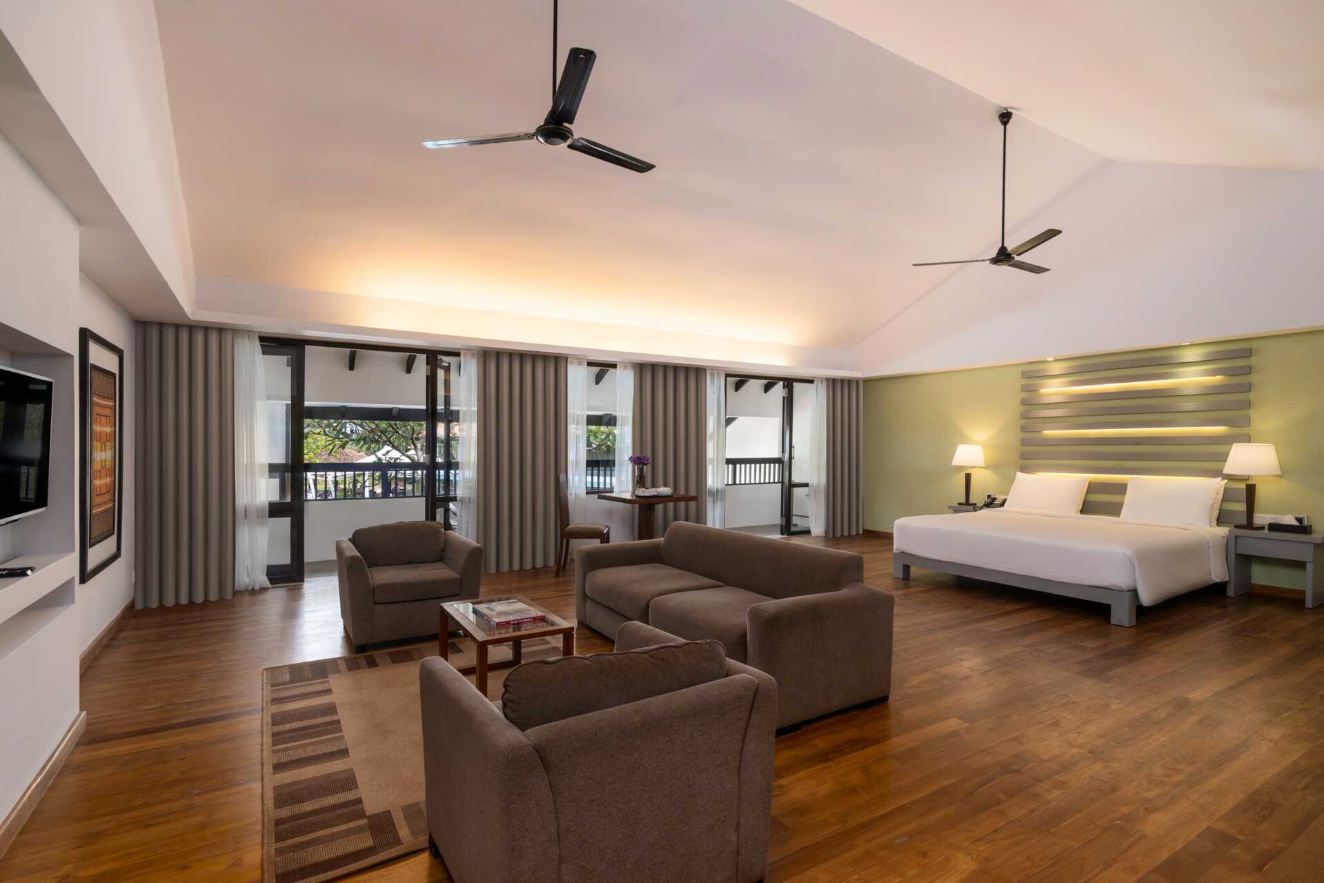 Deluxerom med balkong og havutsikt. En dobbeltseng eller to enkeltsenger. Wifi, luftkondisjonering og safe inkludert. Minibar. Espressomaskin. Vannkoker samt kaffe og te. TV. Hårføner. Bad med badekar, dusj og wc. Rengjøring 7 ggr/uke.