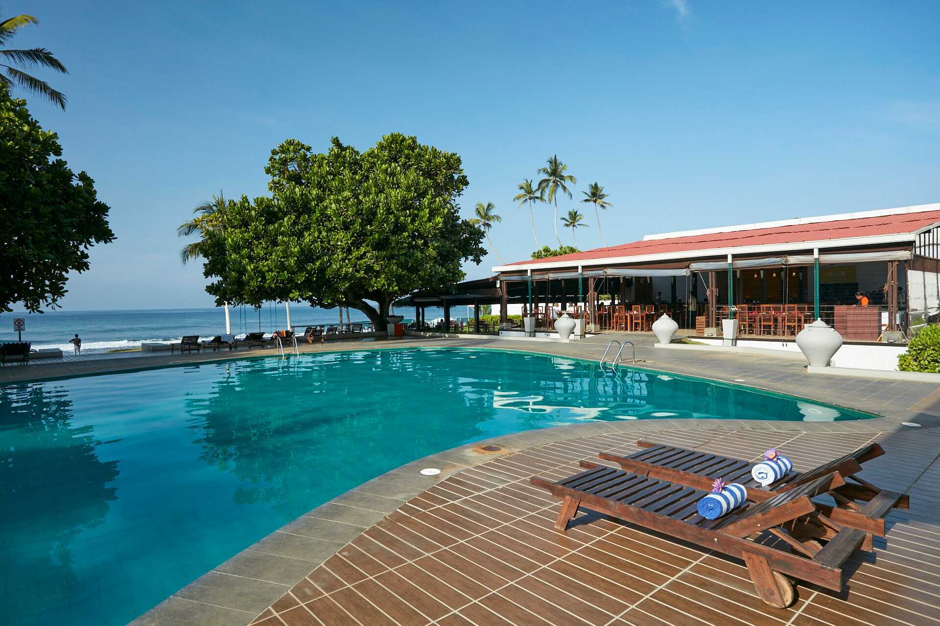 I bassengområdet på Citrus Hikkaduwa er det et basseng, solsenger og parasoller. Bassenghåndklær inkludert. Herfra er det bare noen skritt å gå til stranden. Rett frem er det koraller og steiner i vannet, men går du litt til venstre eller høyre så er det sandbunn. Stranden strekker seg flere kilometer bortover. Her kan du gå i timer eller dykke ned til korallene som du finner bare noen svømmetak fra stranda. På stranden er det også restauranter, barer og selgere som selger solmoden frukt.