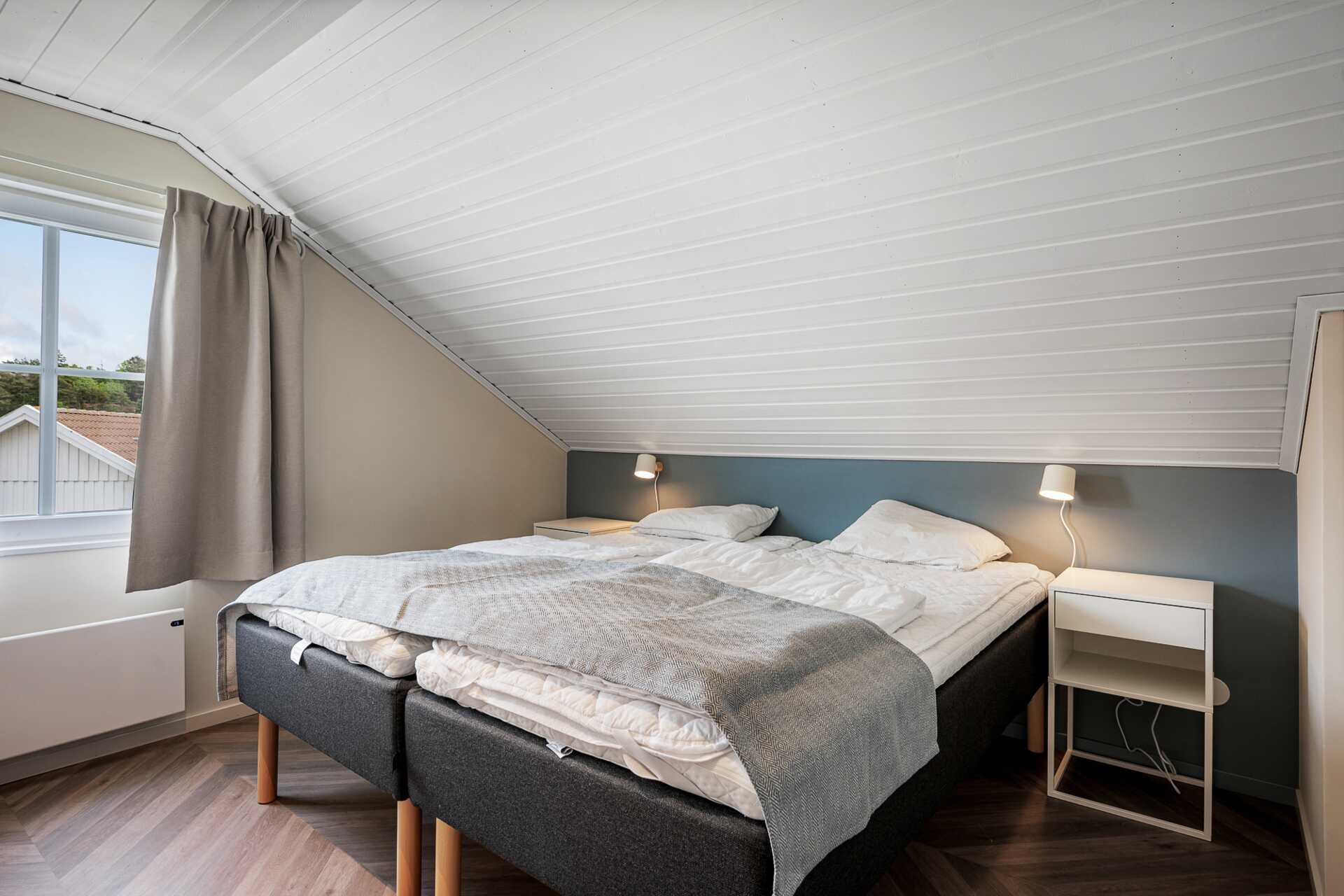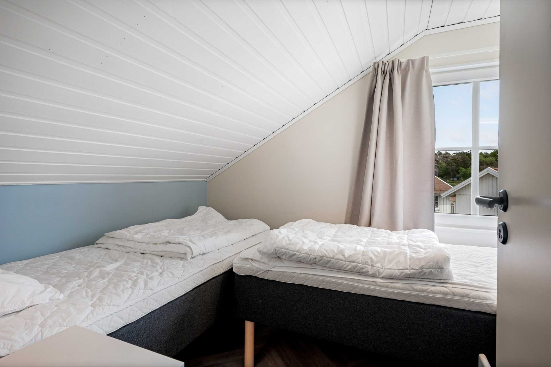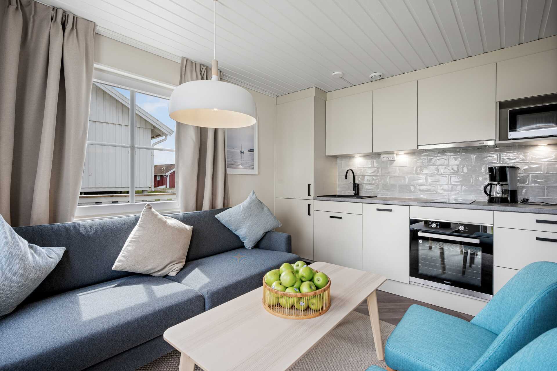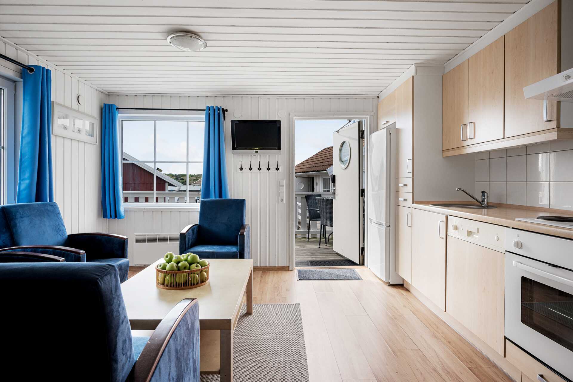 TanumStrands skipperhytter med markterrasse. Tre soverom, ett nede og to oppe. Et soverom med dobbeltseng og et soverom med to enkeltsenger. Stue med minikjøkken. Kjøkkenet er fullt utstyrt med kjøleskap, fryser, komfyr, stekeovn, vannkoker, kaffetrakter, mikrobølgeovn og oppvaskmaskin samt enkel kjøkkenutstyr. Spisebord med kjøkkenbord, sofa og TV. Wifi inkludert. Bad med dusj og wc.