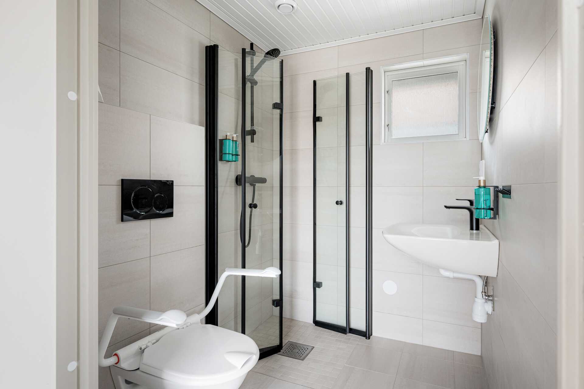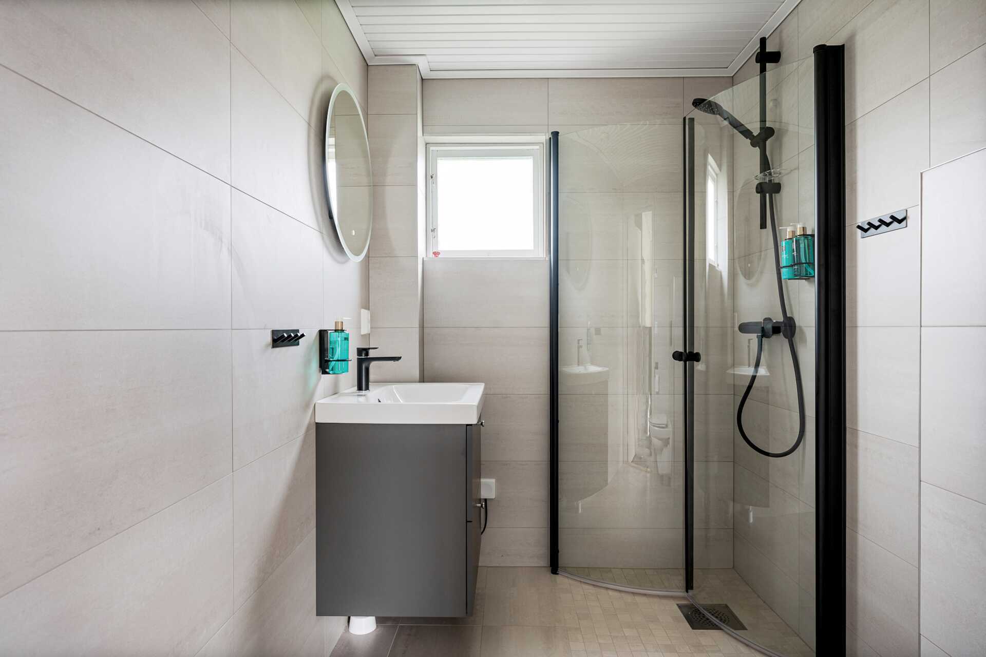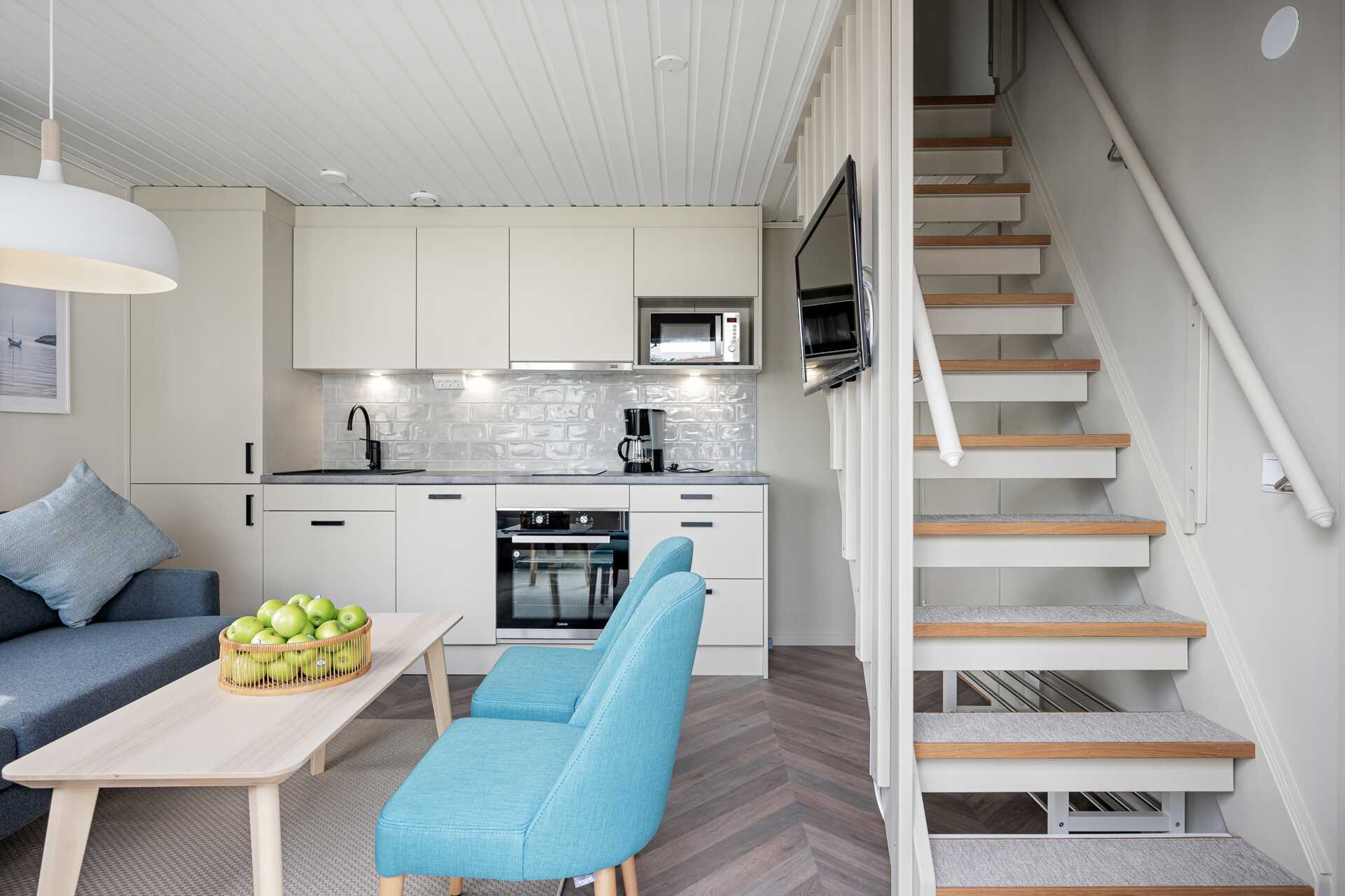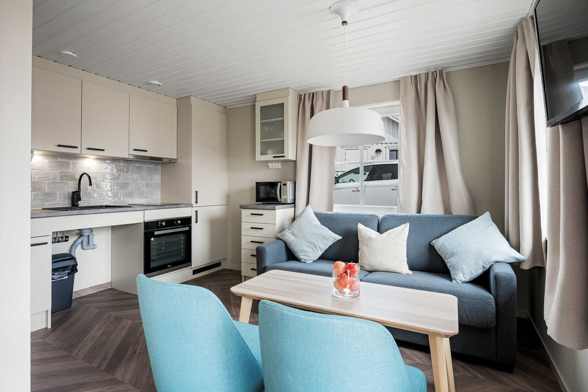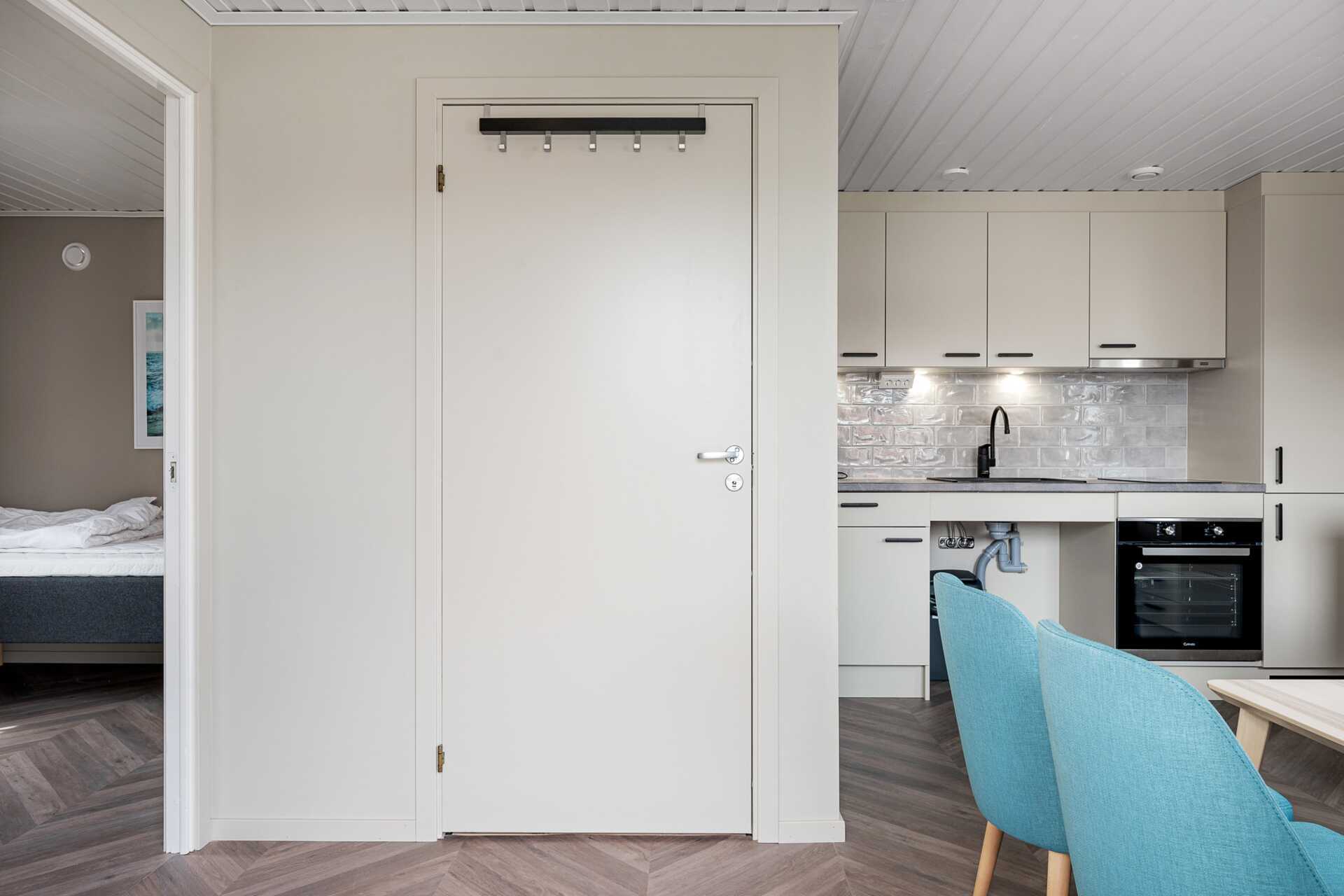 TanumStrands skipperhytter med markterrasse. Tre soverom, ett nede og to oppe. Et soverom med dobbeltseng og et soverom med to enkeltsenger. Stue med minikjøkken. Kjøkkenet er fullt utstyrt med kjøleskap, fryser, komfyr, stekeovn, vannkoker, kaffetrakter, mikrobølgeovn og oppvaskmaskin samt enkel kjøkkenutstyr. Spisebord med kjøkkenbord, sofa og TV. Wifi inkludert. Bad med dusj og wc.