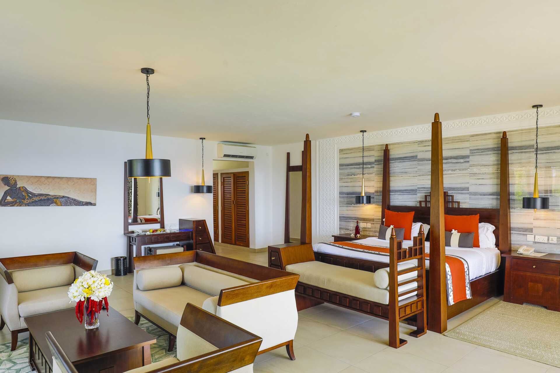 Suite med balkong eller terrasse og havutsikt. En dobbeltseng. Mulig med ekstraseng i enkeltseng. Wifi, luftkondisjonering og safe inkludert. Kjøleskap. Vannkoker samt kaffe og te. Fransk presskanne. TV. Hårføner. Bad med to servanter, badekar, separat dusj og wc. Rengjøring 7 ggr/uke.