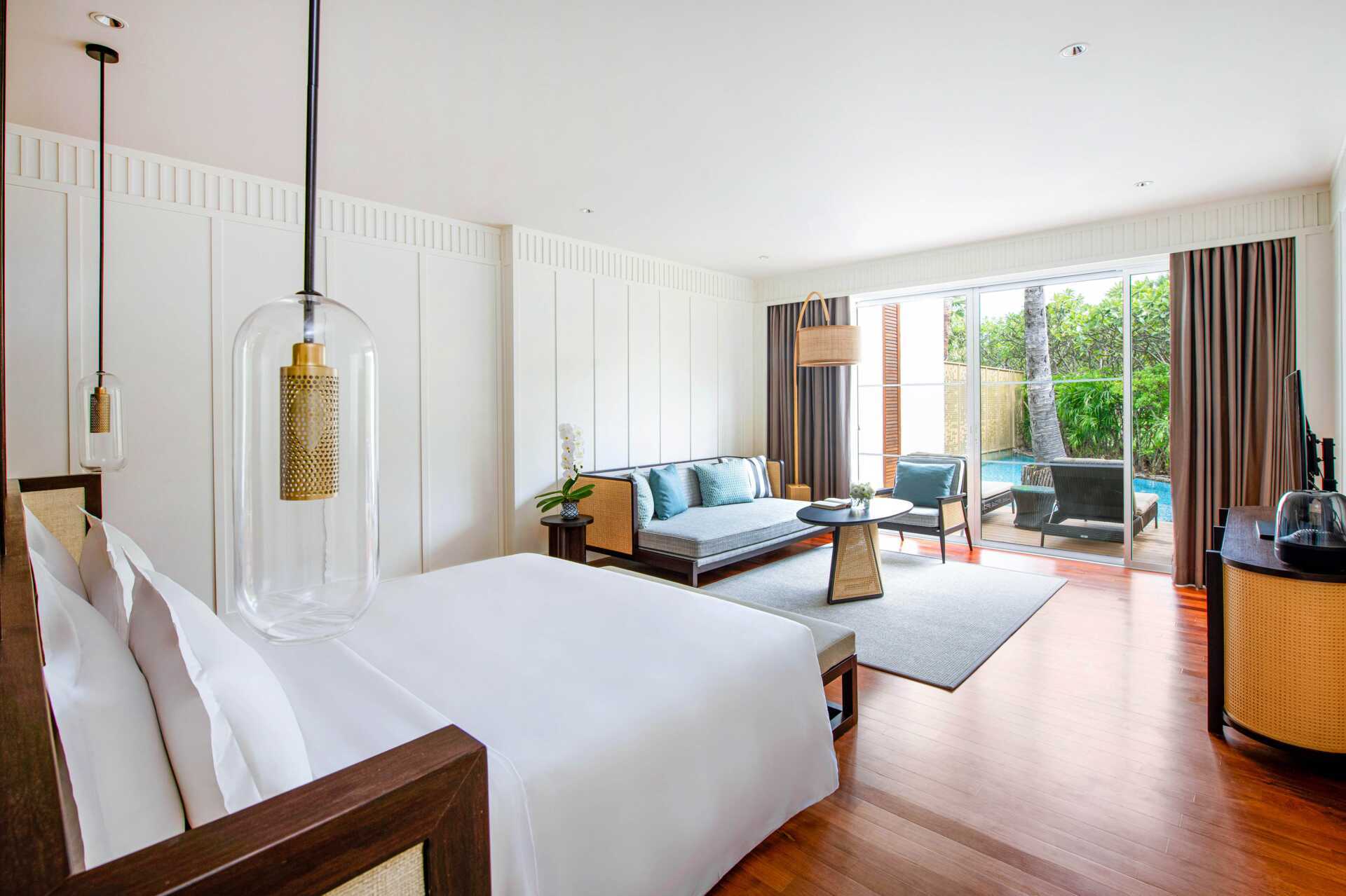 Poolsuite med eget basseng på uteplassen. Det er to solsenger på uteplassen. Suiten ligger i Beach Wing. En dobbeltseng eller to enkeltsenger. Mulig med ekstraseng til én person. Wifi, luftkondisjonering og safe inkludert. Minibar, en flaske vann per dag inkludert. Vannkoker samt kaffe og te. TV. Strykejern og strykebrett. Badekåper og tøfler Hårføner. Baderom med badekar, separat dusj og wc. Rengjøring 7 ggr/uke. Barn under 2 år regnes inn i maksantallet i rommet.