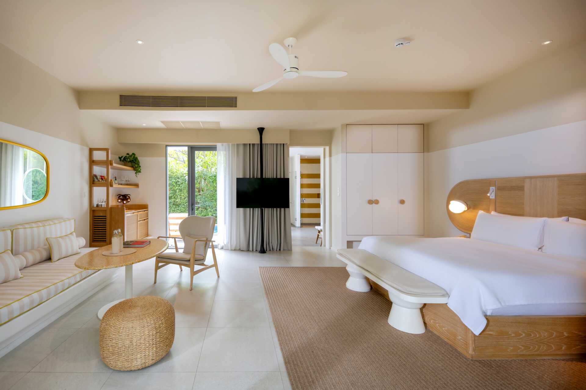 Dobbeltrom i bungalow med uteplass, hage med soldekk og eget basseng. Ved bassenget er det to solsenger med madrasser og bassenghåndklær. En dobbeltseng. Mulig med ekstraseng i en dagseng/enkeltseng. Wifi, luftkondisjonering og safe inkludert. Kjøleskap. TV. Bluetooth høyttaler. Badekåper og tøfler. Hårføner. Bad med badekar, separat dusj og separat wc. Rengjøring 7 ggr/uke.