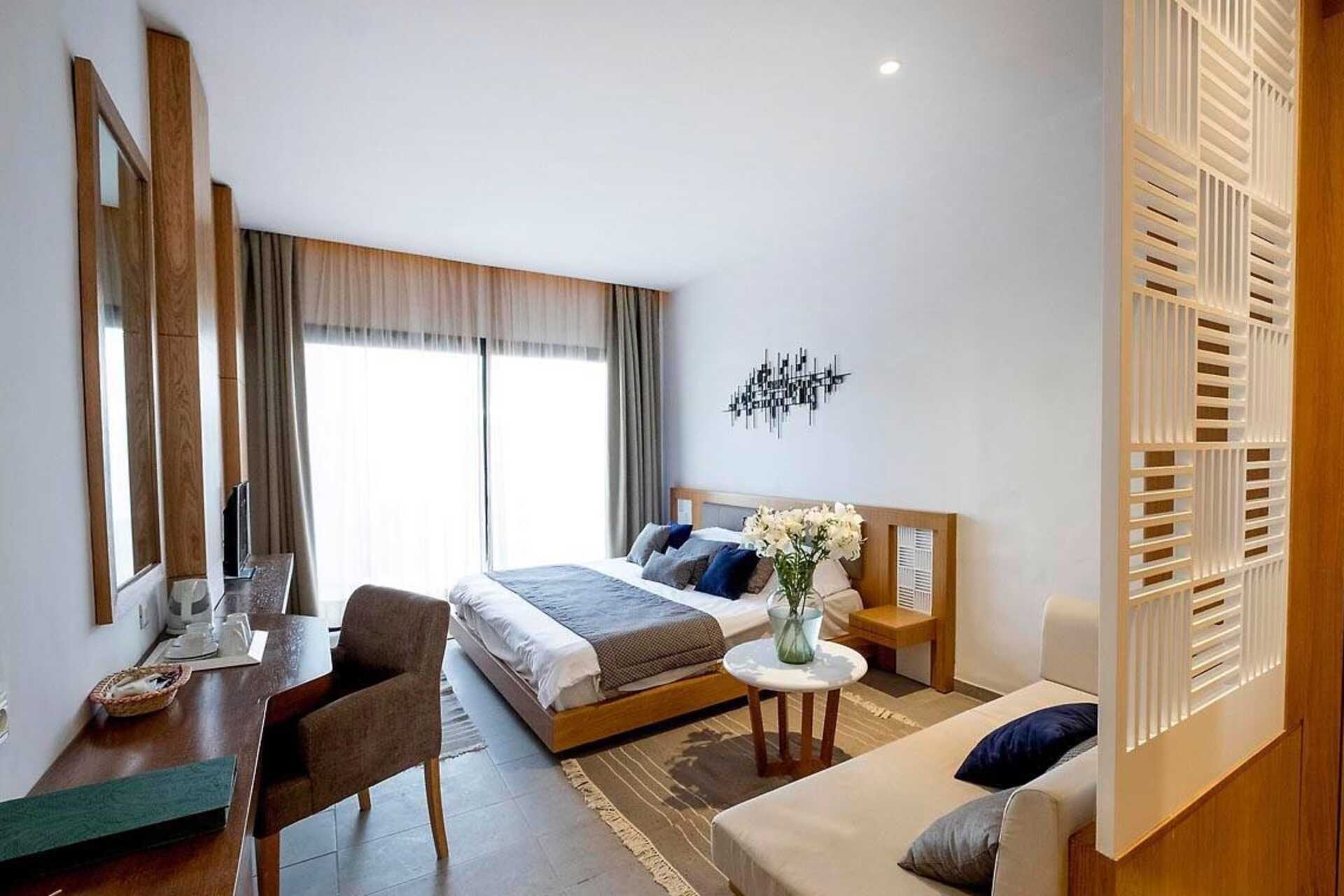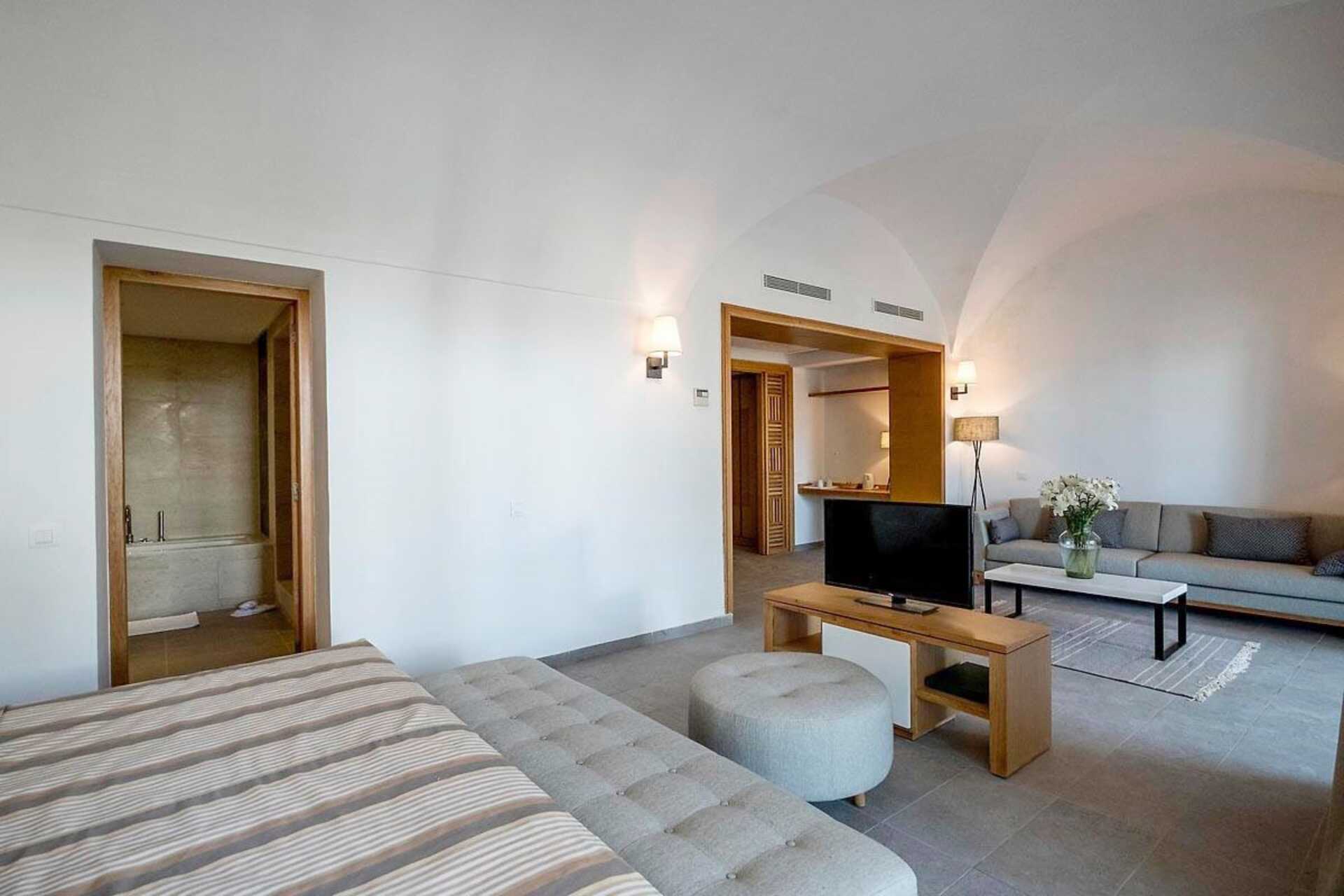 Suite med balkong eller terrasse. I suiten er det dobbeltseng og sofagruppe. Mulig med ekstraseng i sovesofa. Wifi, luftkondisjonering og safe inkludert. Kjøleskap. Kaffetrakter. TV. Badekåper og tøfler. Hårføner. Badekar, separat dusj og wc. Rengjøring 7 ggr/uke. Barn under 2 år regnes inn i maksantallet i rommet.