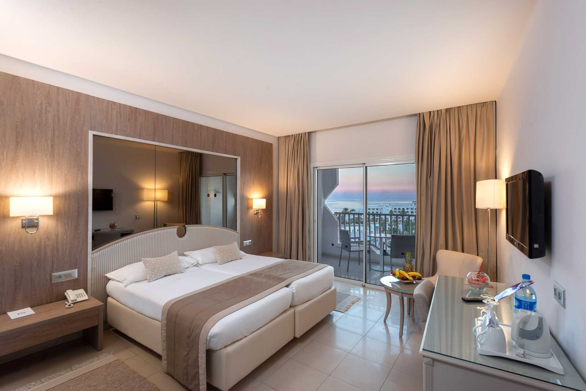 Deluxerom med balkong og havutsikt. Deluxerommet består av et soverom og en stue med sofa, bord og stoler. En dobbeltseng. Mulig med ekstraseng i feltseng. Wifi, luftkondisjonering og safe inkludert. Minibar mot avgift, en flaske vann er inkludert og etterfylles hver dag. TV. Hårføner. Dusj og wc. Rengjøring 7 ggr/uke.