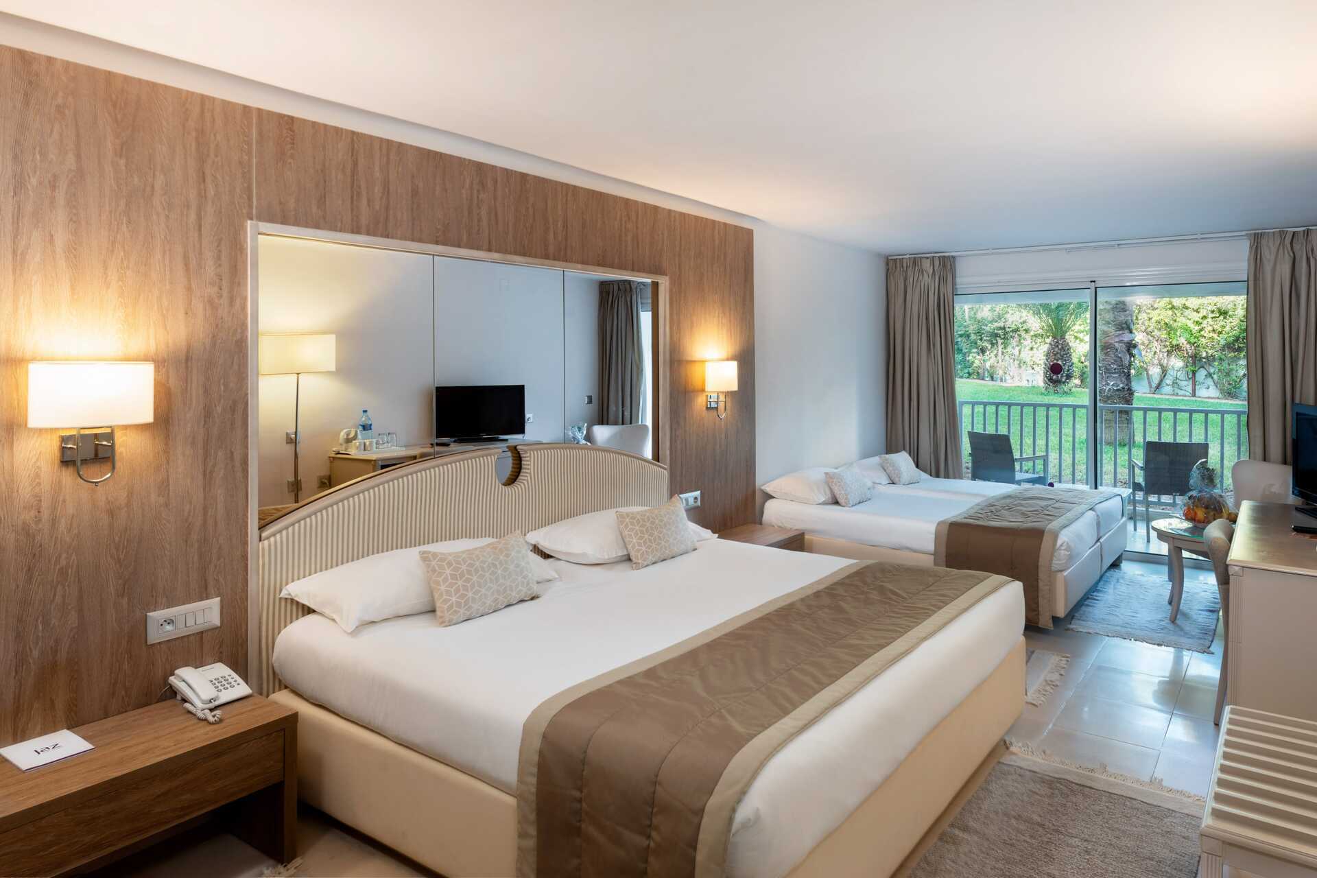 Familierom med markterrasse. En dobbeltseng. Mulig med ekstrasenger i sovesofa. Wifi, luftkondisjonering og safe inkludert. Minibar mot avgift, en flaske vann er inkludert og etterfylles hver dag. Vannkoker samt kaffe og te. TV. Hårføner. Bad med badekar og dusj og wc. Rengjøring 7 ggr/uke.