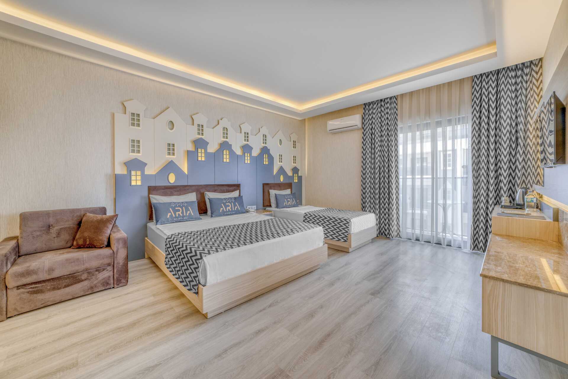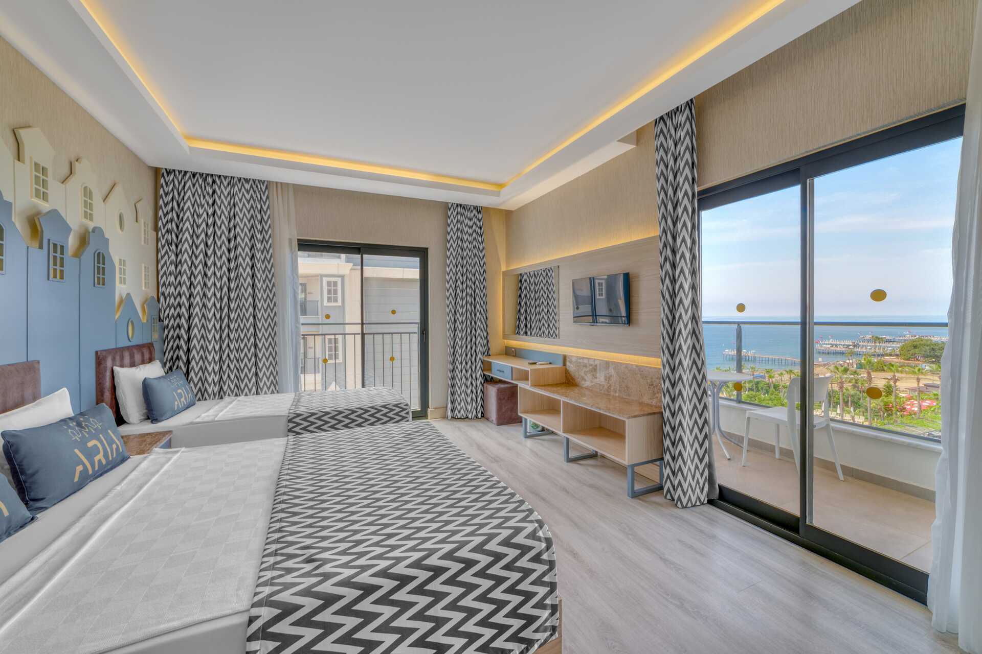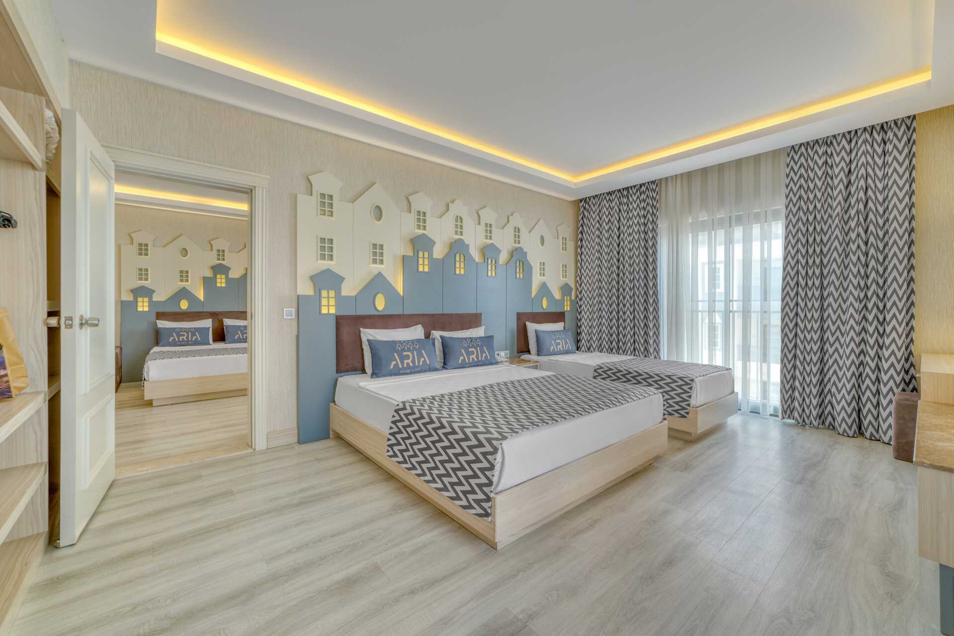 Familierom med balkong. To rom med en dobbeltseng og en enkeltseng i hvert rom. Wifi, luftkondisjonering og safe inkludert. Minibaren fylles opp med brus og vann daglig. Vannkoker samt kaffe og te. TV. Tøfler. Hårføner. To bad med dusj og wc. Rengjøring 7 ggr/uke.
