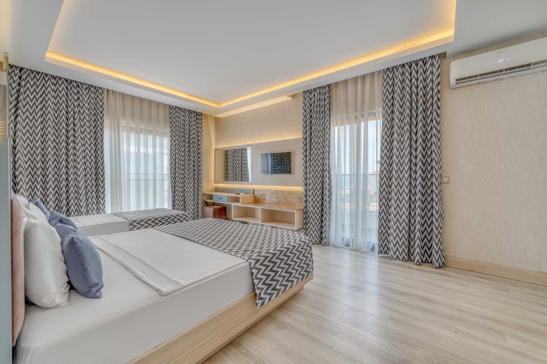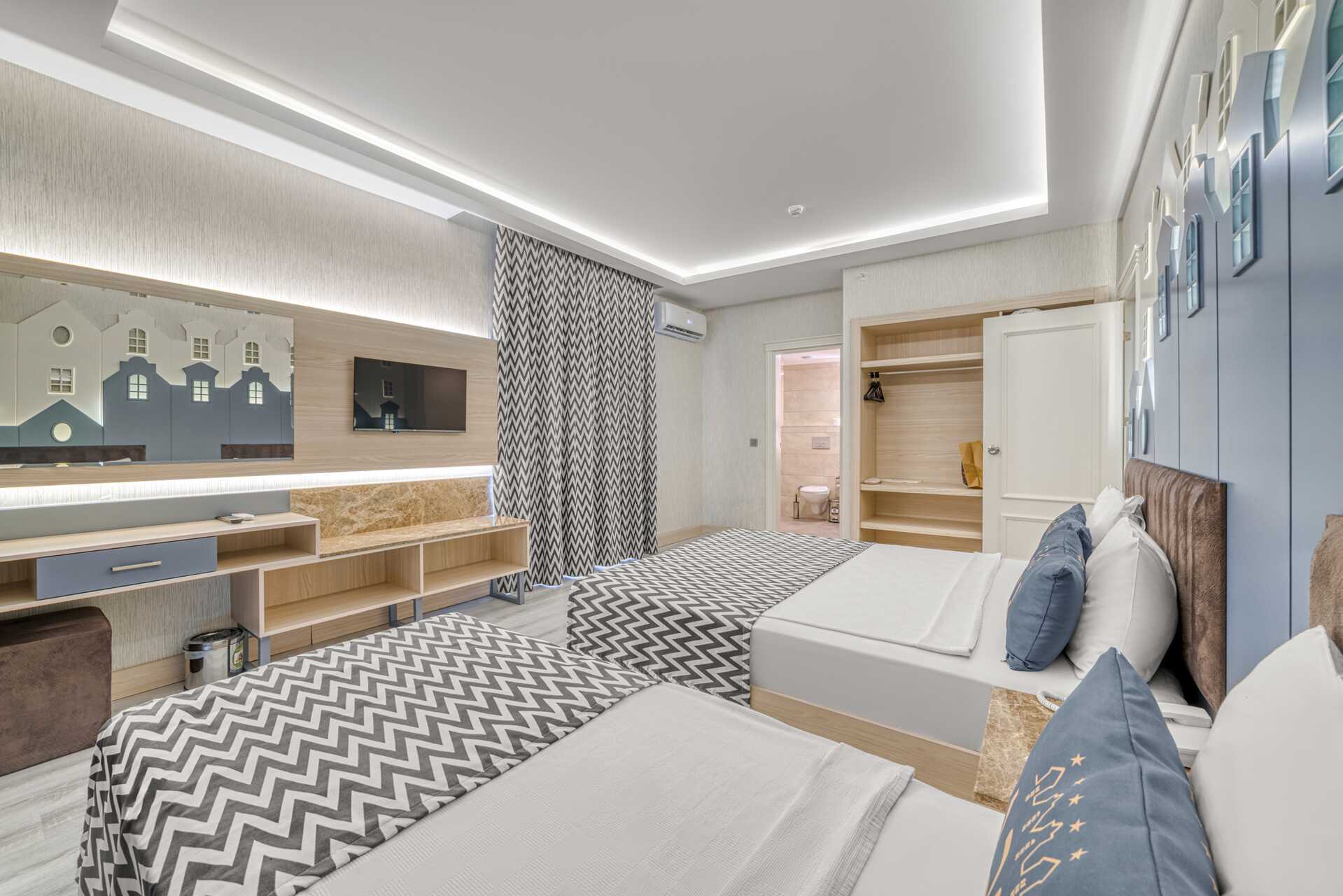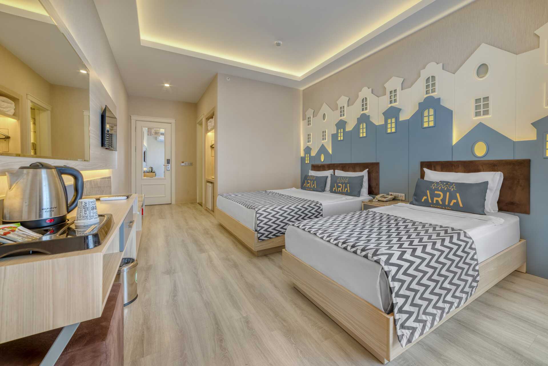Familierom med balkong. To rom med en dobbeltseng og en enkeltseng i hvert rom. Wifi, luftkondisjonering og safe inkludert. Minibaren fylles opp med brus og vann daglig. Vannkoker samt kaffe og te. TV. Tøfler. Hårføner. To bad med dusj og wc. Rengjøring 7 ggr/uke.