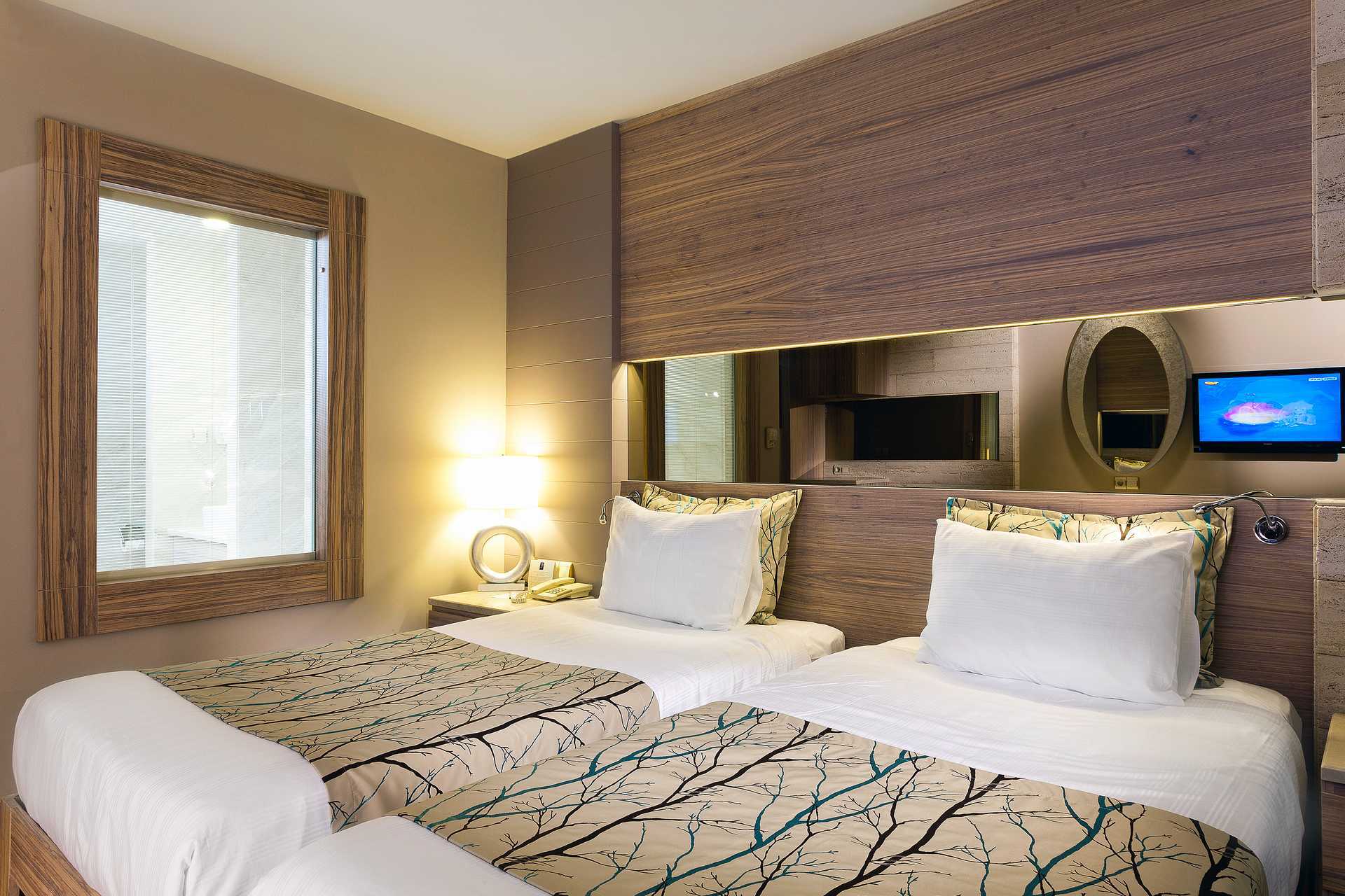 Dobbeltrom med balkong, noen med havutsikt og noen med begrenset havutsikt. To enkeltsenger. Mulig med ekstrasenger i sovesofa. Depositum, wifi og sentralstyrt luftkondisjonering (av/på til forskjellige tider avhengig av været) er inkludert. Minibar. Vannkoker samt kaffe og te. TV. Tøfler. Hårføner. Dusj og wc. Rengjøring 7 ggr/uke. Barn under 2 år regnes inn i maksantallet i rommet.
