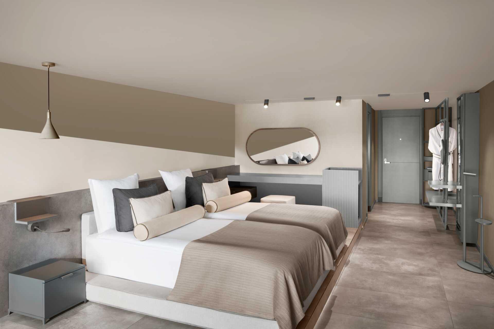 Større familierom med balkong eller markterrasse. To soverom, et med en dobbeltseng og et med to enkeltsenger. Mulig med ekstraseng i sovesofa. Wifi, luftkondisjonering og safe inkludert. Minibar. TV. Hårføner. To bad med dusj og wc. Rengjøring 7 ggr/uke.
