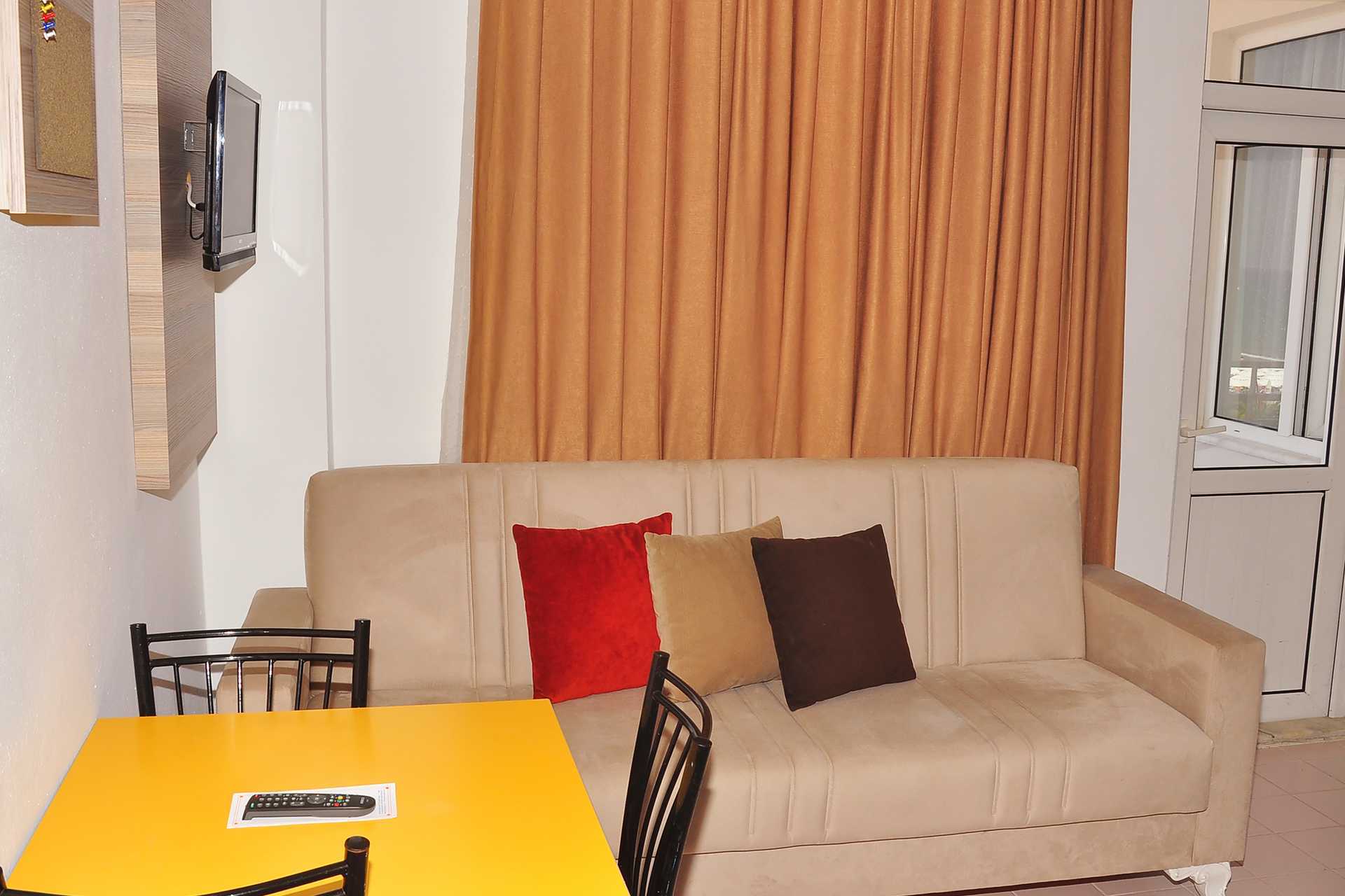 Toromsleilighet med balkong. Et soverom og stue med minikjøkken. En dobbeltseng eller to enkeltsenger. Mulig med ekstrasenger i to oppredbare lenestoler. Minikjøkken med kokeplater, kjøleskap og enkelt kjøkkenutstyr. Luftkondisjonering mot avgift. I noen leiligheter er det luftkondisjonering på soverommet, i andre bare i stuen. Hårføner. Baderom med dusj og wc. Rengjøring 7 ggr/uke.