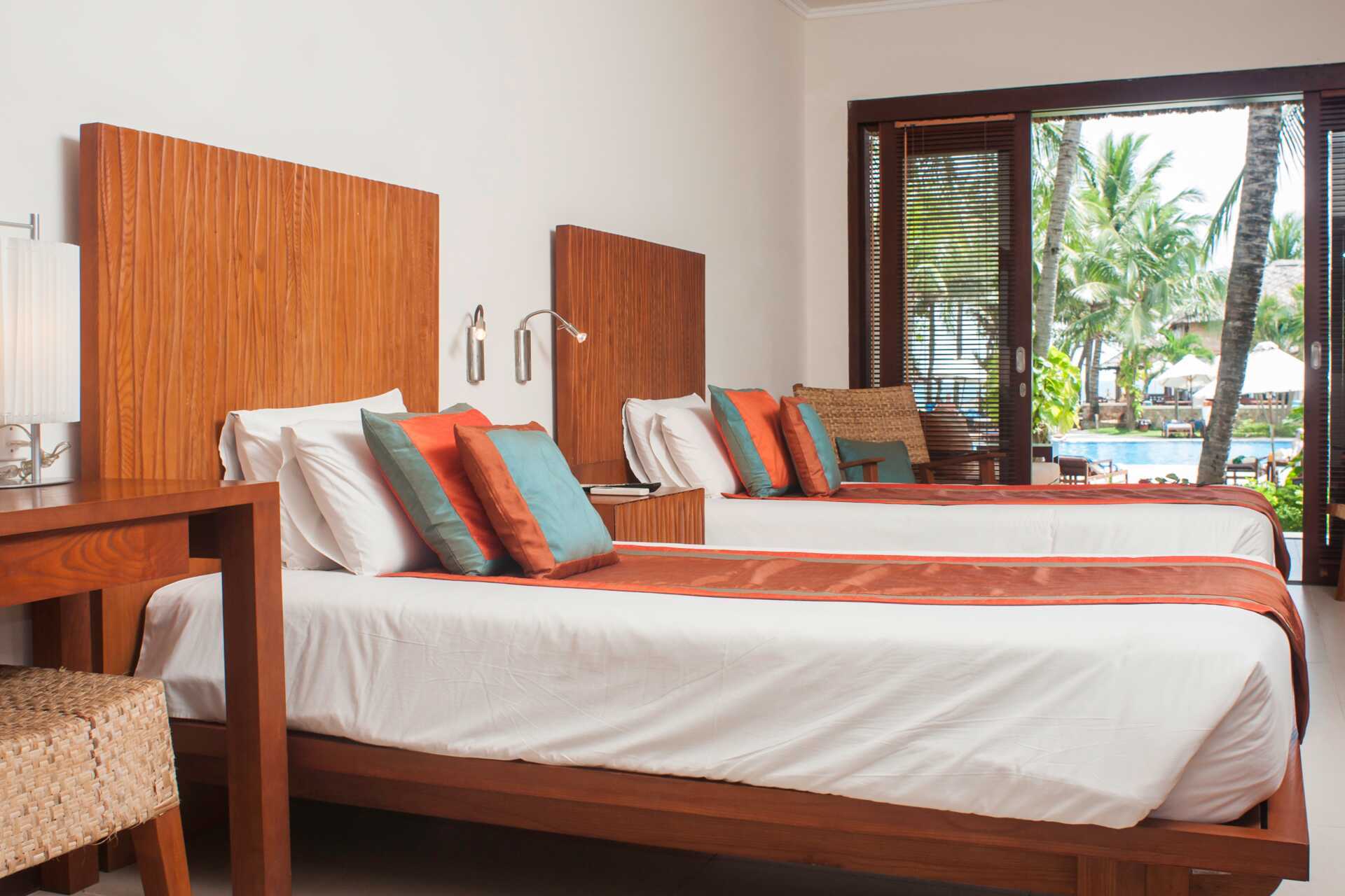 Dobbeltrom i bungalow med markterrasse, noen med havutsikt eller utsikt mot hagen. En dobbeltseng eller to enkeltsenger. Mulig med ekstraseng i feltseng. Wifi, safe og luftkondisjonering inkludert. Minibar med to småflasker vann inkludert hver dag. Vannkoker samt kaffe og te. TV. Badekåper og tøfler. Dusj og wc, hårføner. Rengjøring 7 ggr/uke.